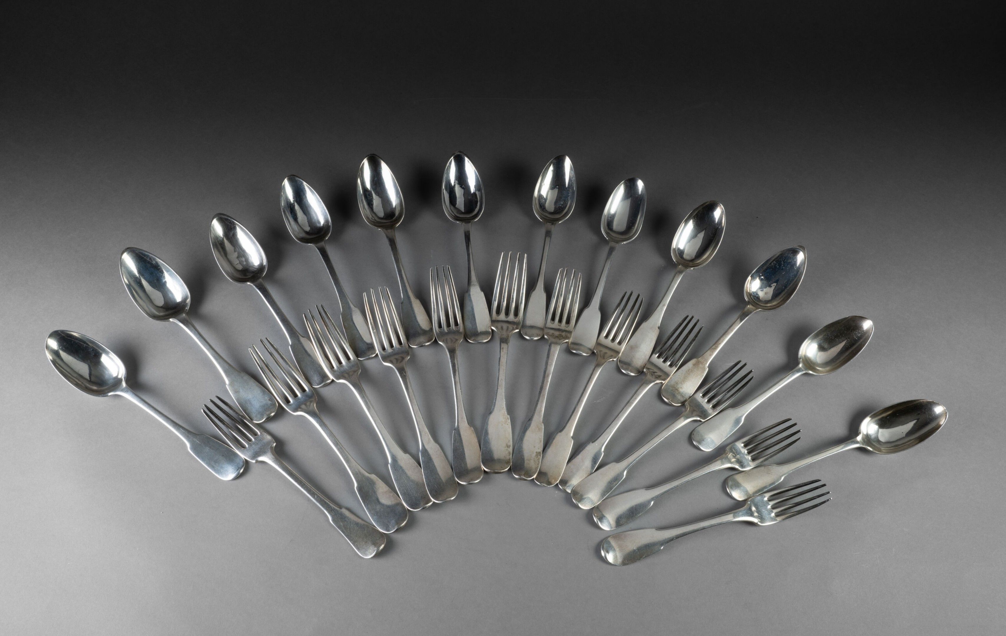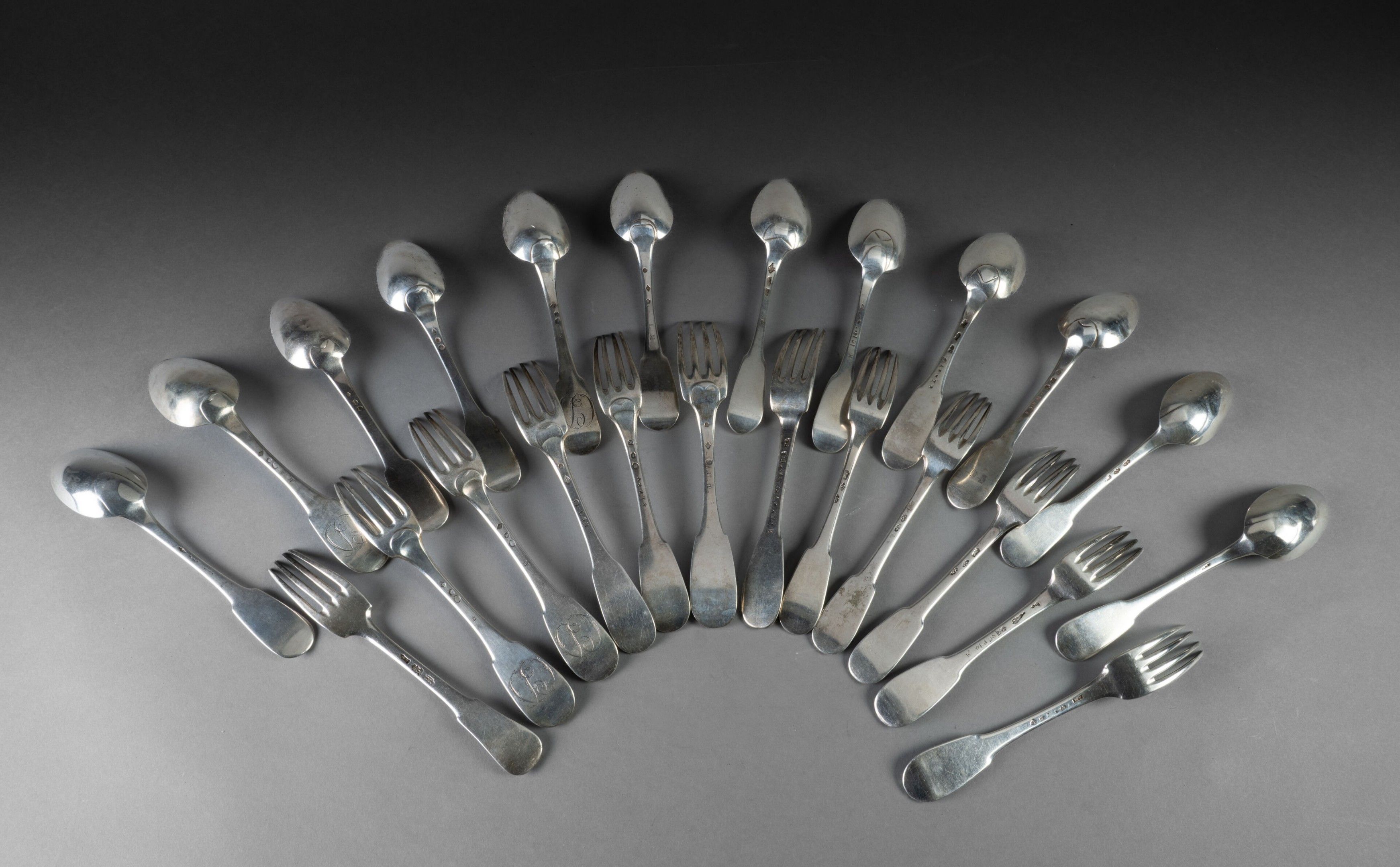 A set of plain silver flatware comprising: seven forks and six spoons 18th century; five forks and six spoons Empire & Restoration style