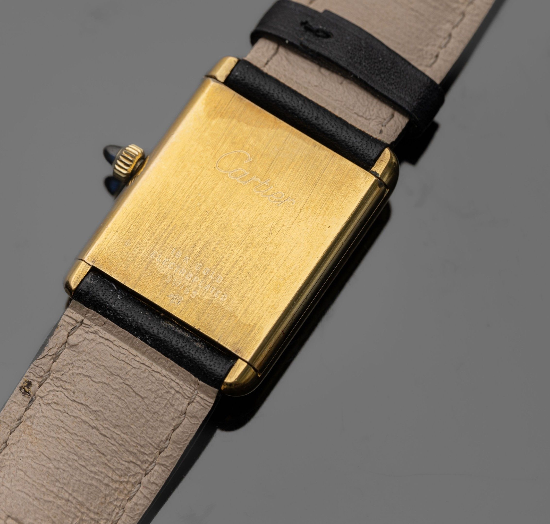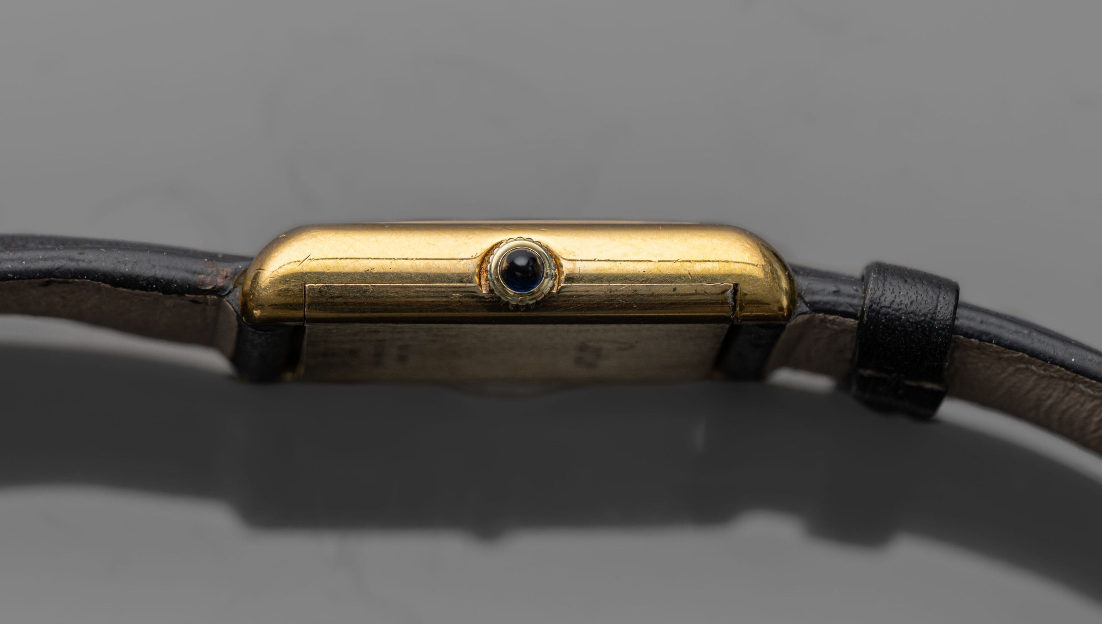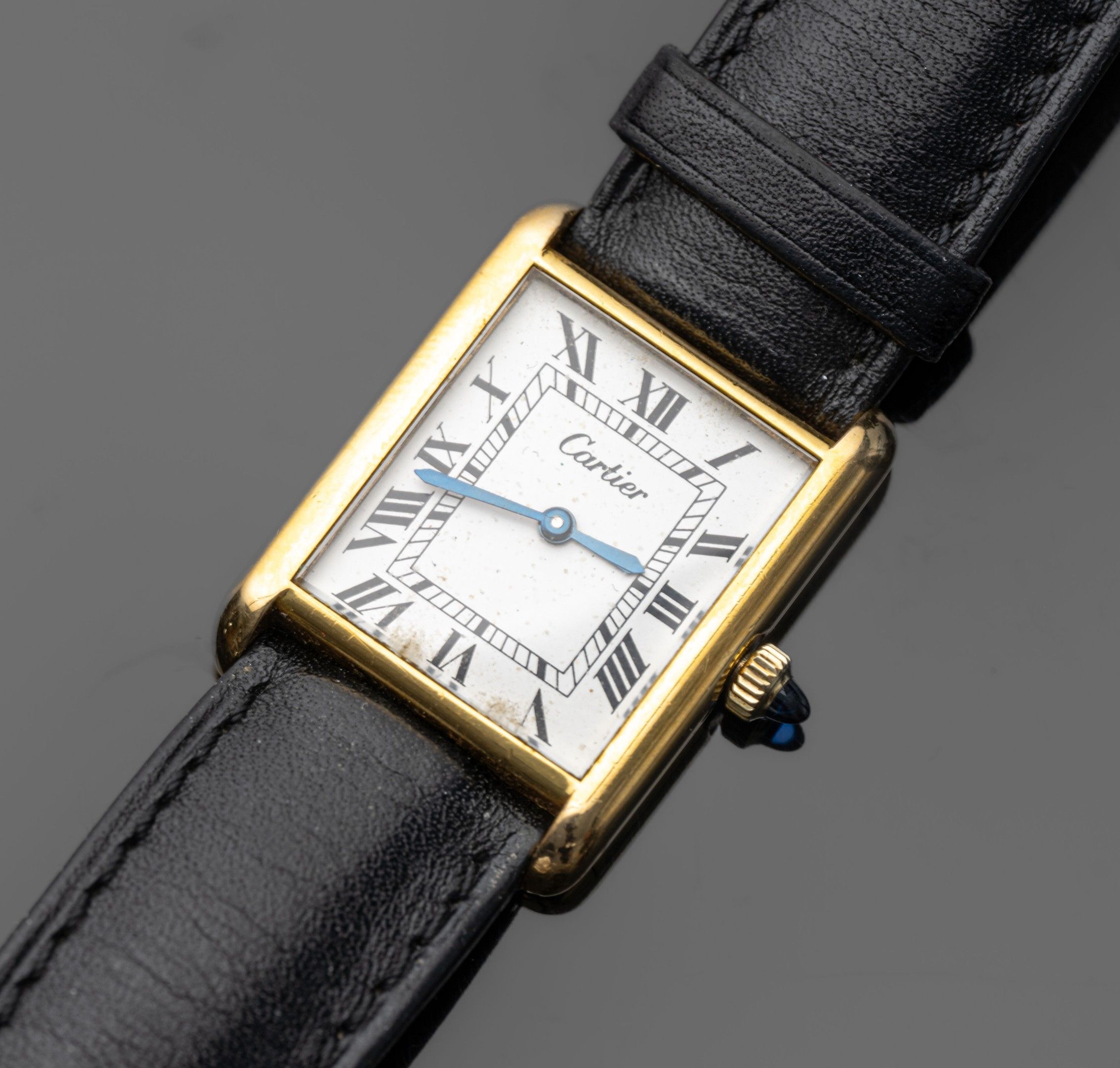 Gold-plated metal watch, "Tank" (pre-must) type, rectangular dial with white background (dust and slight dirt), black Roman numerals, hand-wound mechanical movement (base calibre ETA 2512: signed). The back is signed, the winding crown decorated with a blue stone cabochon.