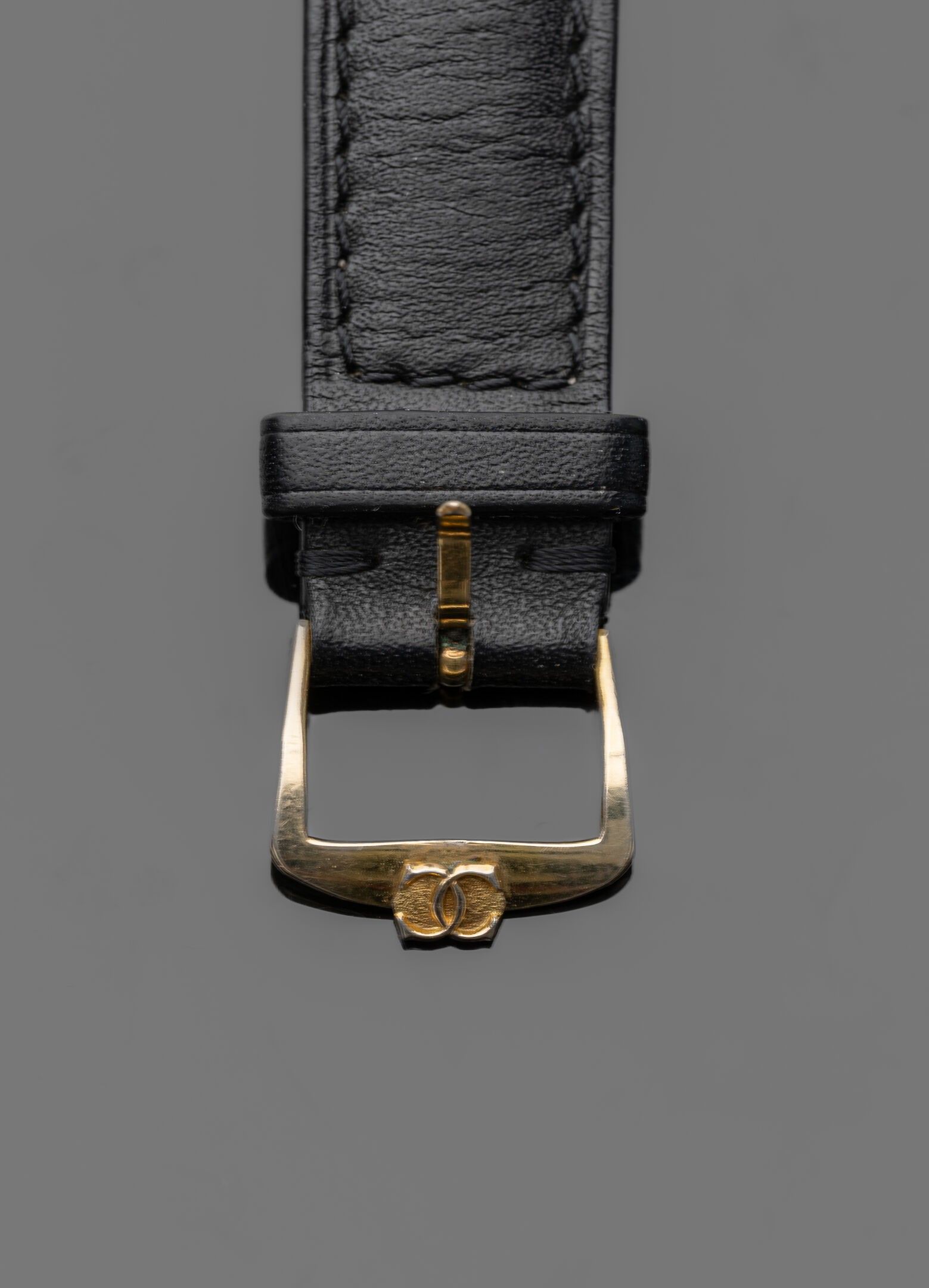 Black leather strap with gold-plated metal buckle, with later attachments