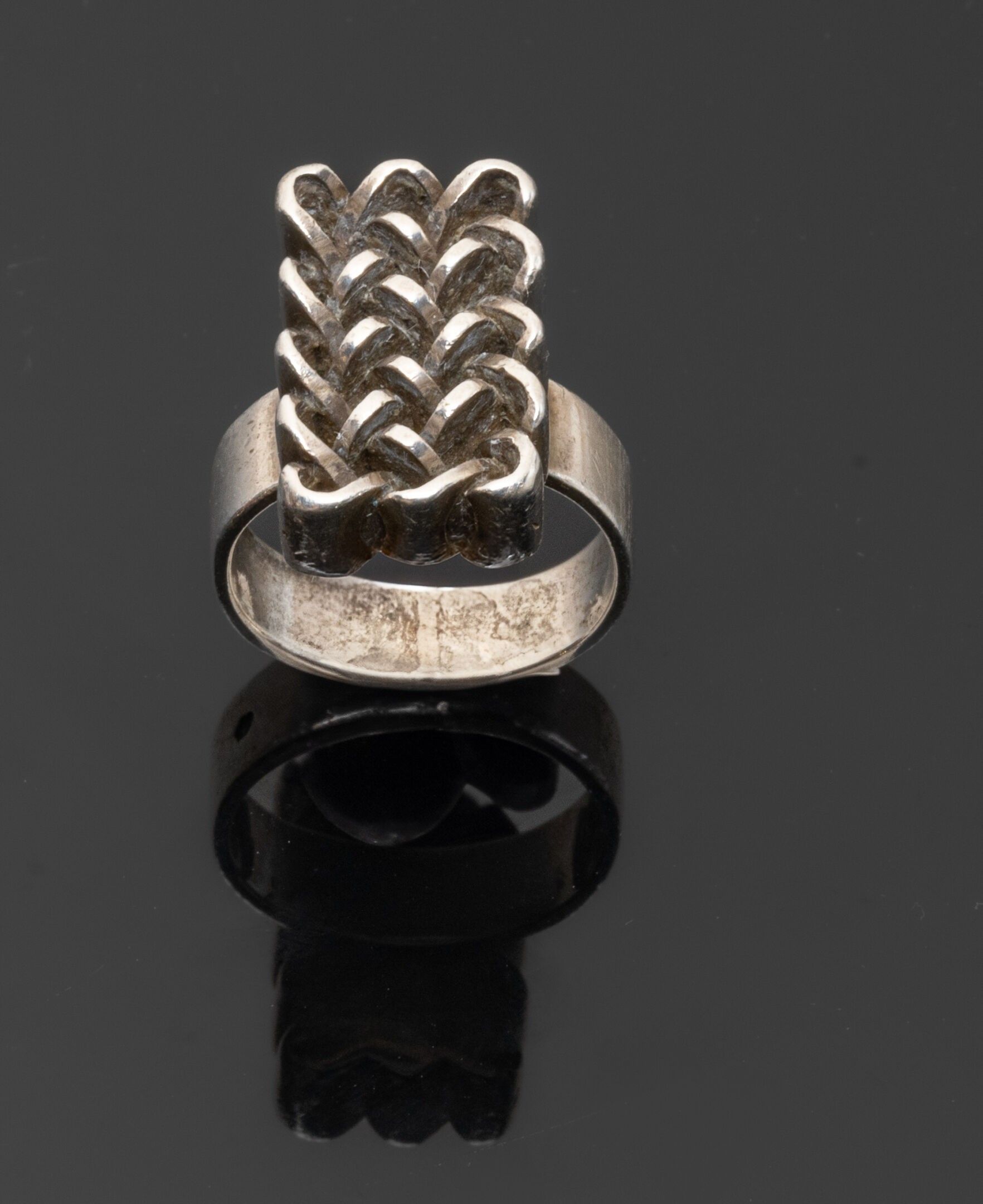 Ring in silver (800°/°°), the rectangular plate scalloped with motifs showing braiding