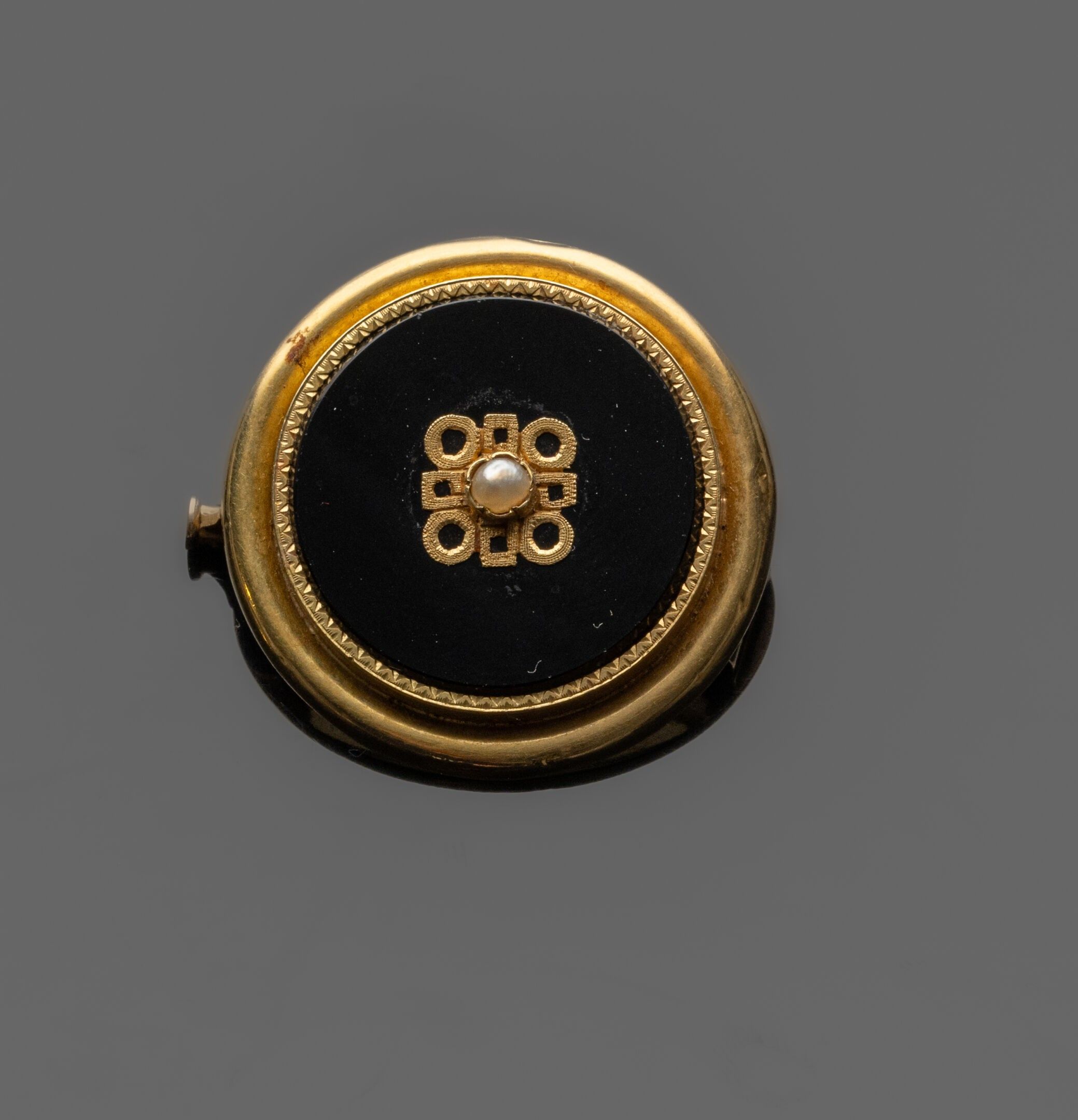 Round brooch in 18K (750°/°°) yellow gold, centred on an onyx plaque pierced with a geometric motif adorned with a half-pearl. Small dents around the edges