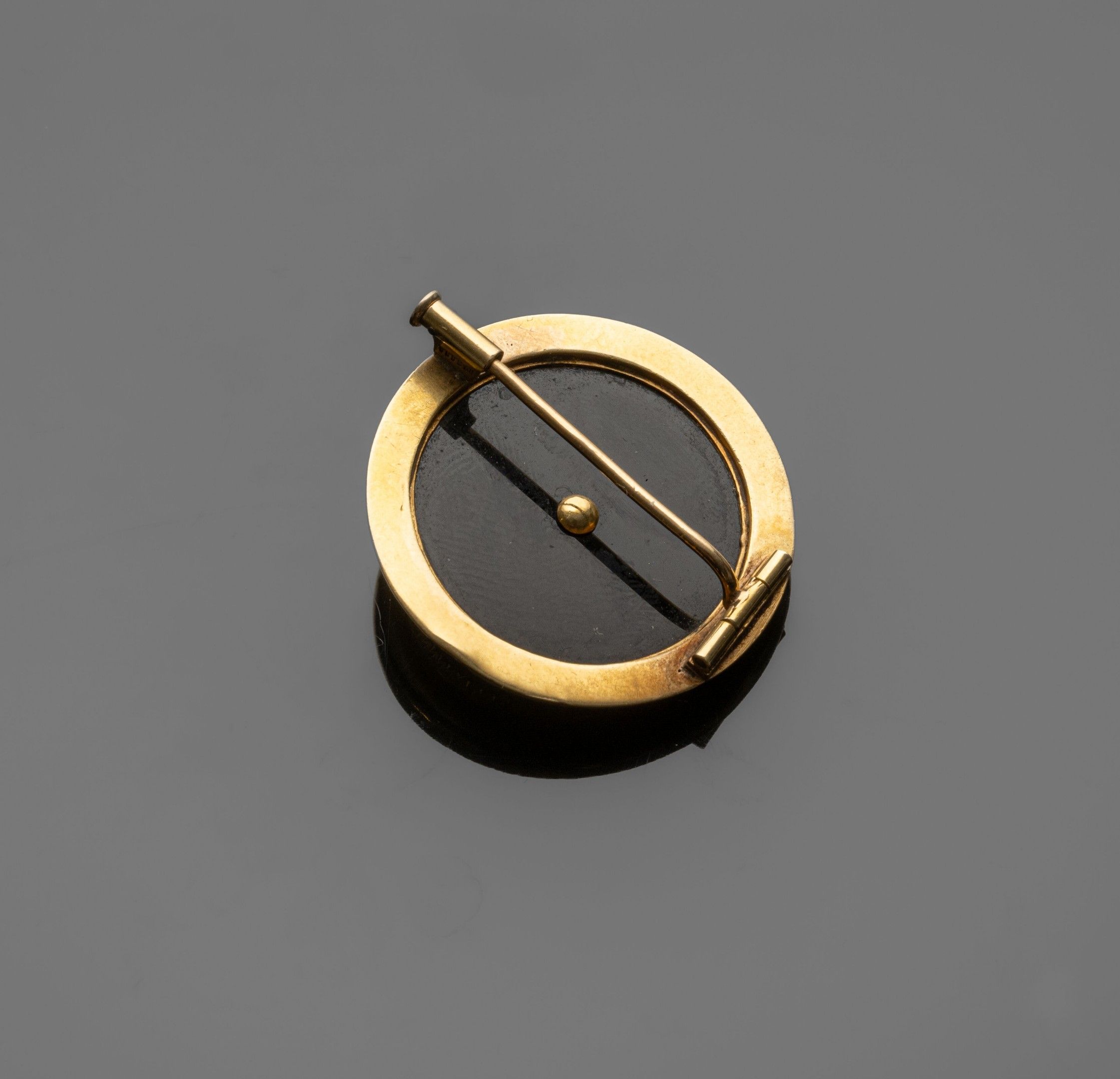 Round brooch in 18K (750°/°°) yellow gold, centred on an ony…