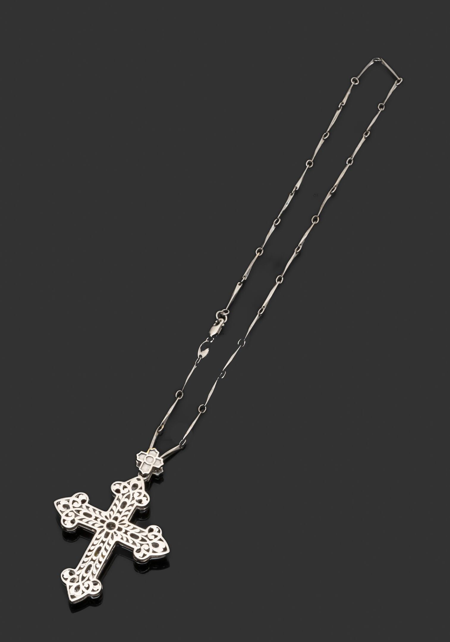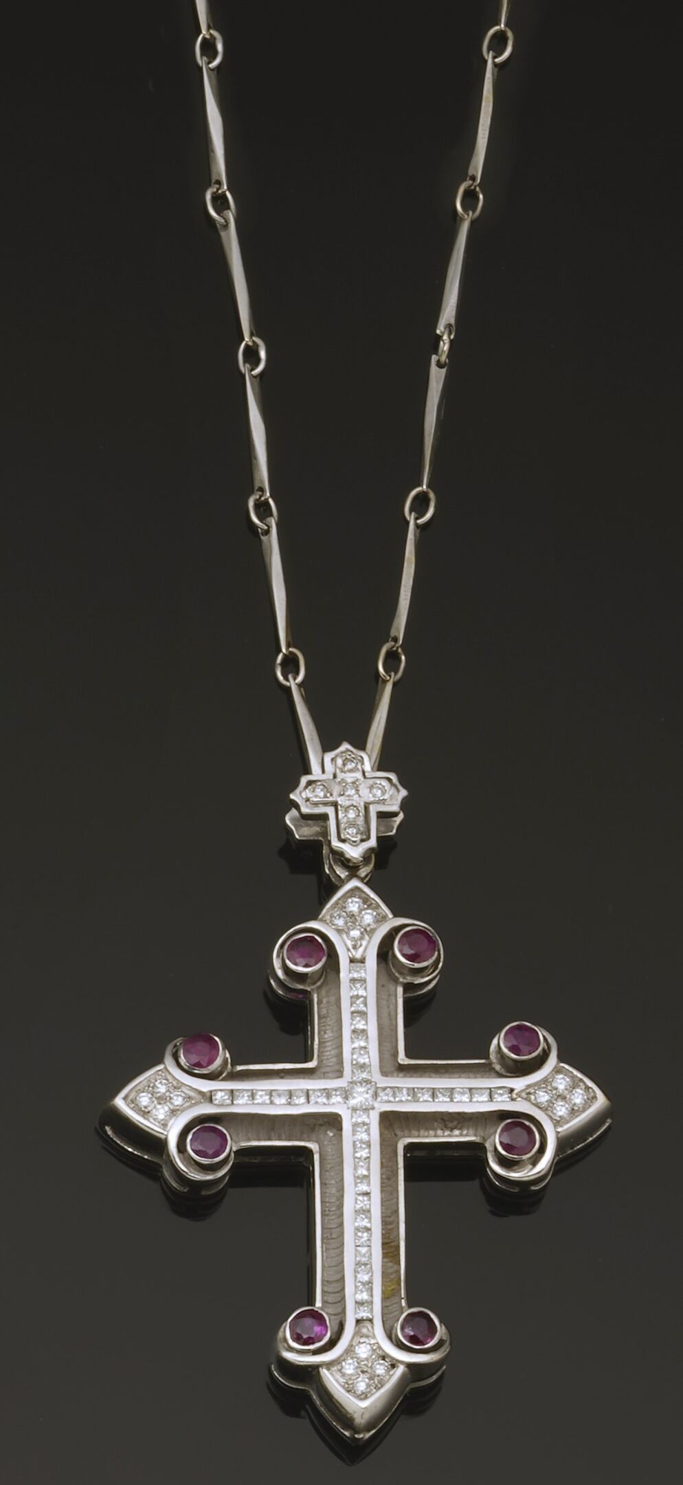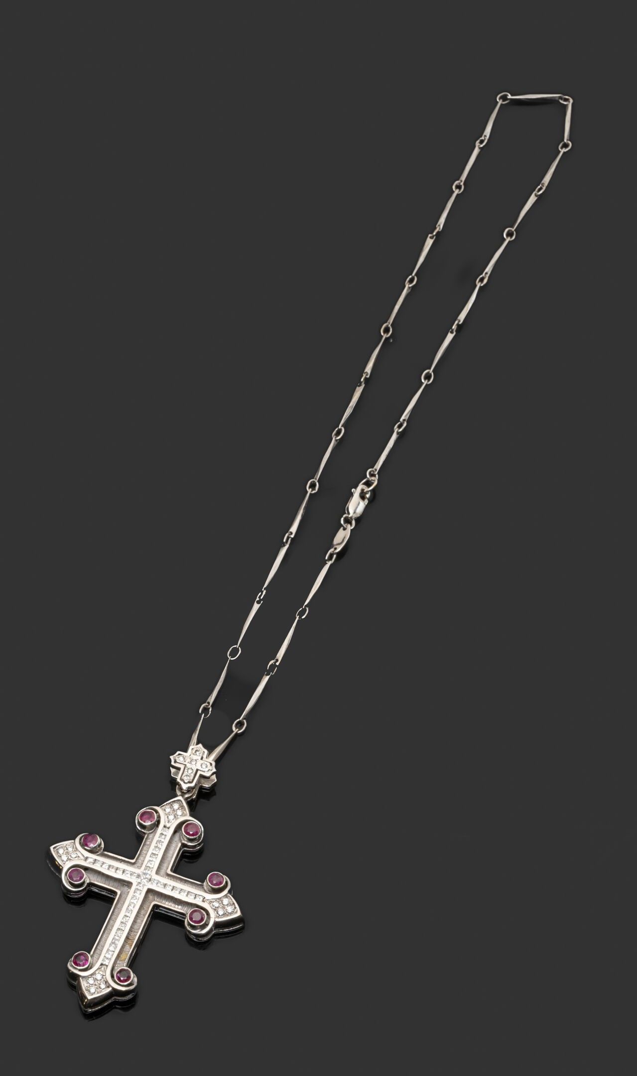 Cross" pendant in rhodium-plated 18K (750°/°°) white gold, centred on a line of princess-cut diamonds in rail-setting, the ends of the branches forming stylised fleur-de-lys set with brilliant-cut diamonds and round rubies (slightly worn) in closed-setting (size : 59 x 46 mm approx.), the clasp forming a Latin cross set with brilliants; it is held by an 18K (750°/°°) white gold chain with facetted baton links alternating with oval mesh, length: 45.5 cm approx.