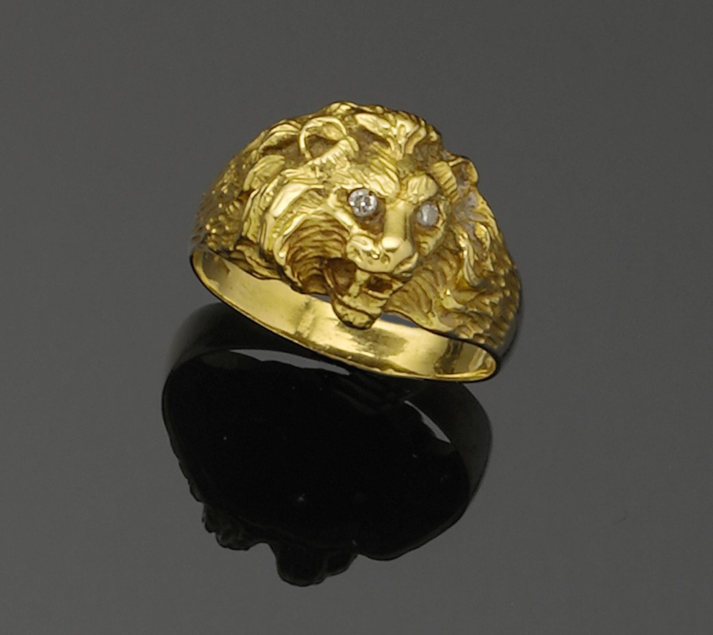 Ring in 18K (750°/°°) yellow gold featuring a lion's head, the eyes set with brilliant-cut diamonds