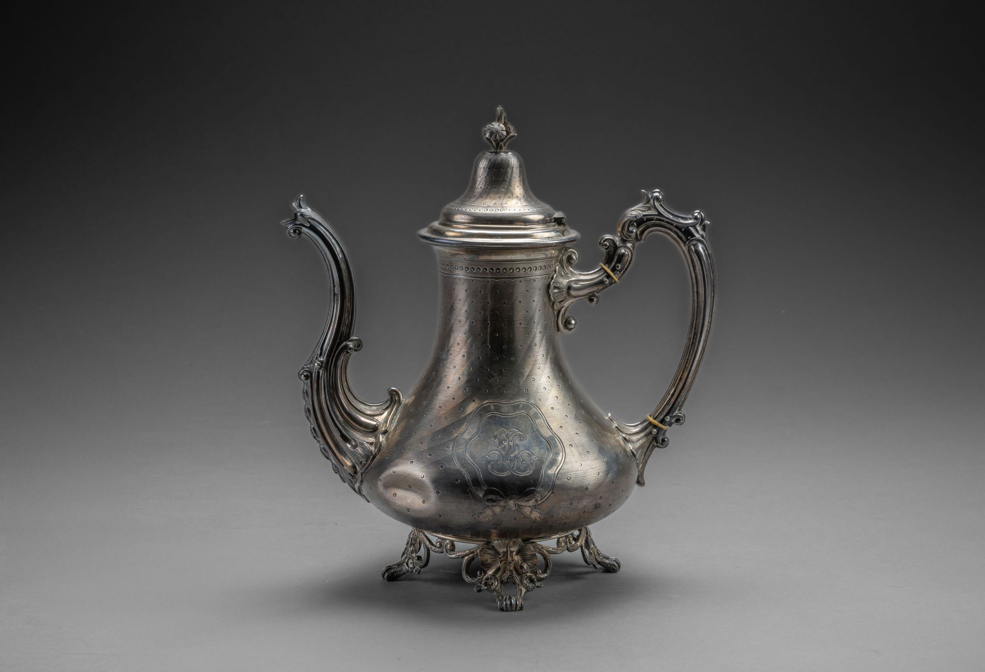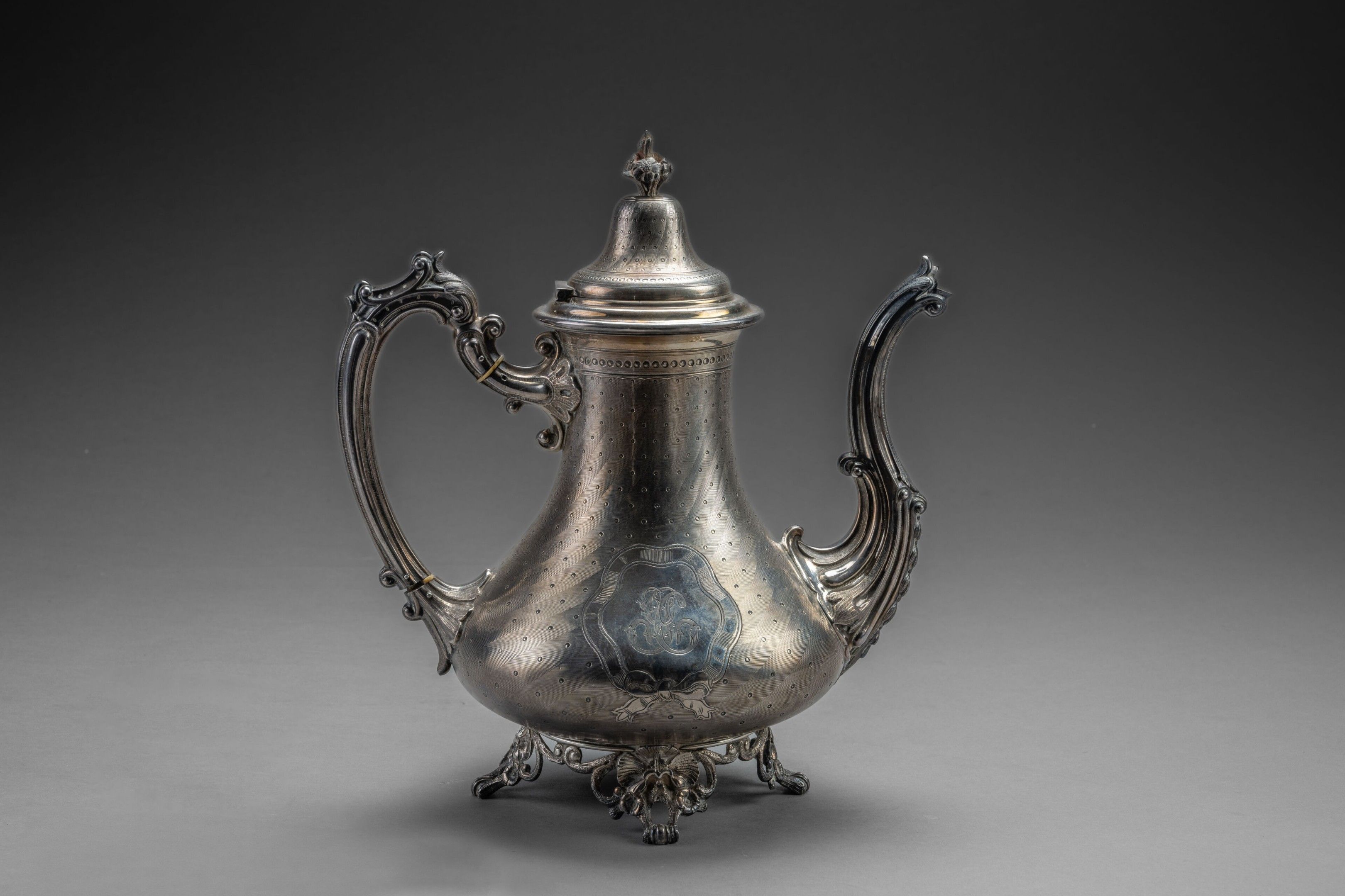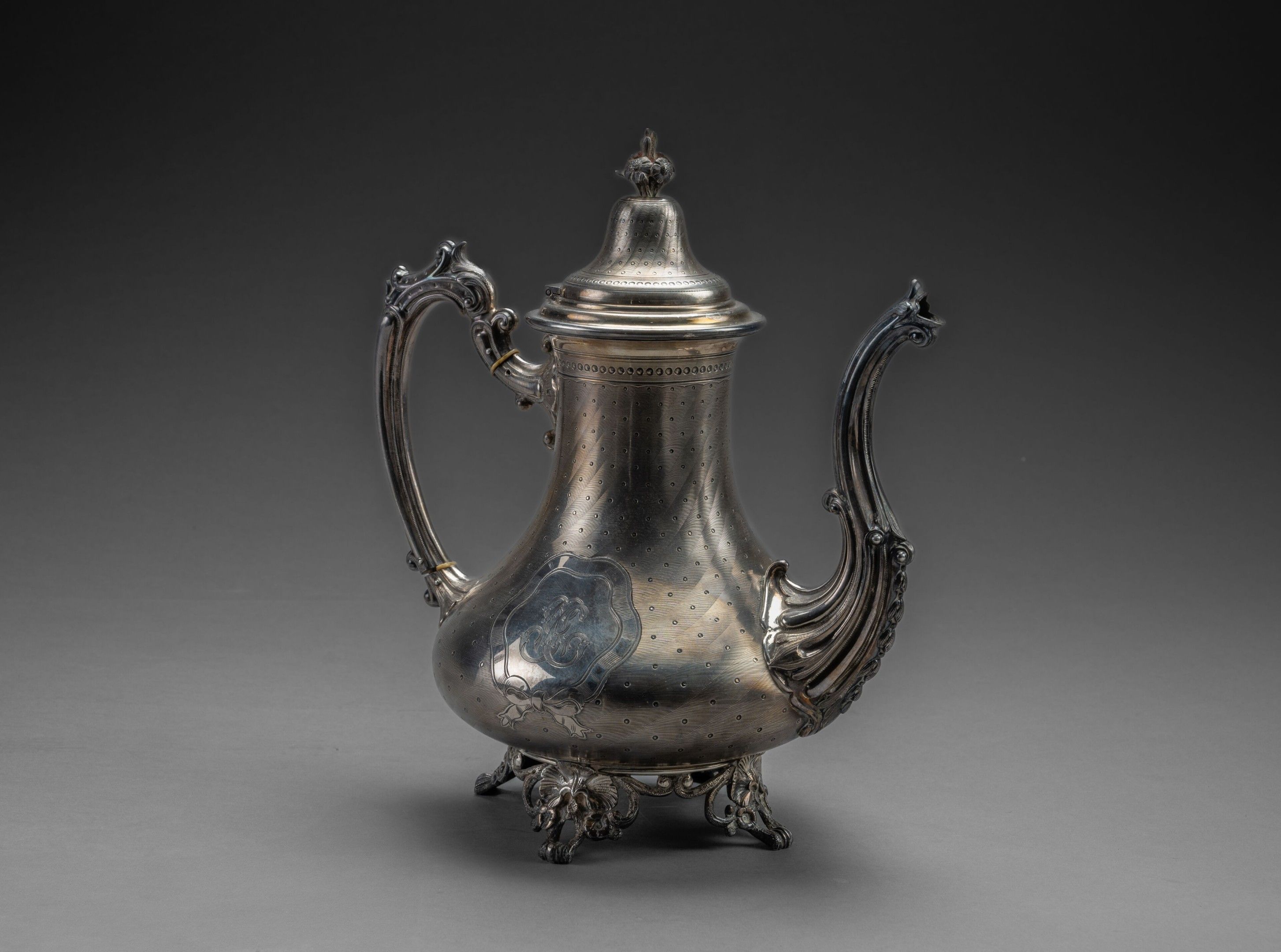 A silver pourer with guilloché decoration of simulated twisted ribs and a semiset of pearls adorned with two poly-lobed cartouches of knotted ribbons. The pourer has a small convex ribbed spout alternating with foliate canals and an acanthus base, a scrolled handle with a convex foliate rib, openwork feet with foliate scrolls and attachments; flowers and foliate scrolls.