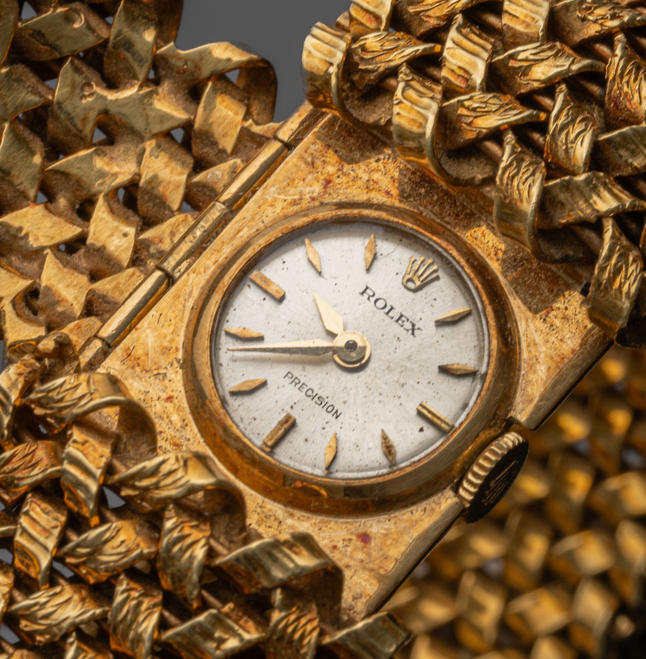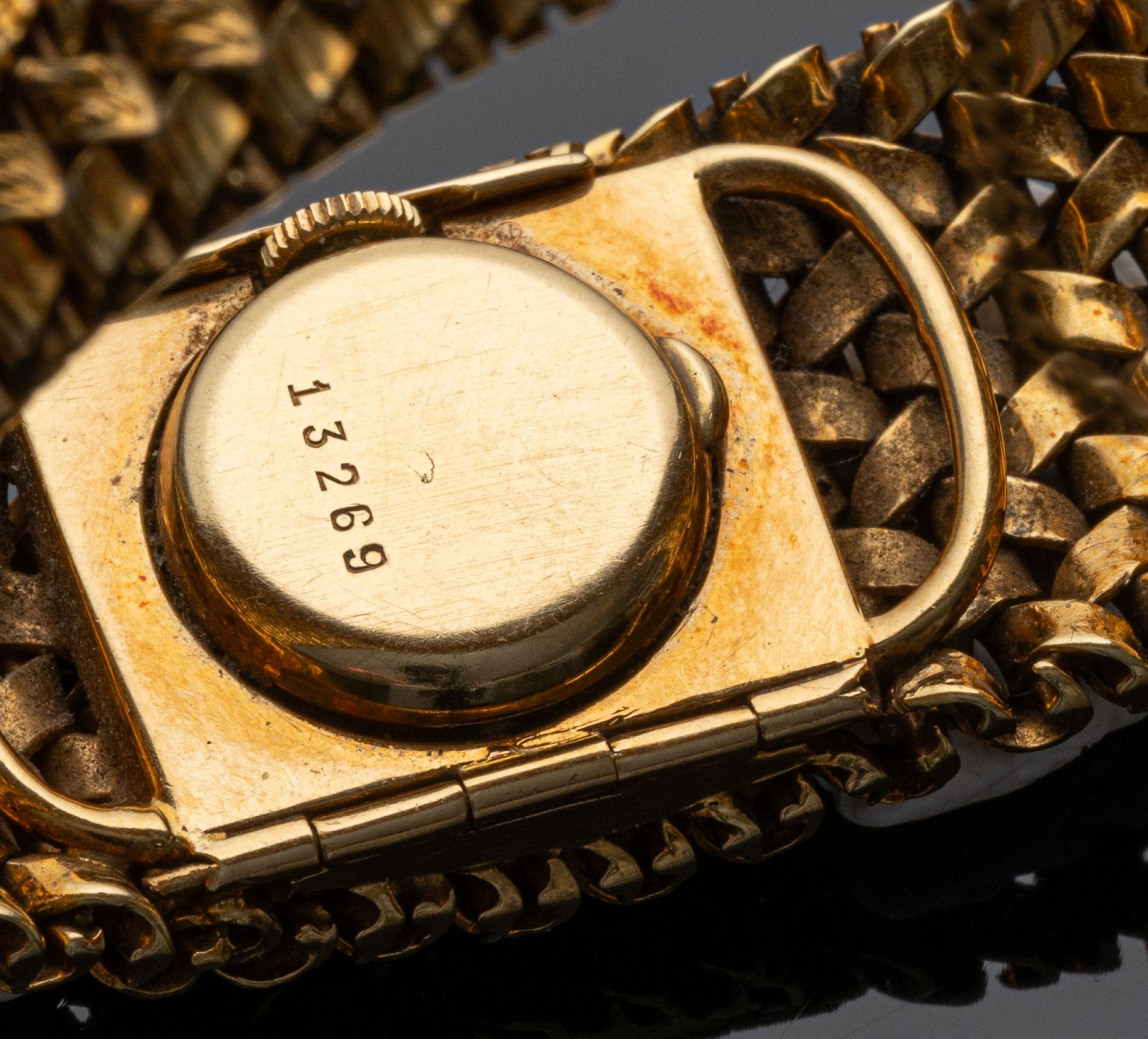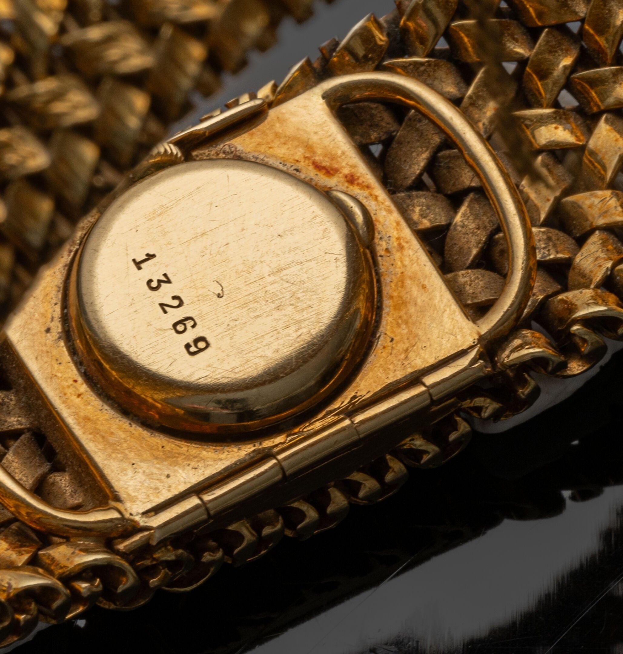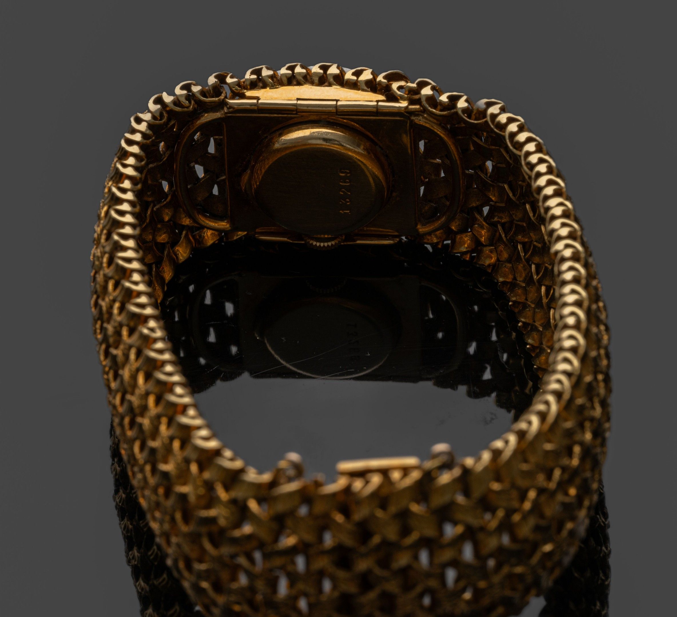 Wristwatch in 18K (750°/°°) yellow gold with invisible cover, "Précision" collection, round dial with radiant silvered background (pitting and dusting), applied gold baton hour-markers and rhombuses, hand-wound mechanical movement (calibre 1401, signed: does not work, traces of rust, winding crown detached (needs re-fastening)). The back is numbered. The ribbon bracelet in 18K (750°/°°) yellow gold with textured coiled mesh. With safety chain.
