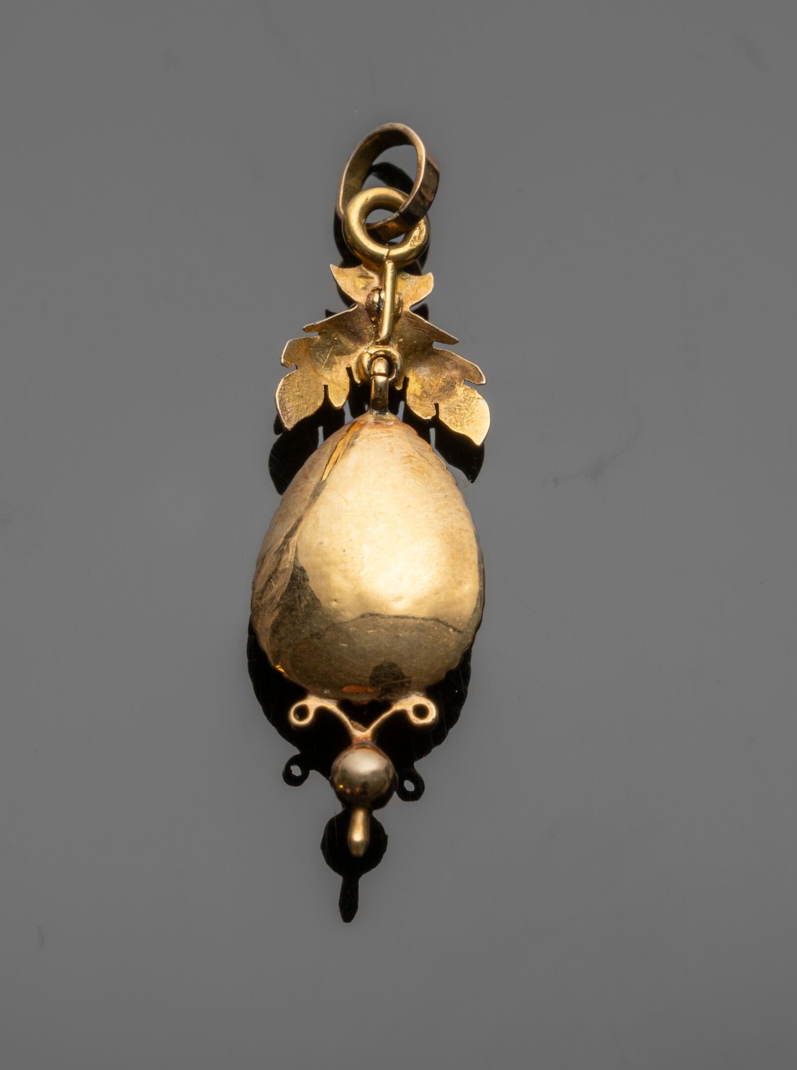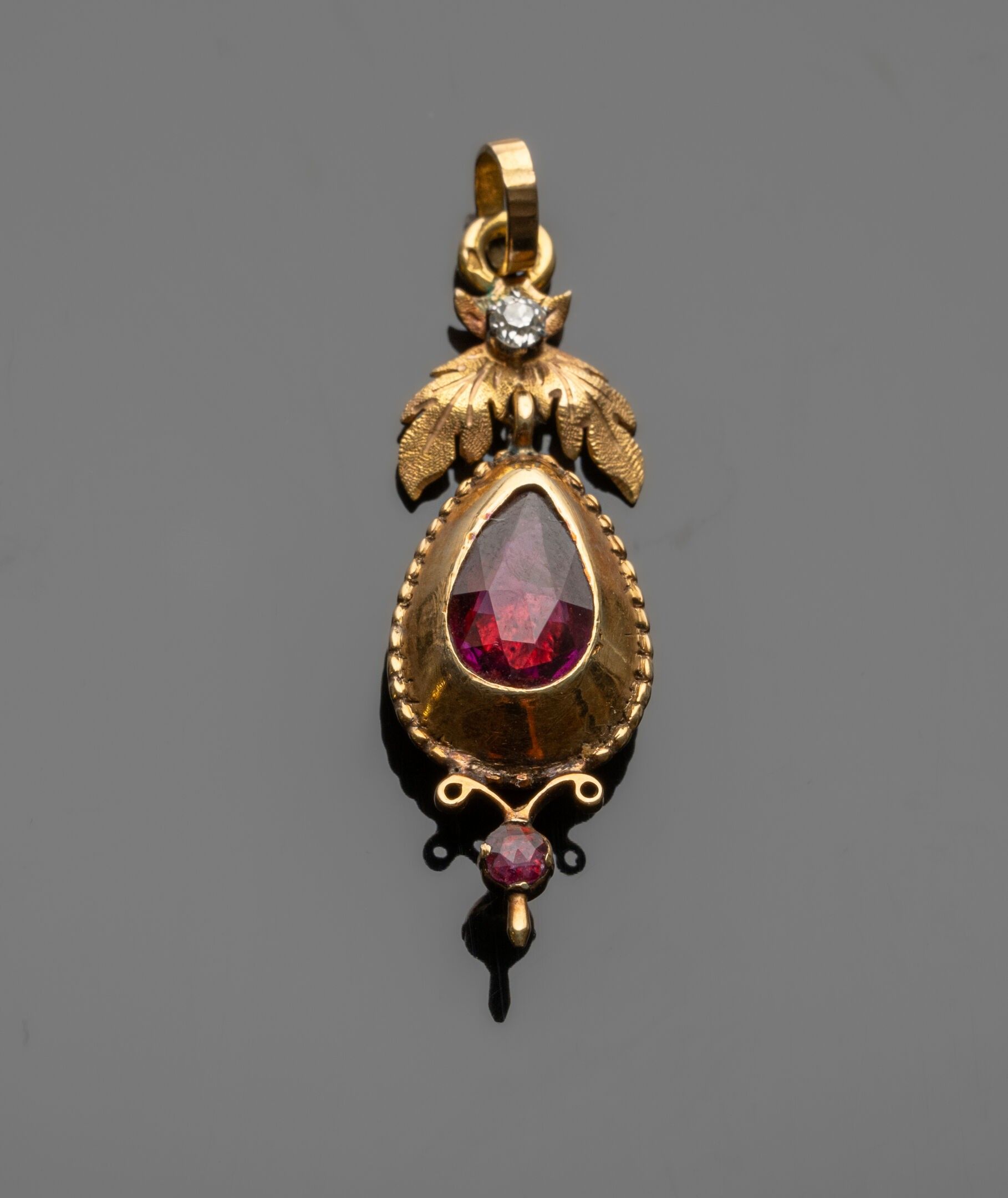18K (750°/°°) yellow gold articulated pendant decorated with leaves, it is set with an old-cut diamond and dangles a briolette-shaped pear-shaped faceted garnet (small external and internal chip), the background sparkling, surmounting a small round garnet.