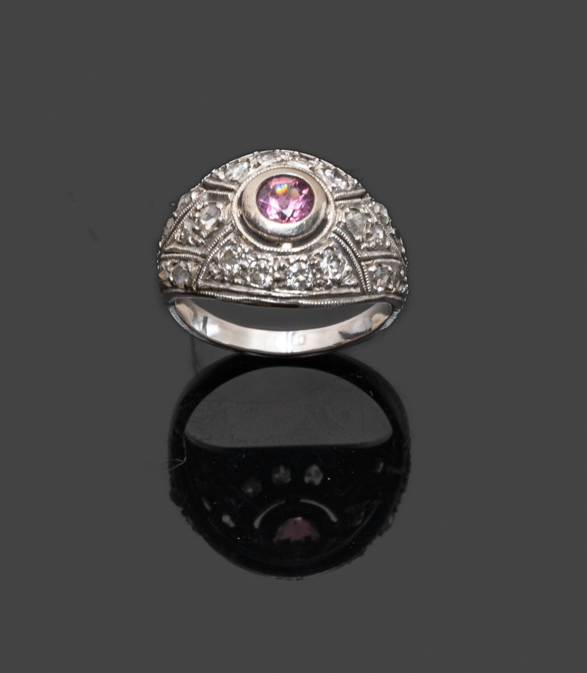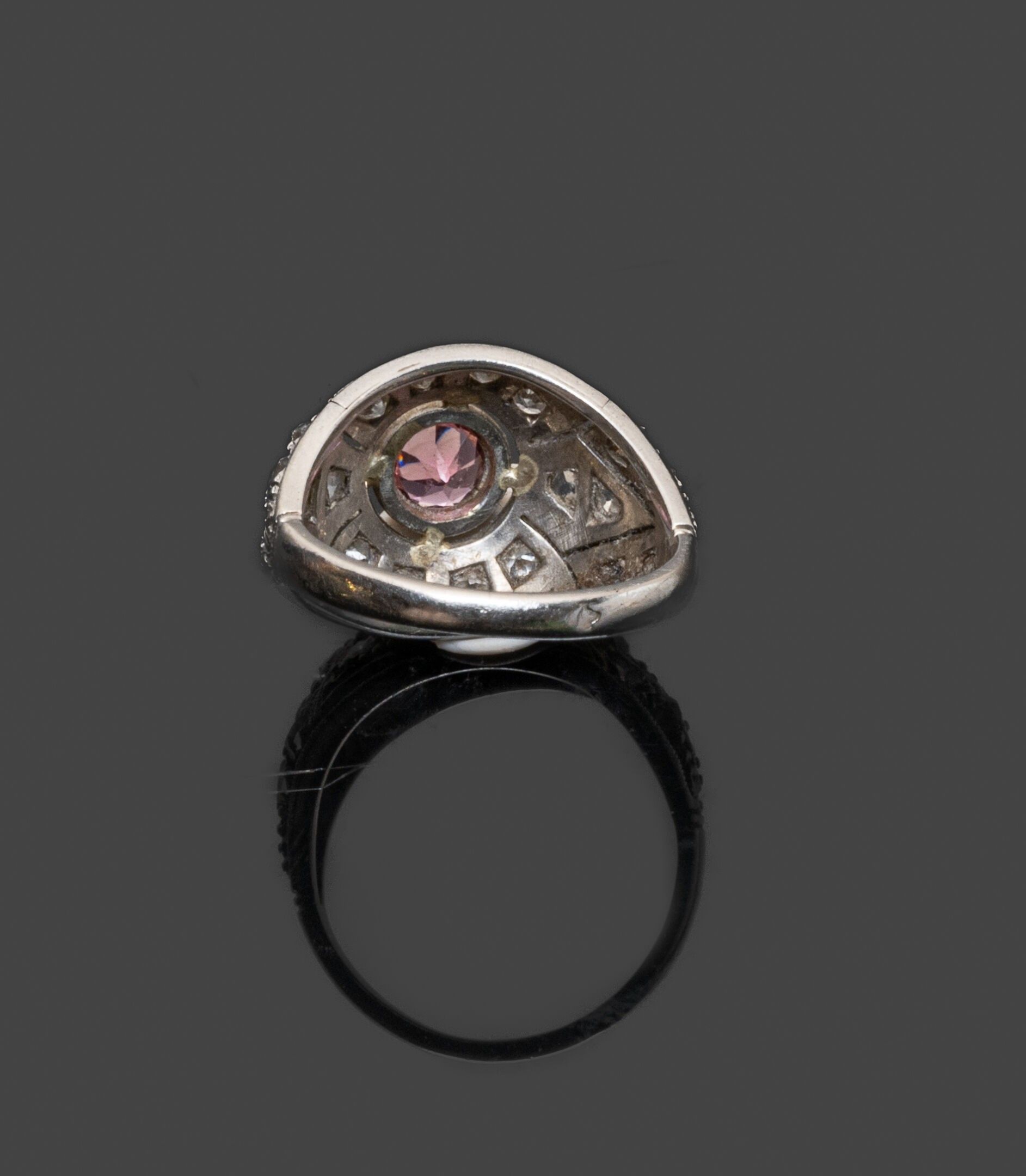 Ring in platinum (850°/°°), the domed central part openworked with geometric designs set with round diamonds cut into crowned roses, it is centred with a round pink tourmaline (slight wear to the edges, later brought back).