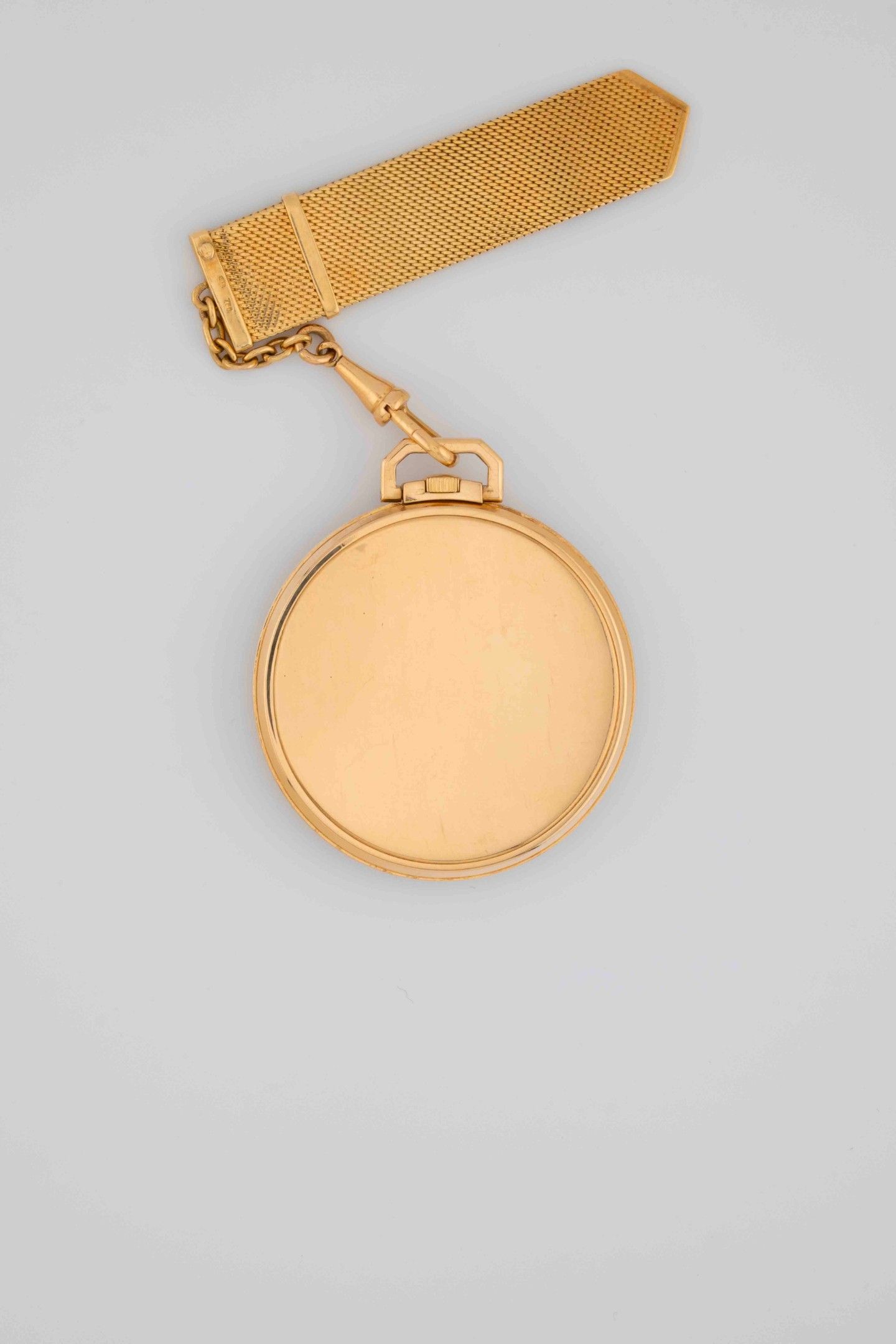 Case: round in 750/1000 yellow gold, smooth bezel, round fluted winding mechanism, clipped back.
