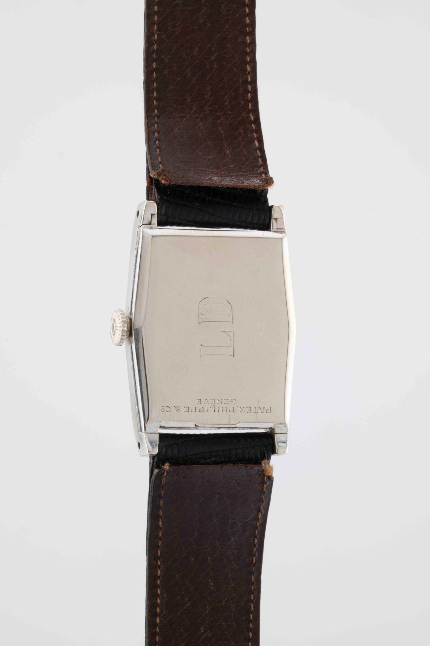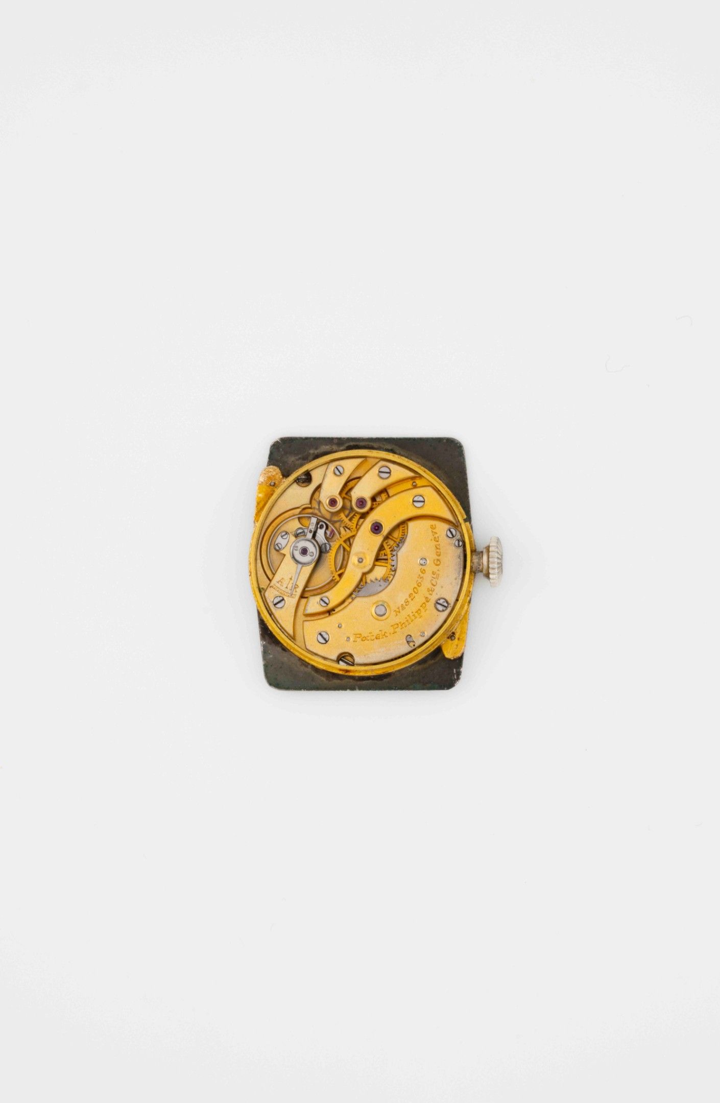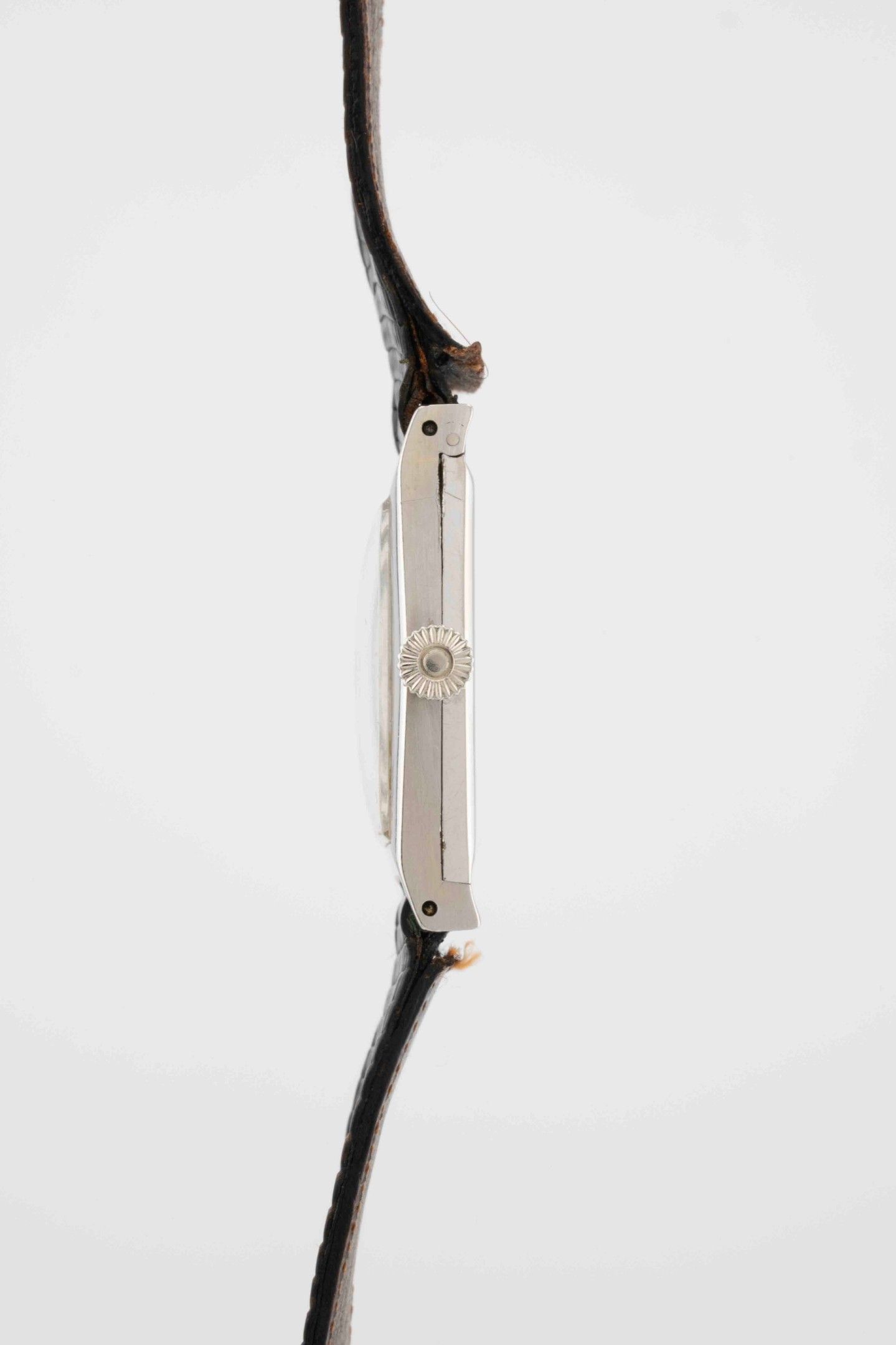 Case: rectangular in 750/1000 white gold, smooth bezel, guiochet winding mechanism, clipped back.