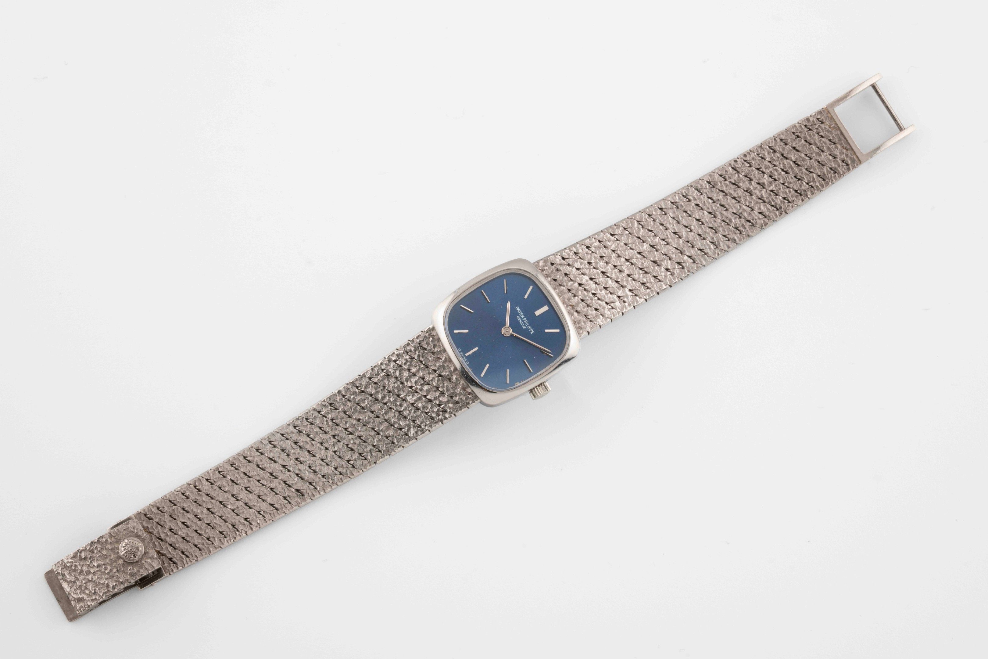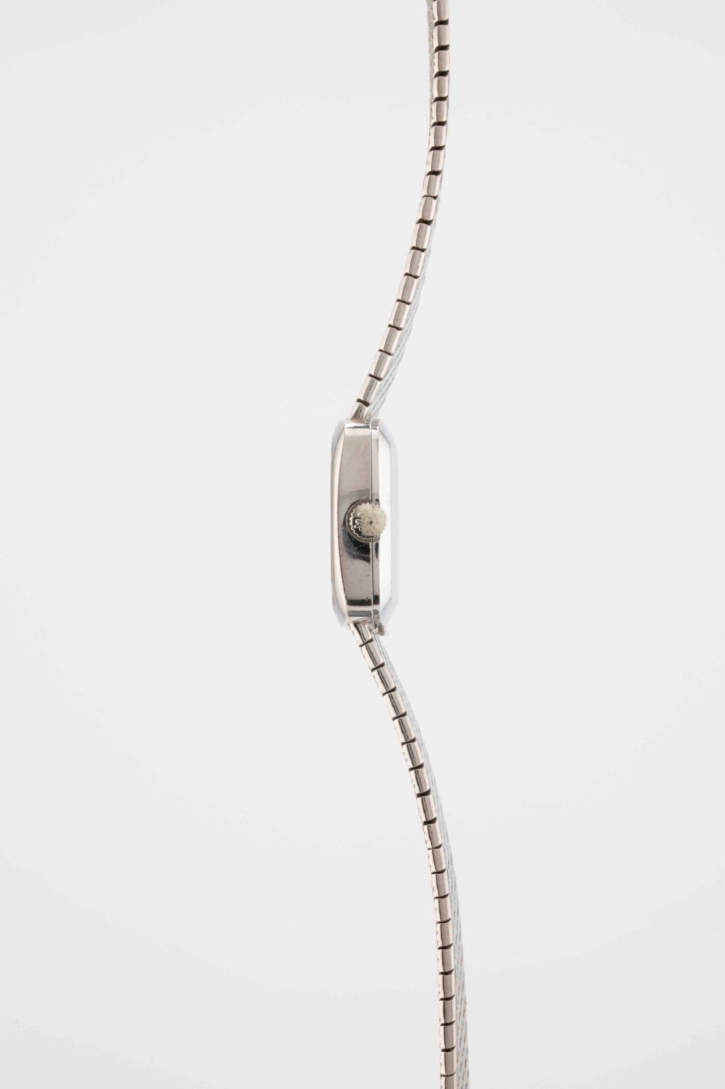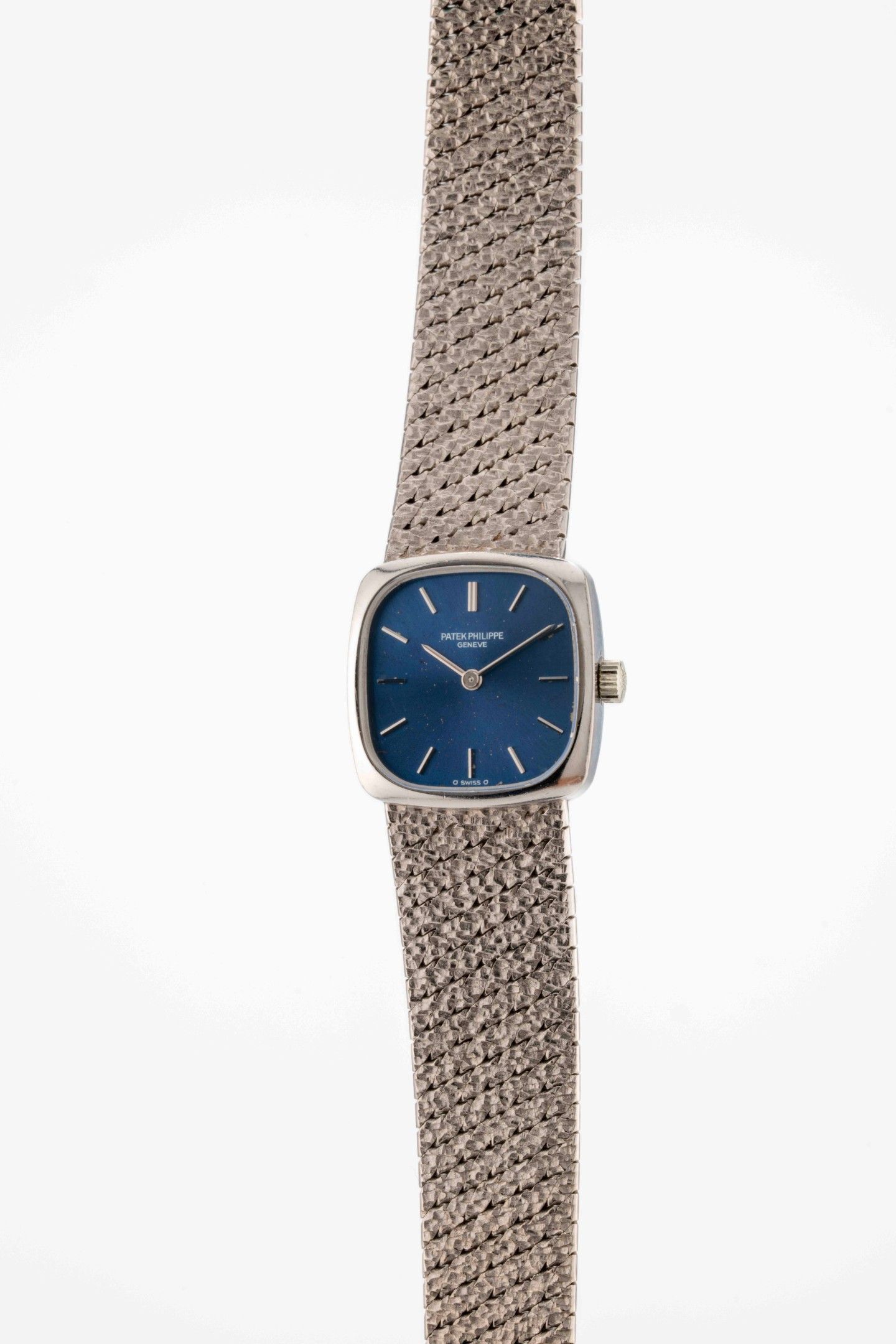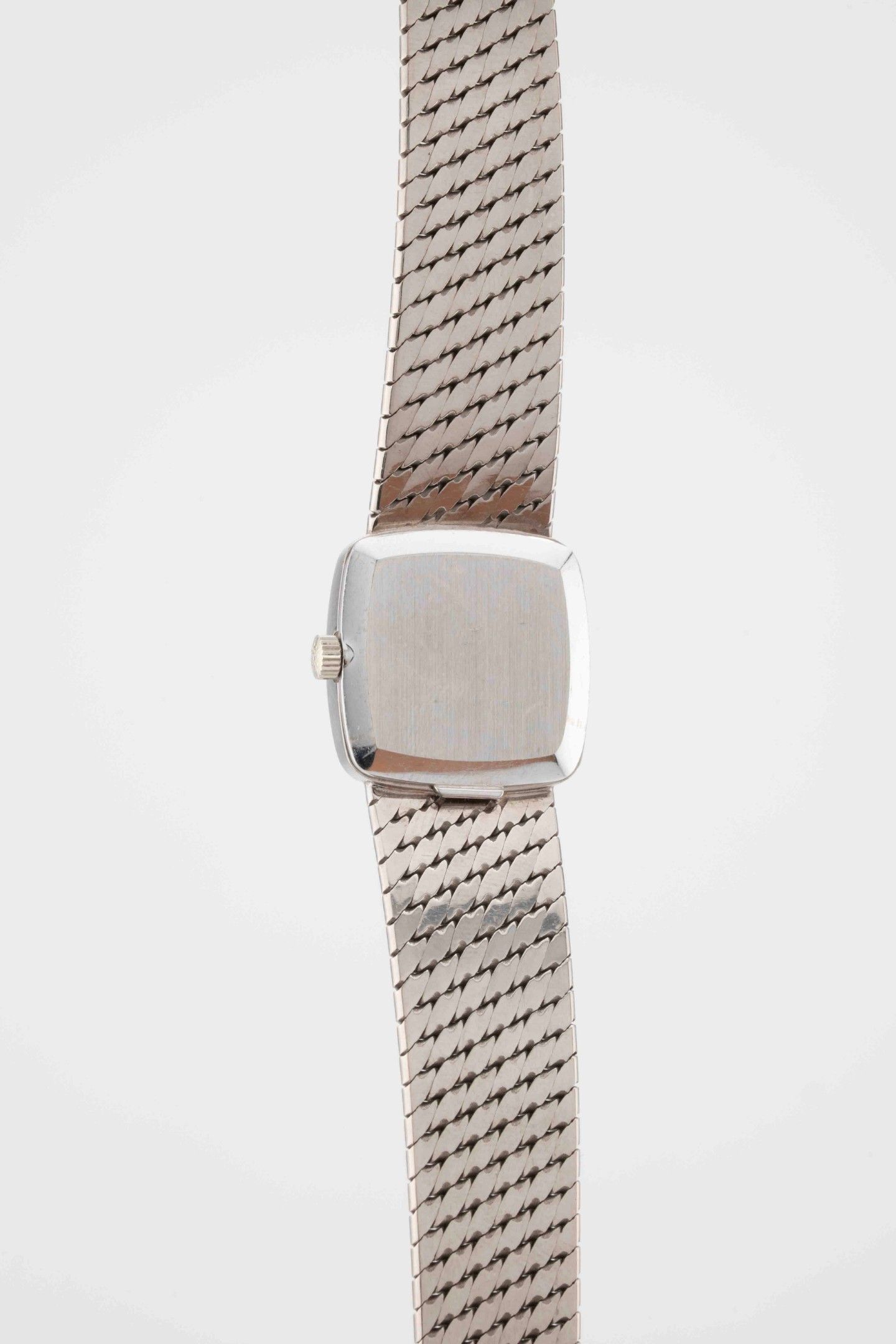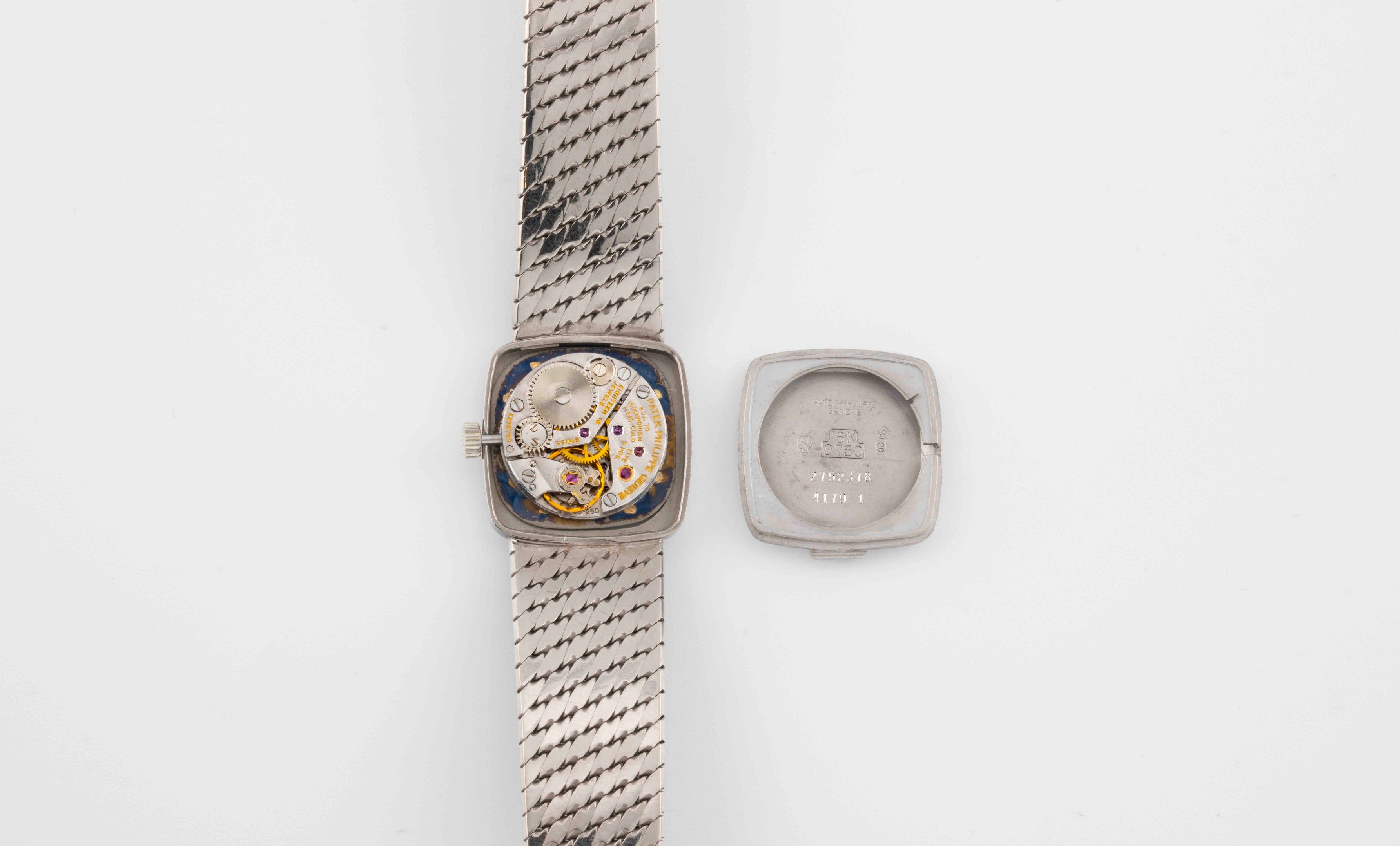 Case: square, slightly cushion-shaped in 750/1000 white gold, smooth bezel, clipped back. Winding mechanism signed with the Calatrava cross.