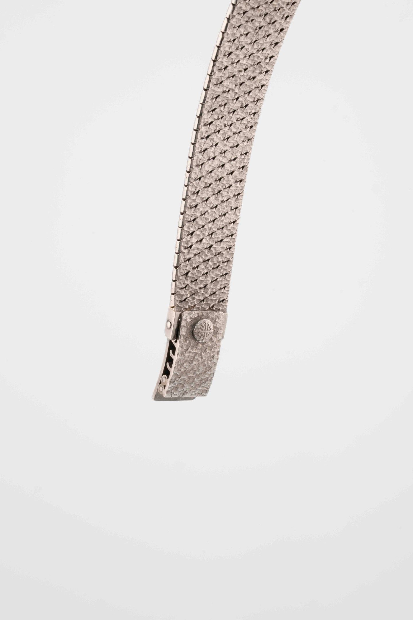 Strap: Milanese link in 750/1000 white gold, adjustable clasp signed with the Calatrava cross.