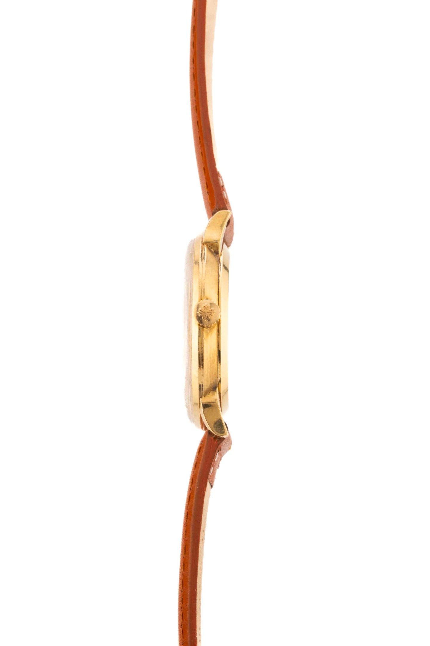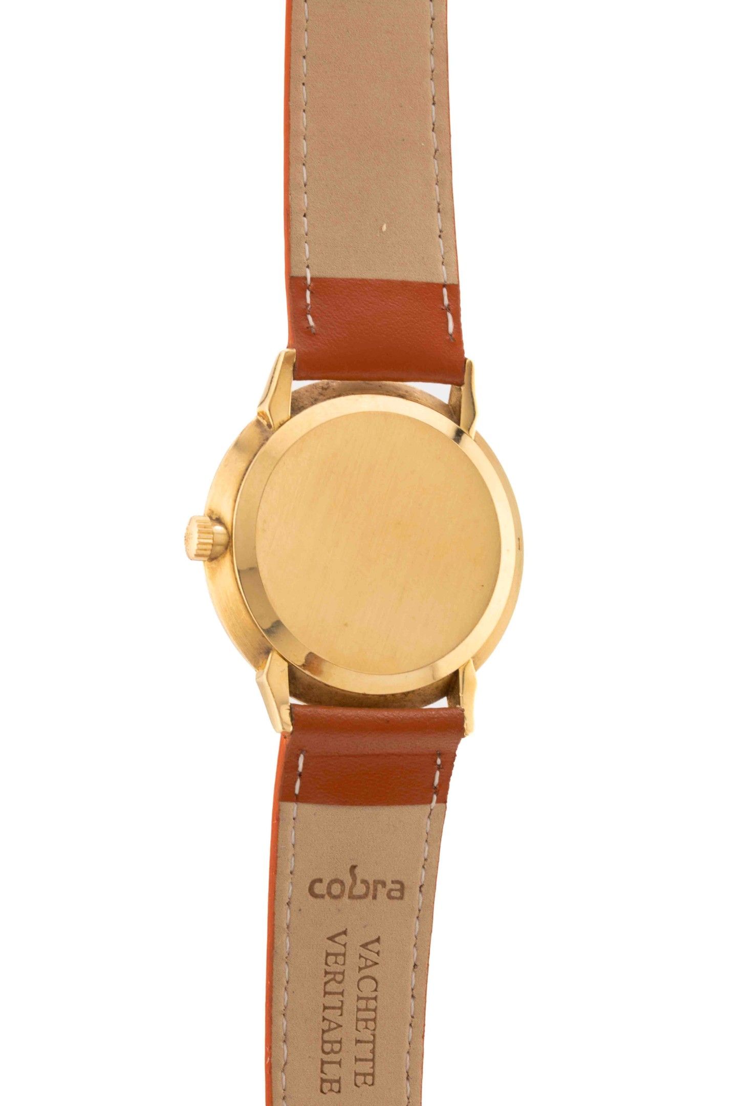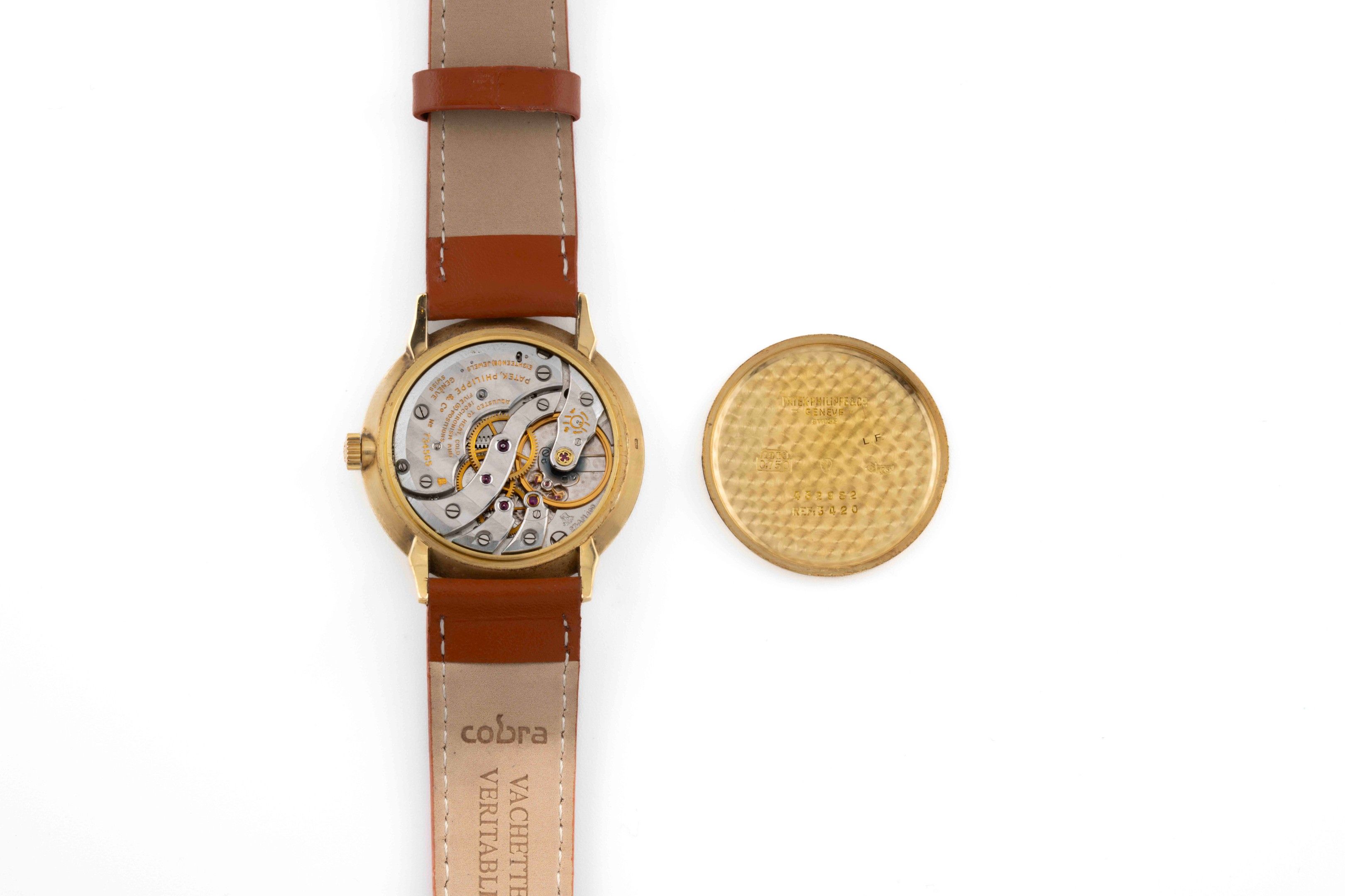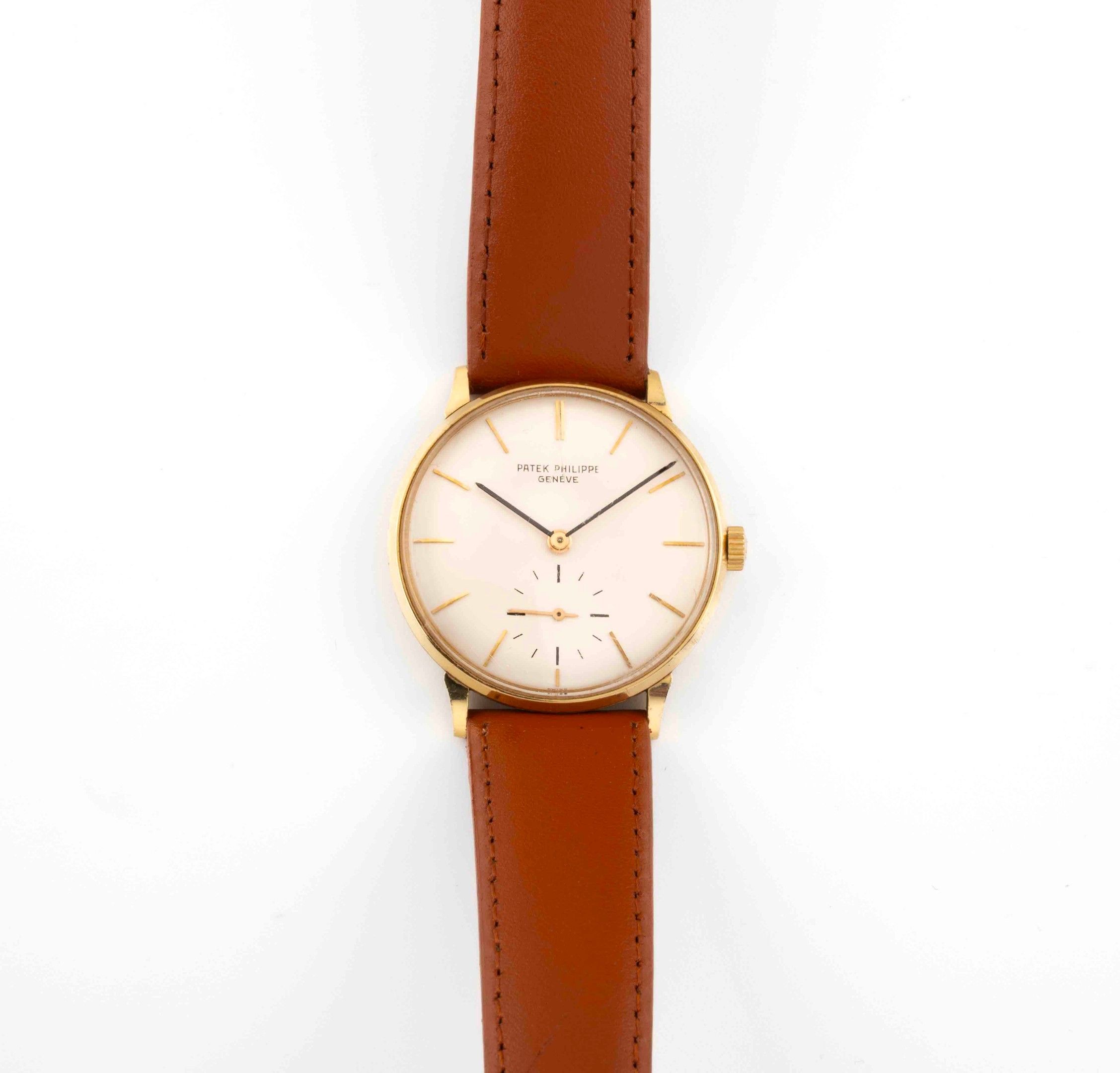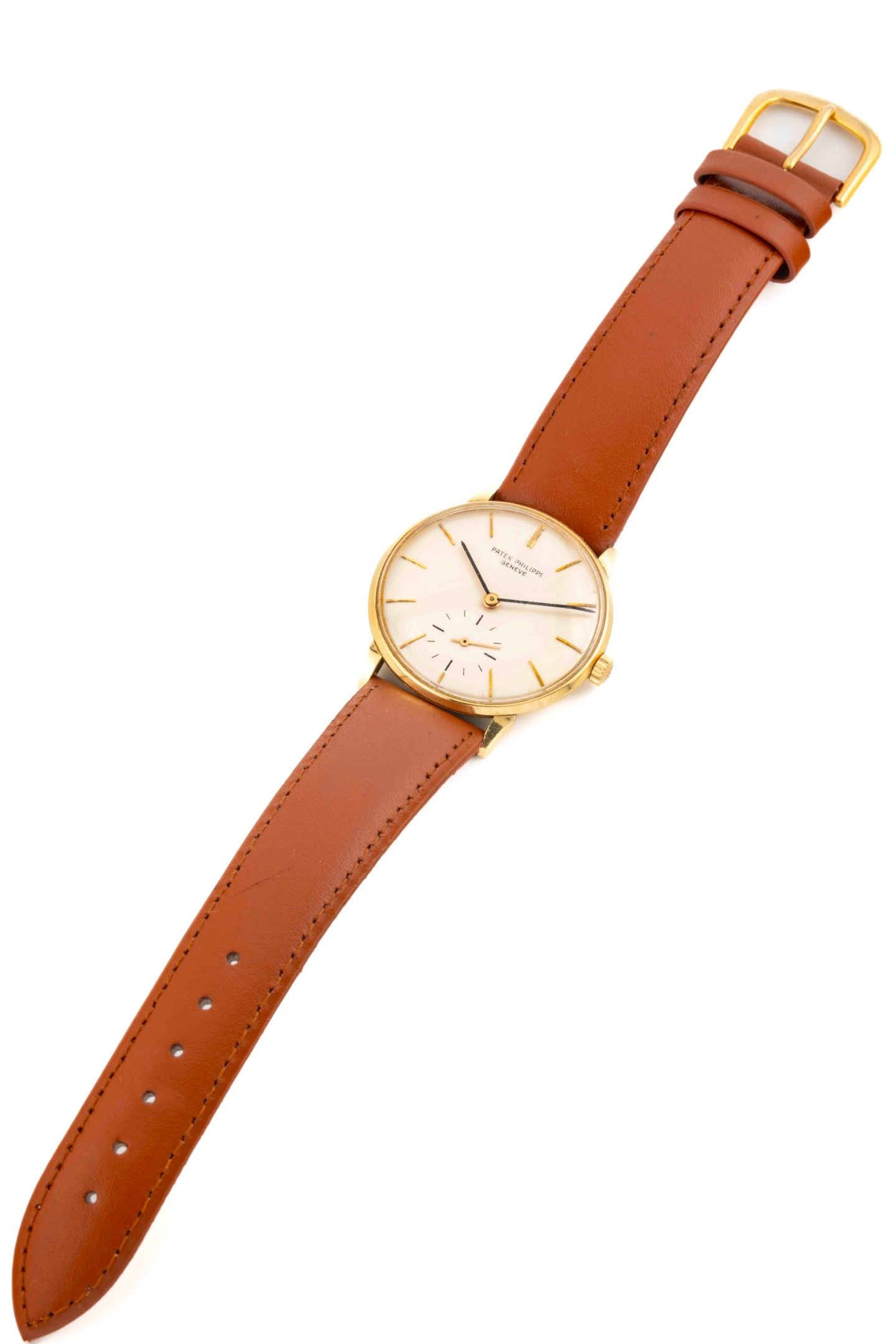 Dial: white signed Patek Philippe Genève, applied baton hour-markers in 750/1000 yellow gold, seconds at 6 o'clock.