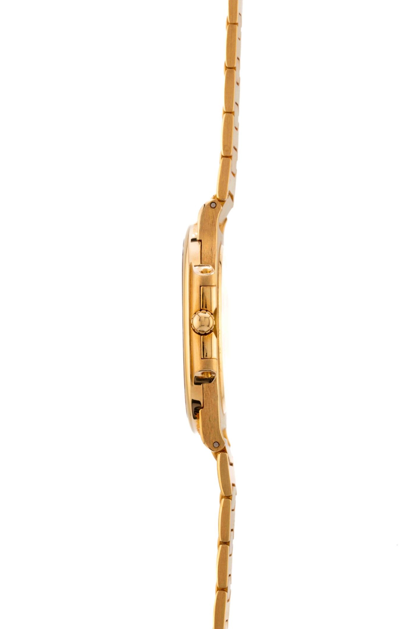 Case: elongated cushion-shaped in 750/1000 yellow gold, bezel in mirror-polished yellow gold, screw-down, fluted winding mechanism in yellow gold, clipped back.