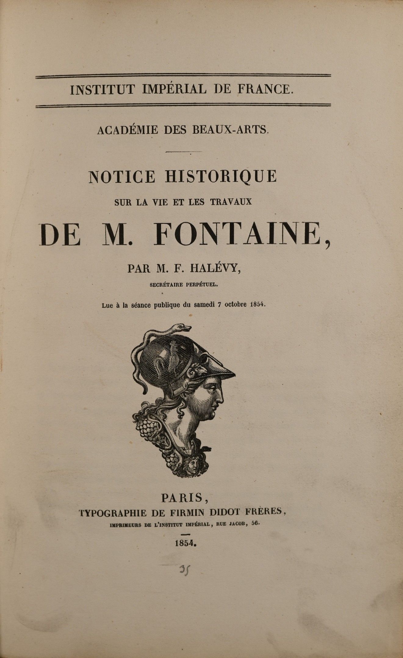 Notice historique sur la vie et les travaux de M. Fontaine [...]. Paris, Typographie de Firmin Didot Frères, 1854. Small in-4° dark brown half-chagrin, smooth spine (late 19th c. binding).