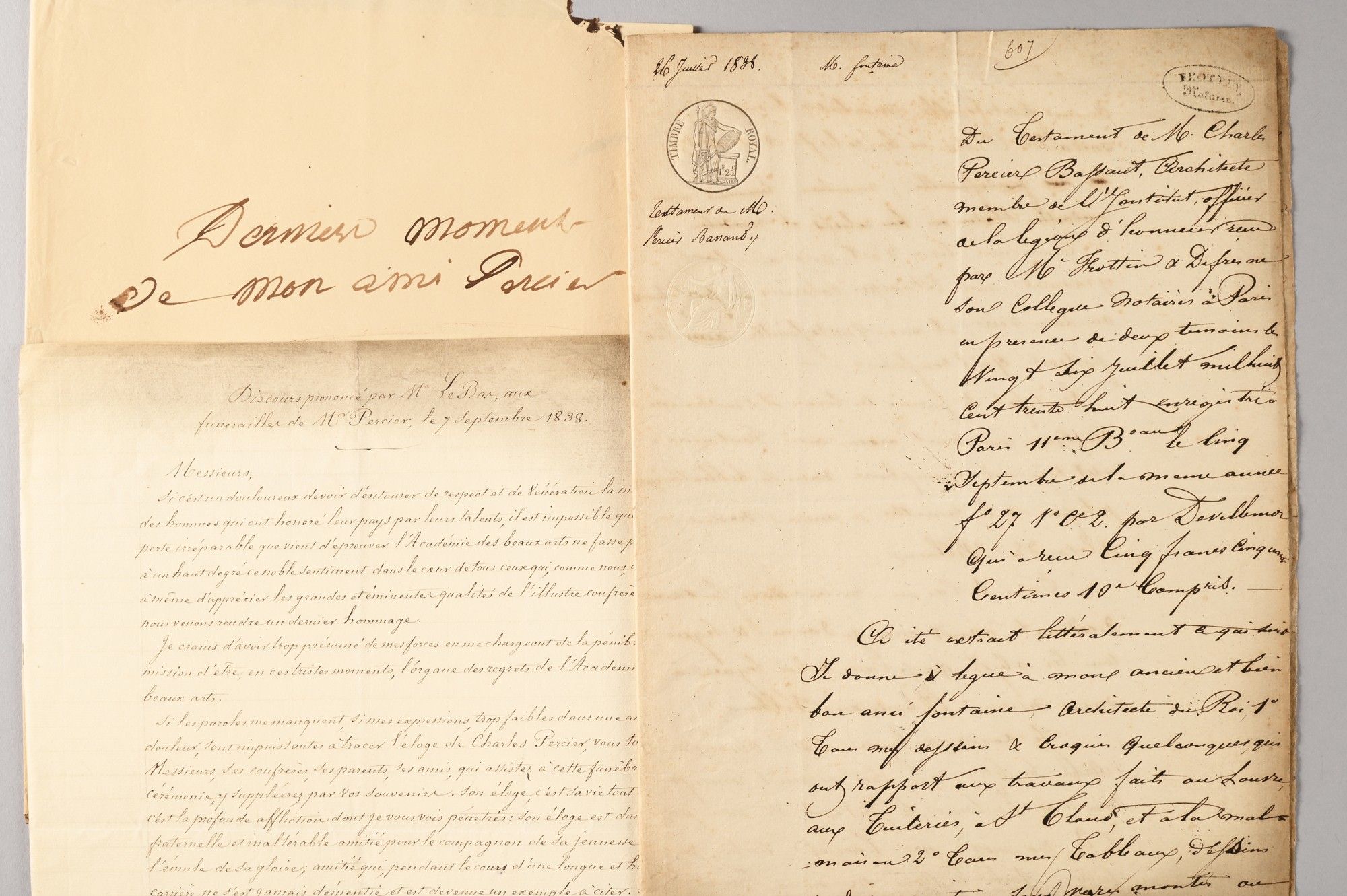 Percier's will, extract: "I bequeath to my old and very good friend Fontaine, architect to the King 1° All my drawings and sketches of any kind relating to the work carried out at the Louvre, the Tuileries, St Cloud and Malmaison 2° All my paintings, drawings by various masters [...], marbles, bronzes, medals, plaster bas-reliefs and models 3° All my art books [...].