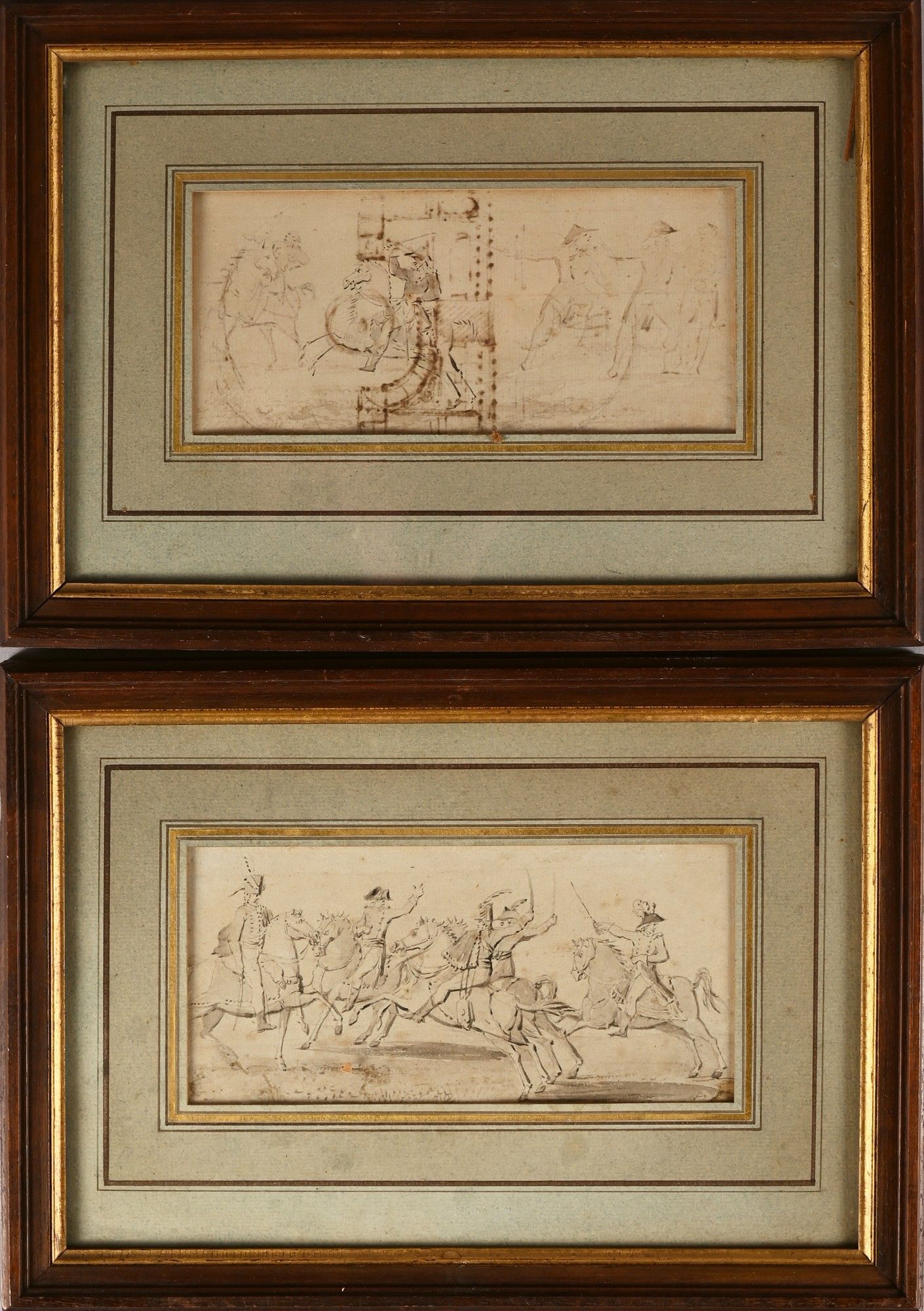 Pair of drawings, pen and black ink, grey and brown wash.