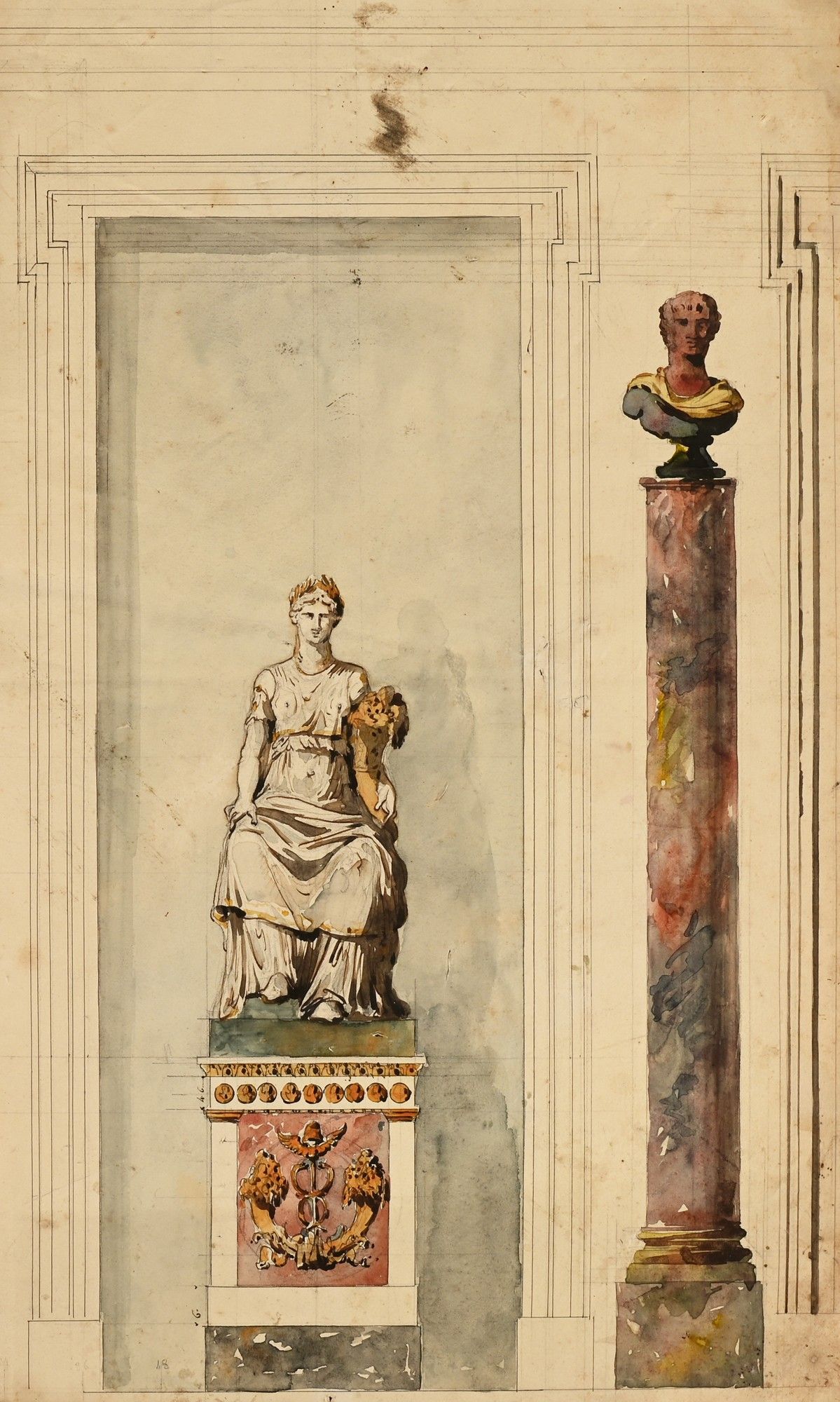 Allegory of abundance on a pedestal decorated with a Phrygian cap, and bust of an emperor on a column