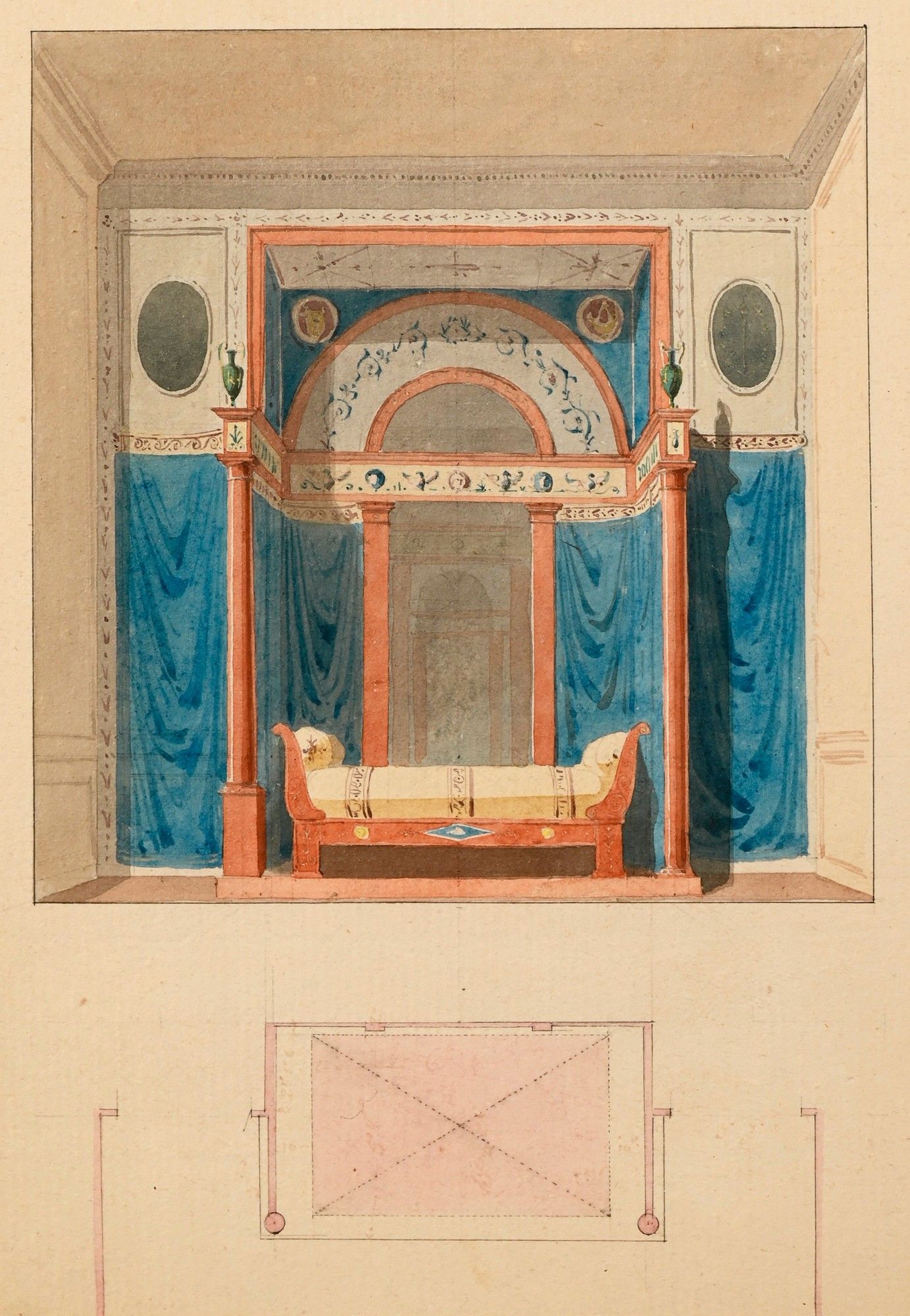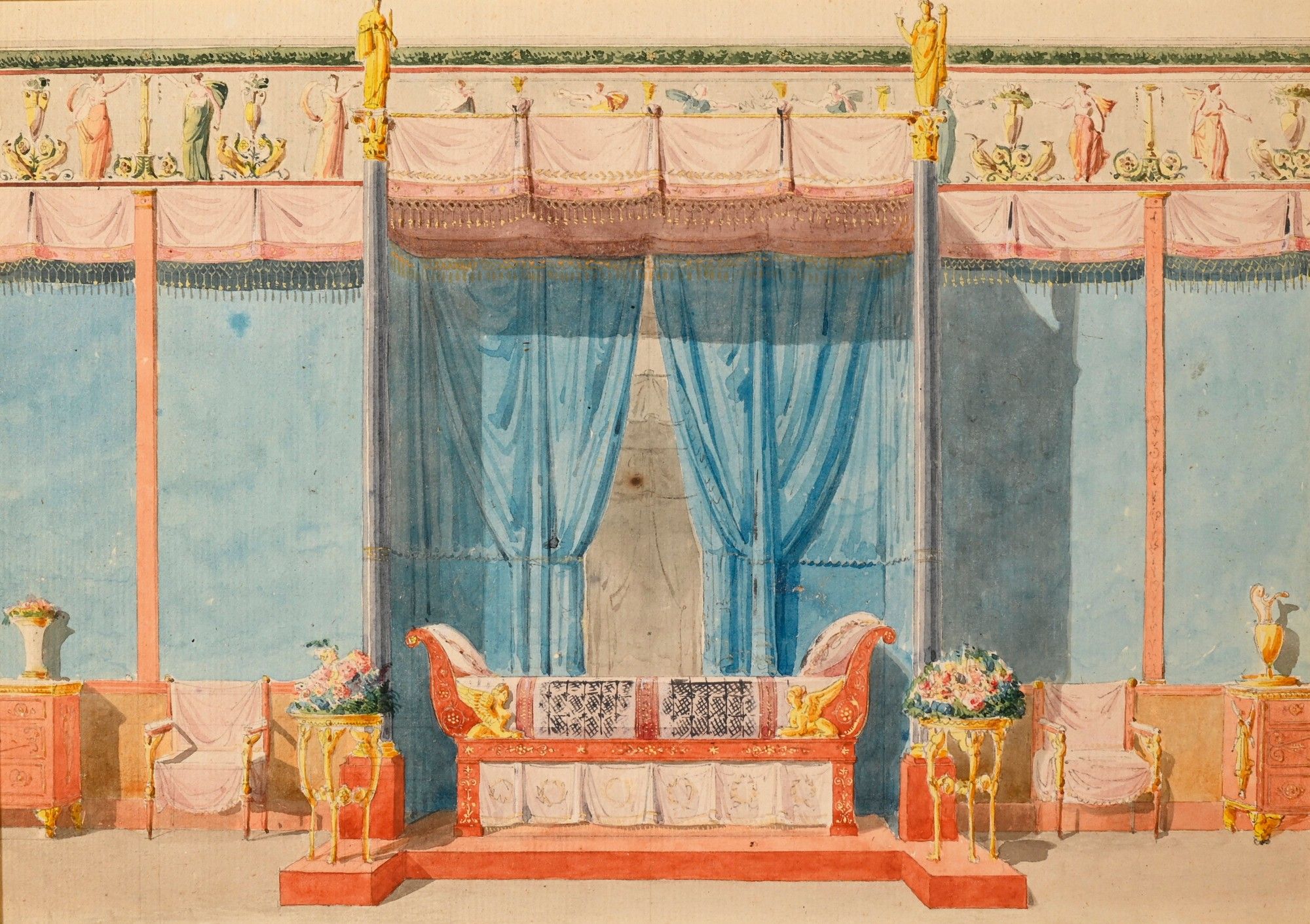 Our drawing Interior for a Dining Room is similar to a drawing of the same subject, given to Charles Percier, kept at the Institut National de l'Histoire de l'Art.