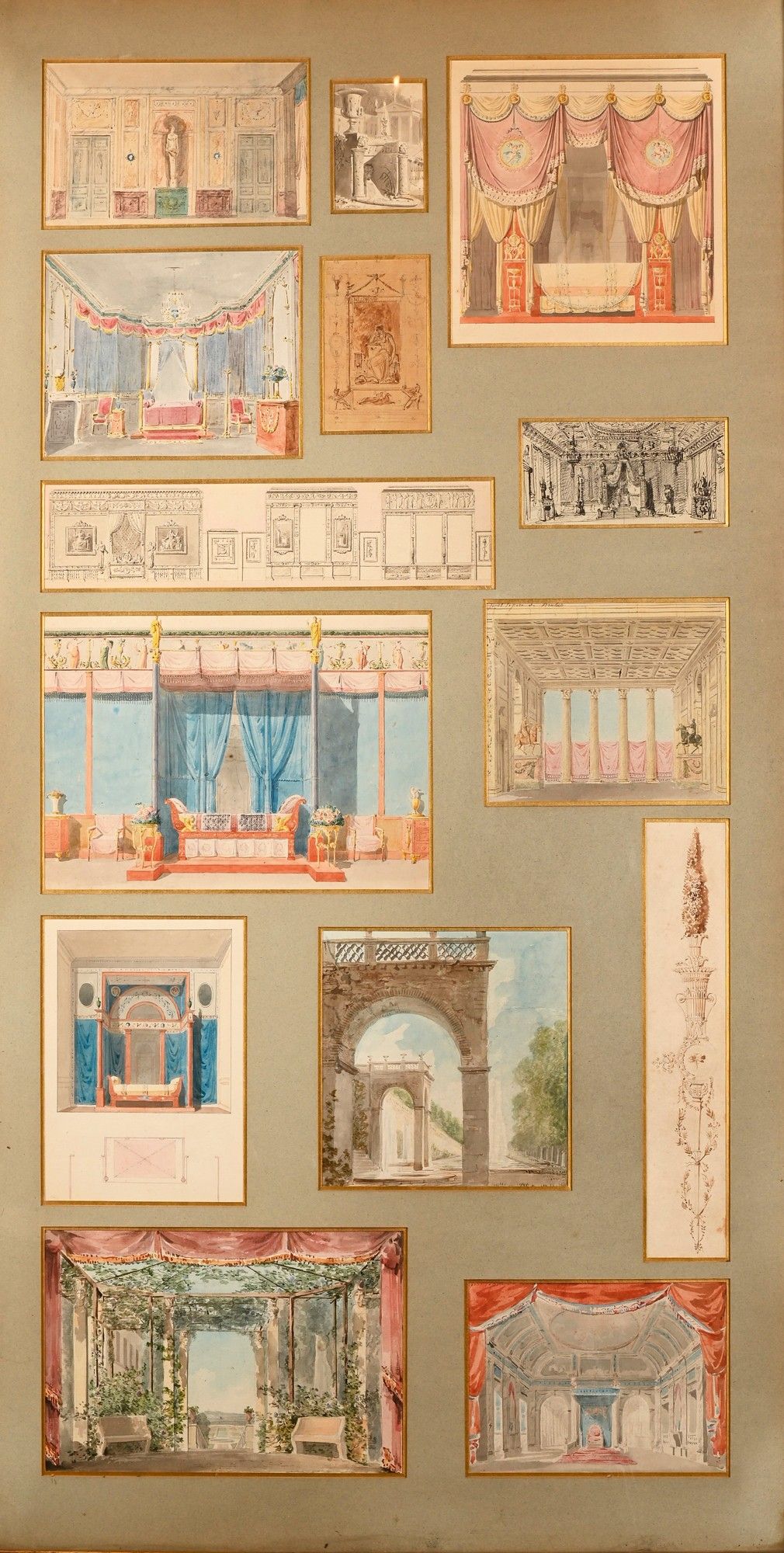 Our drawing Projet de décor de la chambre du citoyen V. is reproduced in the work by C. Percier and P. Fontaine, Recueil de décorations intérieures [...], Paris, 1812, pl. 13, and can be compared with the wallpaper panels representing the seasons in the Metropolitan Museum of Art, lots 136, 137, 138, 139.