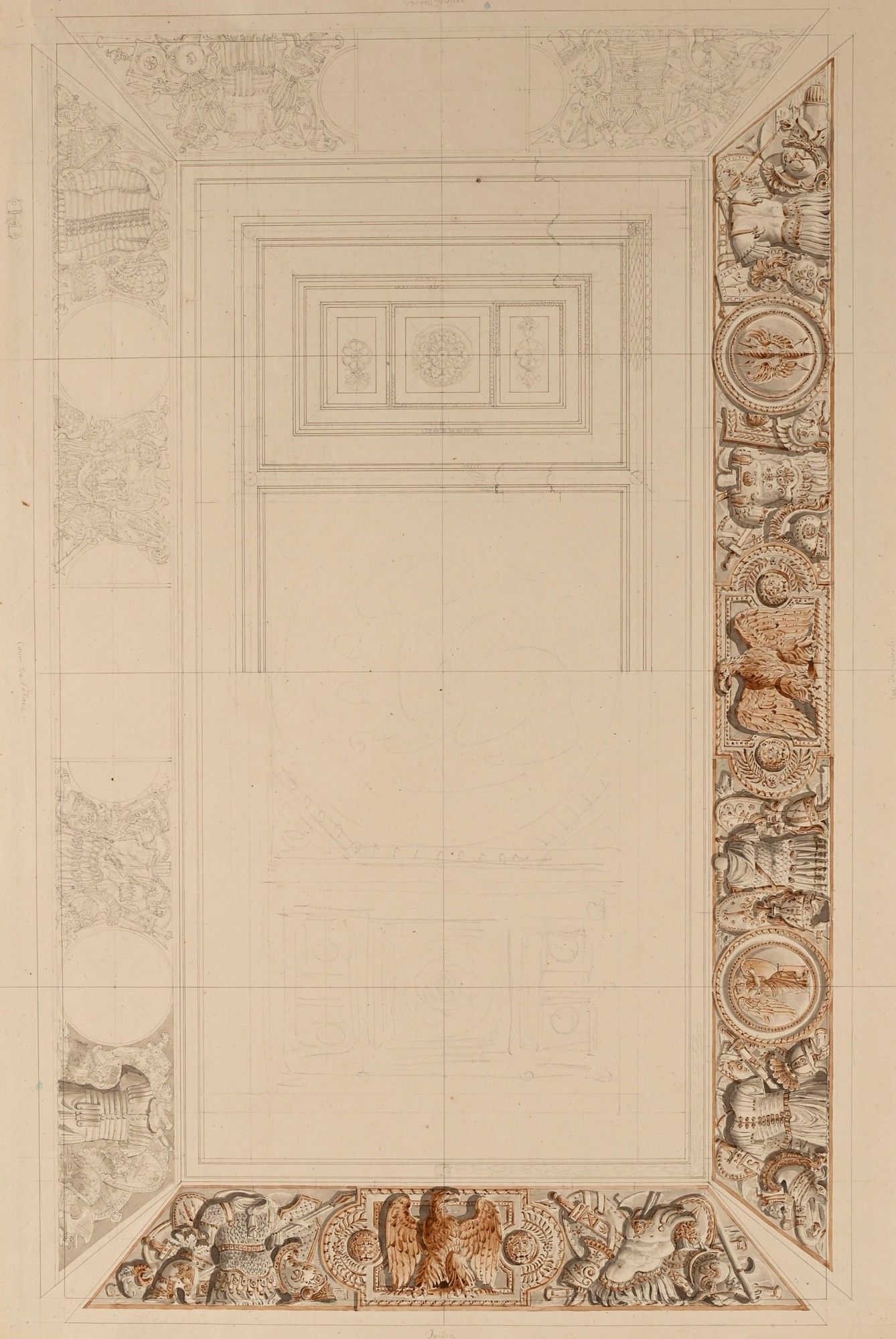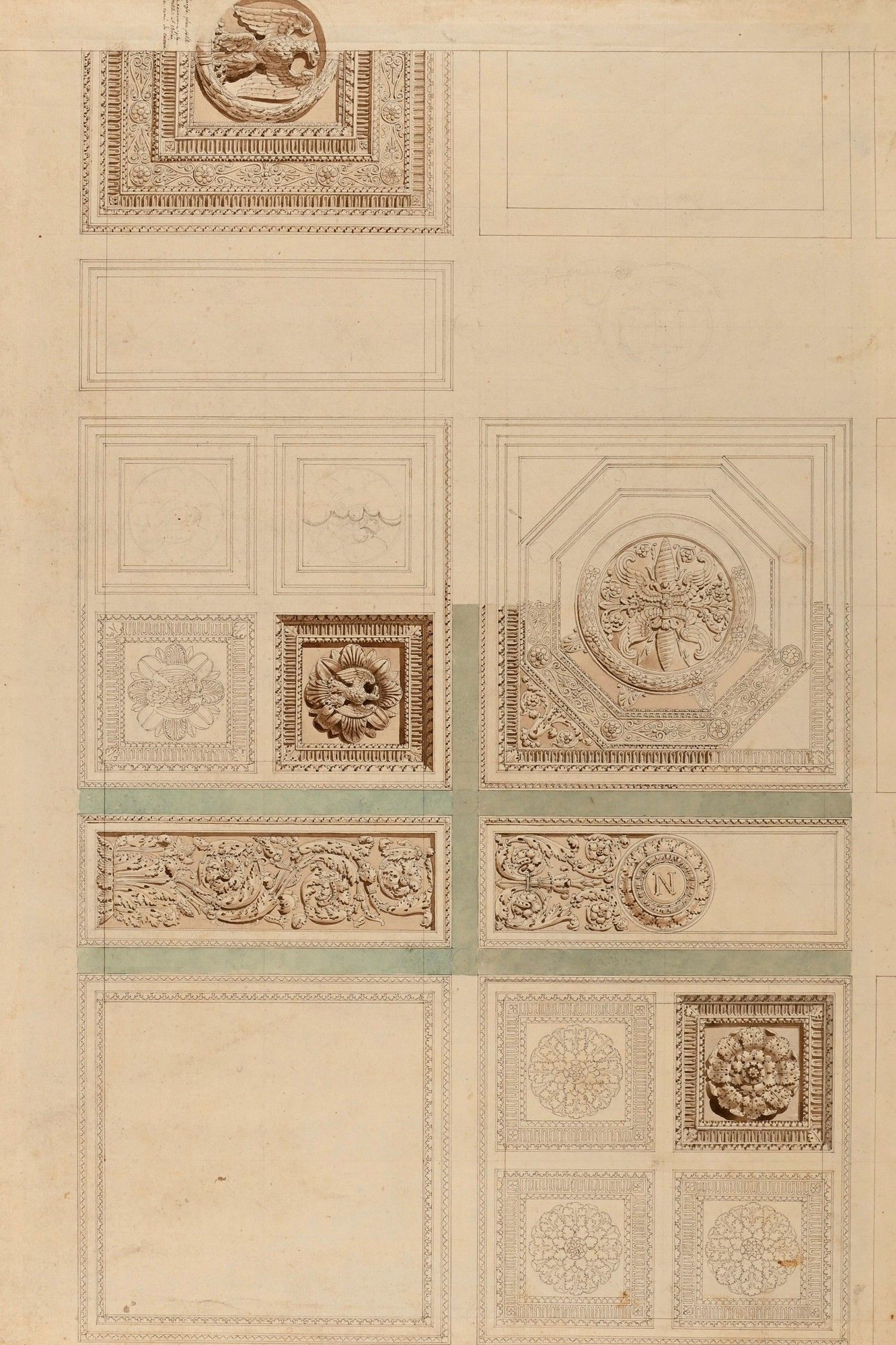 Two designs for ceilings in the Louvre, with trophies of arms or coffered ceilings and motifs of fleurons, eagles and Napoleon's cipher.