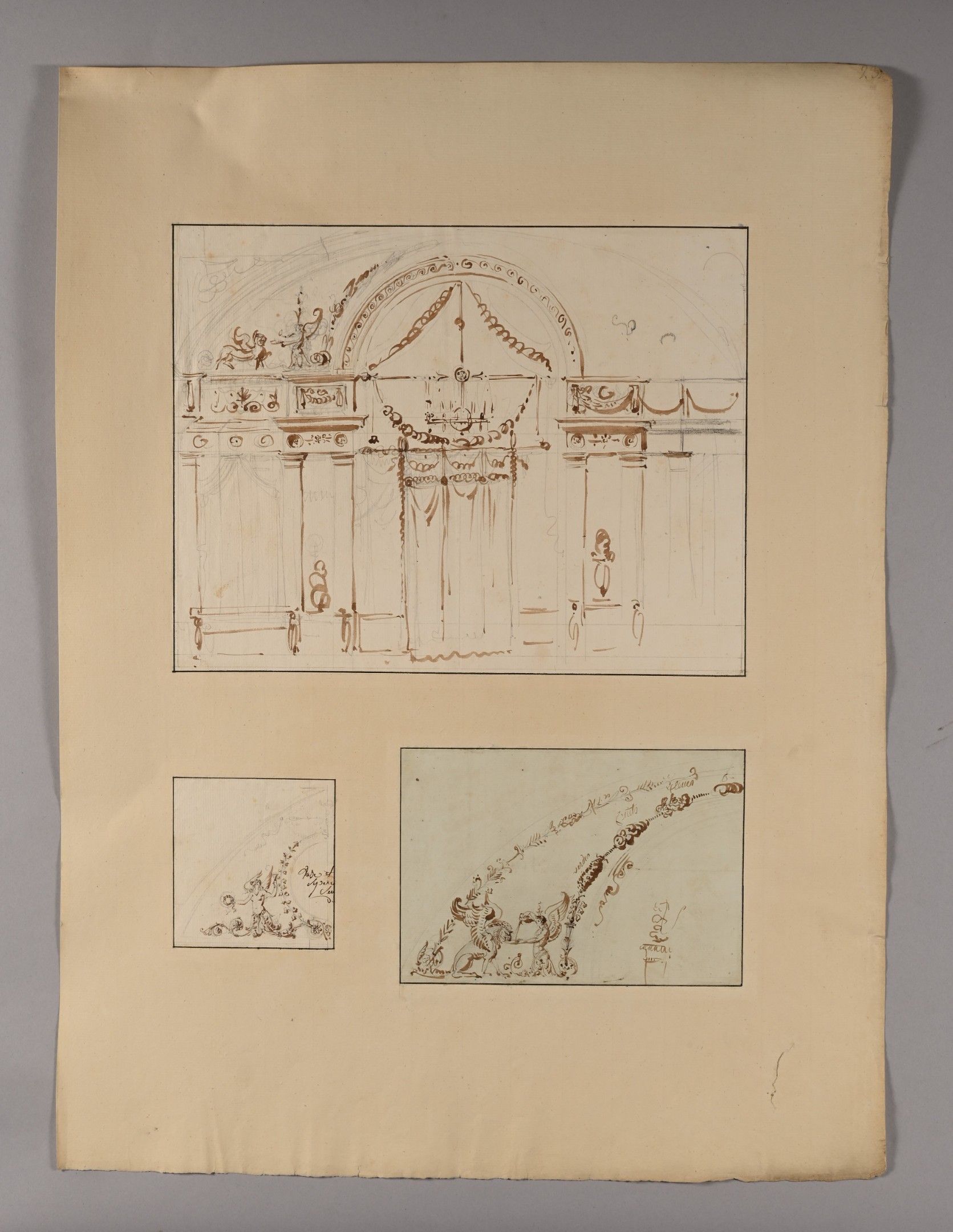 Seven drawings on three mounts, pen and black and brown ink, grey and brown wash, watercolour over black stone lines, some on tracing paper.