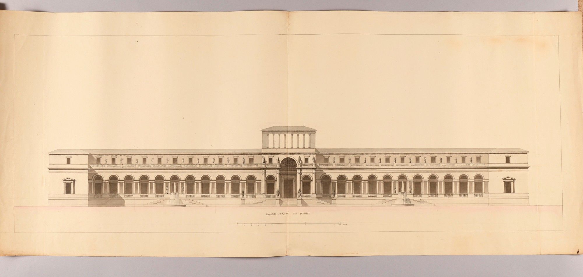 Two designs for the facades and elevations of the Imperial Palace on the Perrache peninsula, including the garden facade.
