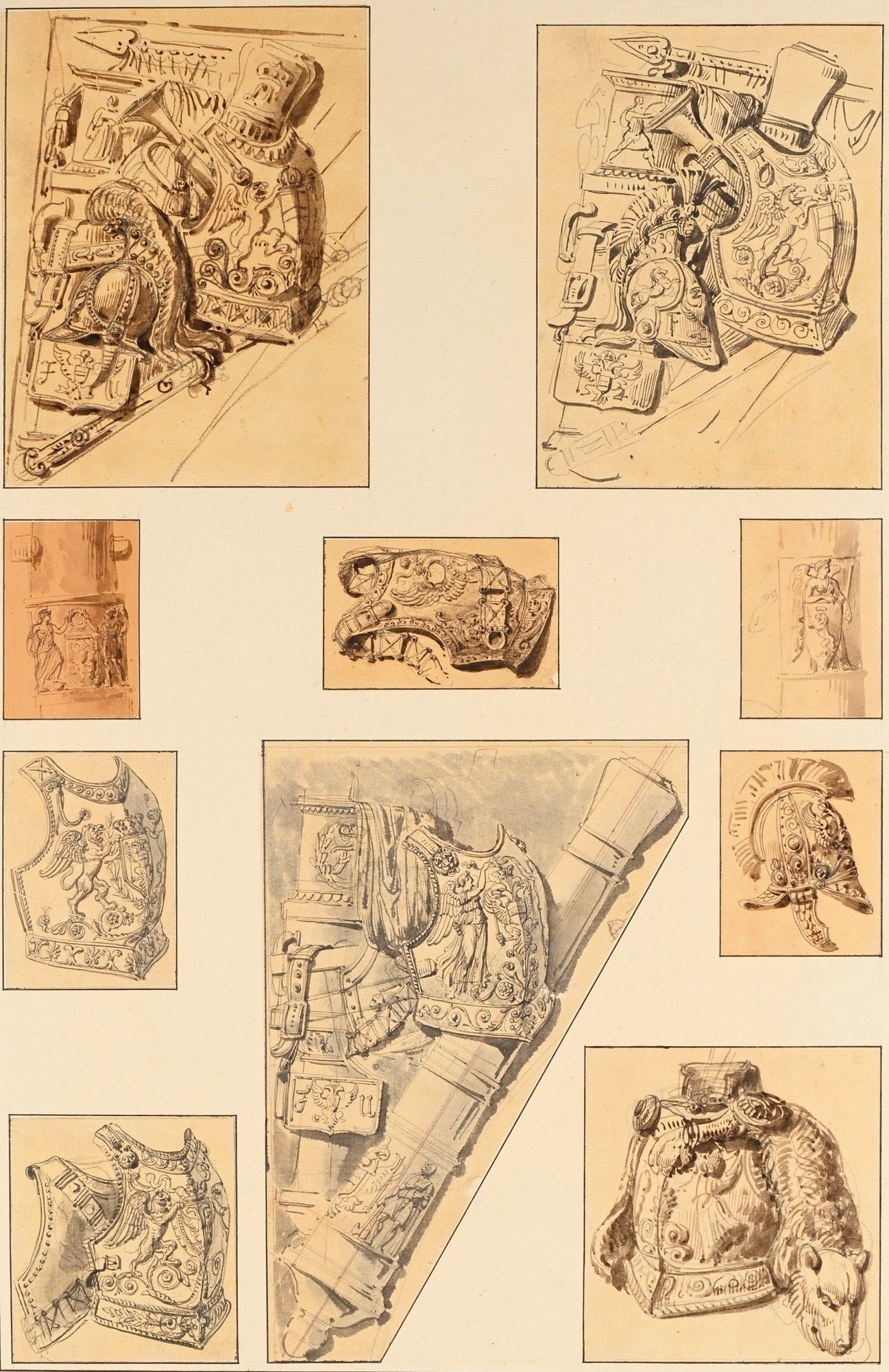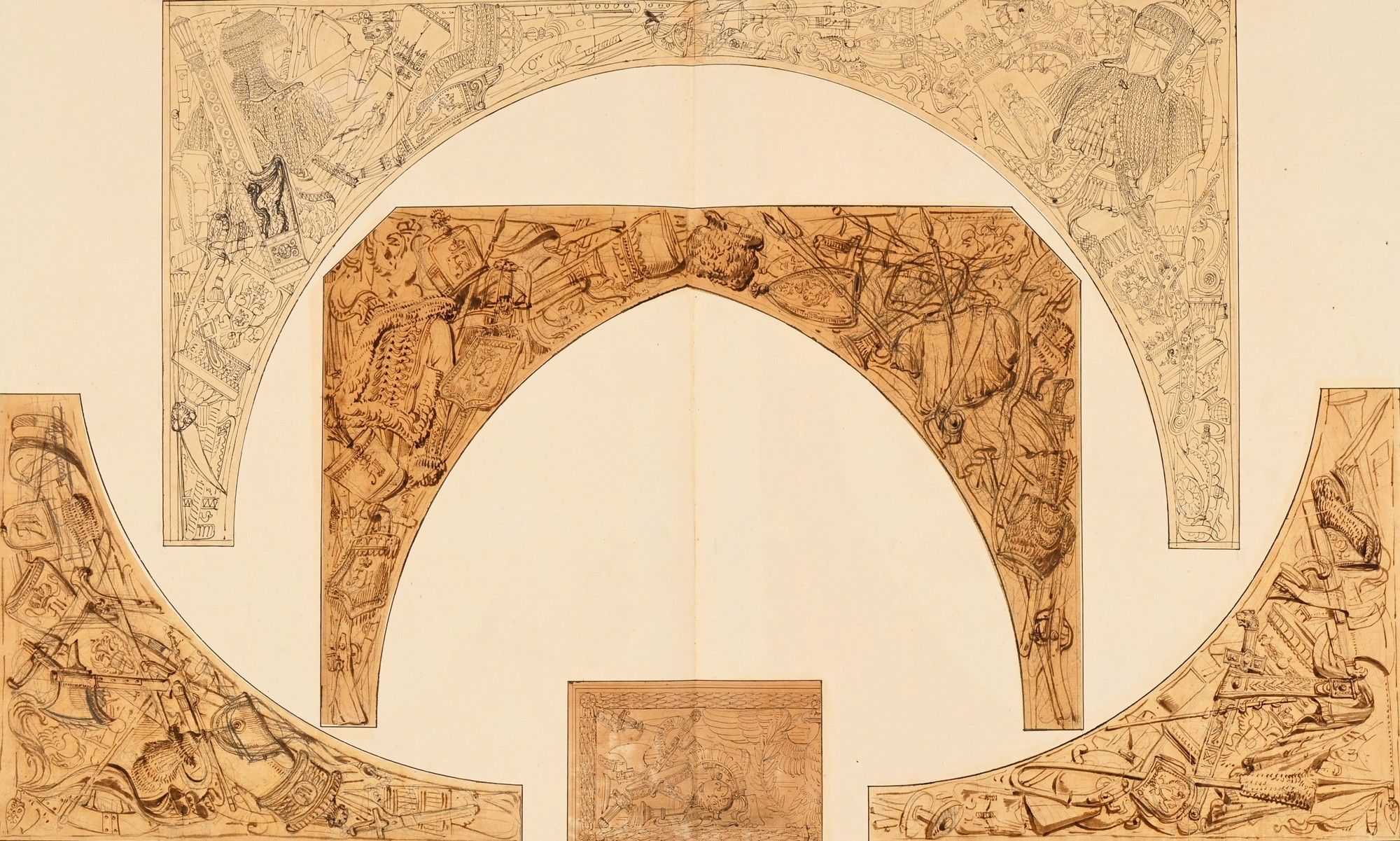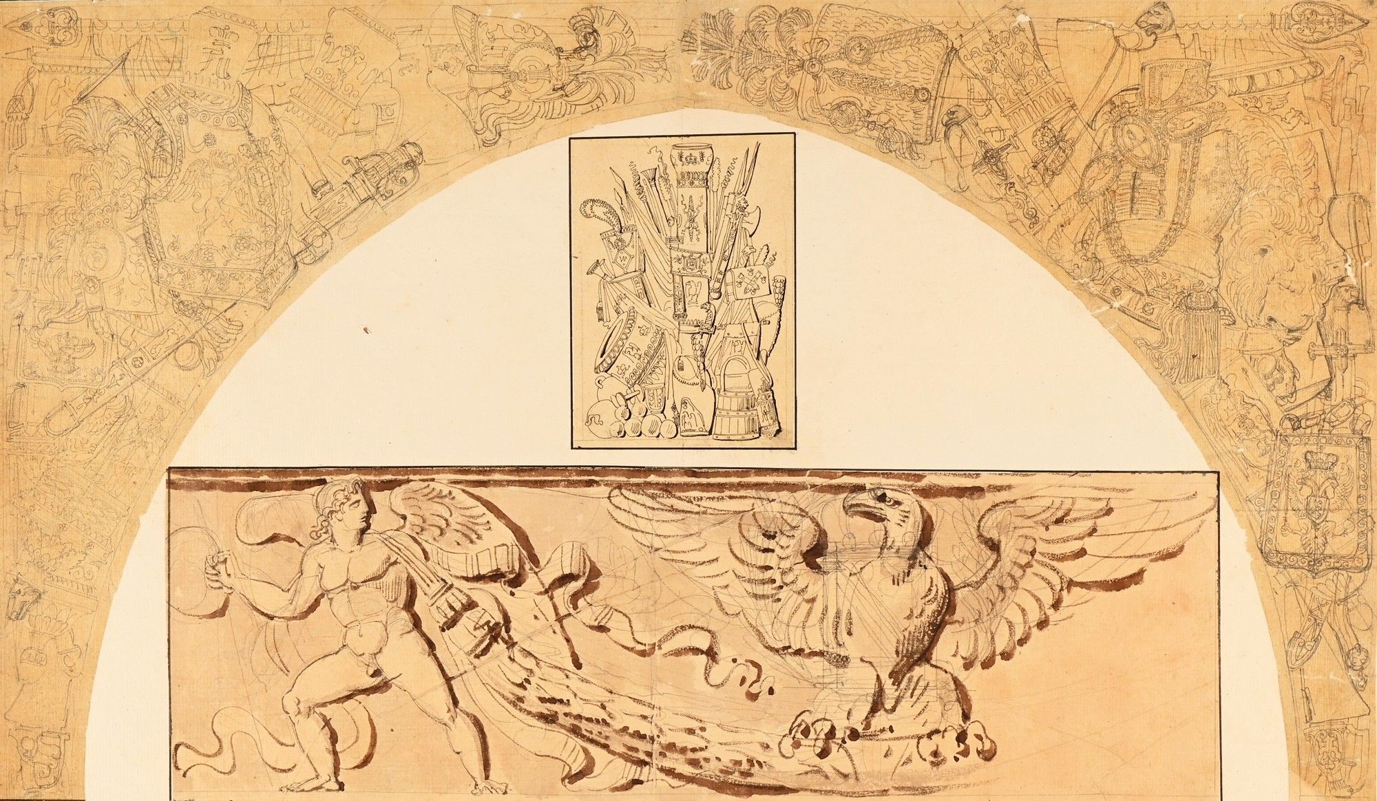 Bibliography: The designs for the trophies of arms are included in the frontispiece of the work by C. Percier and P.F.L. Fontaine, Description des cérémonies et des fêtes [...] pour le couronnement de leurs Majestés Napoléon [...] et Joséphine [...], Paris, 1807, reproduced pl. 1.