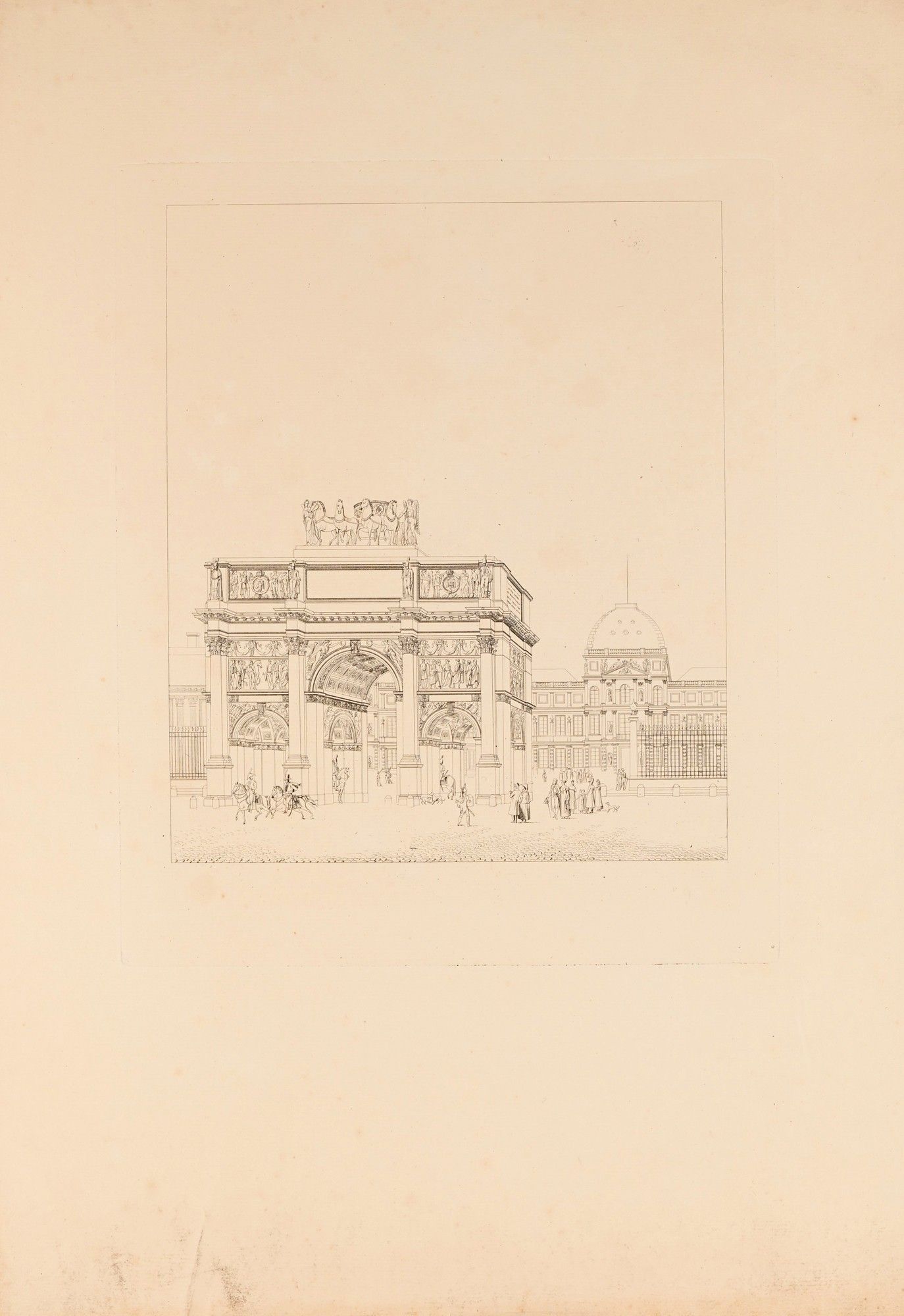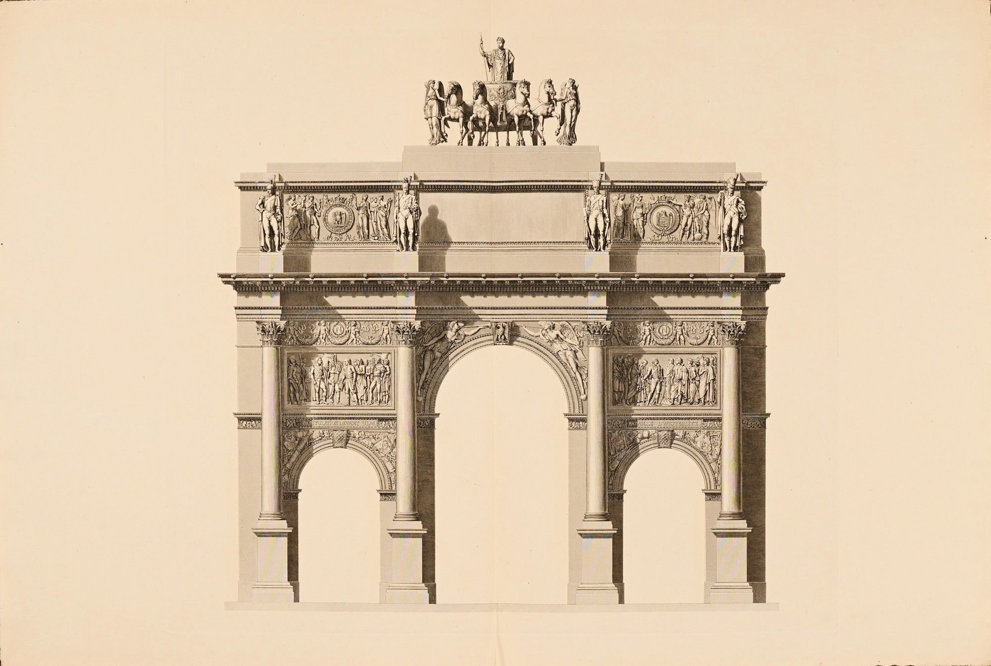 Percier and Fontaine commissioned one of their mutual friends, Louis-Pierre Baltard, to engrave the drawings of the Arc de Triomphe on the Place du Carrousel, for a collection published posthumously in 1875.