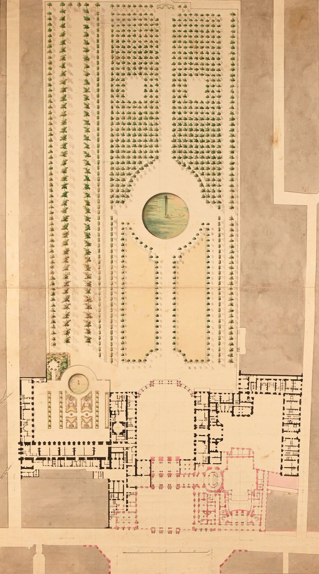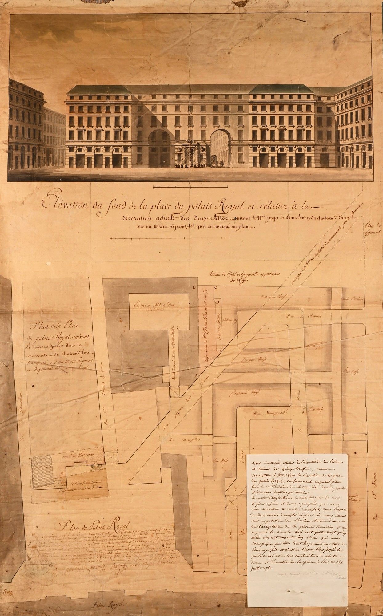 Surveys from the second half of the 18th century (elevation of the Palais Royal, surveys of the orangery, gardens, palace, etc.) and various plans (projected buildings, mezzanine, cellars, plans of the flats with references to the Dukes of Chartres and Orléans).