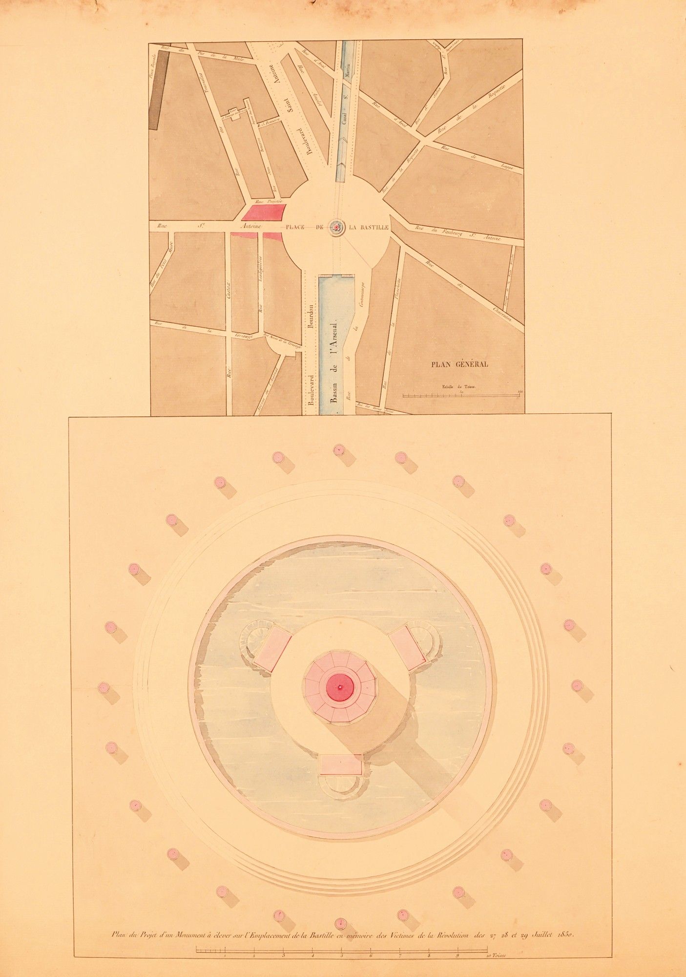 Project for a monument in memory of the victims of the 1830 revolution, Place de la Bastille and plan of the square in 1830, plan in situ.
