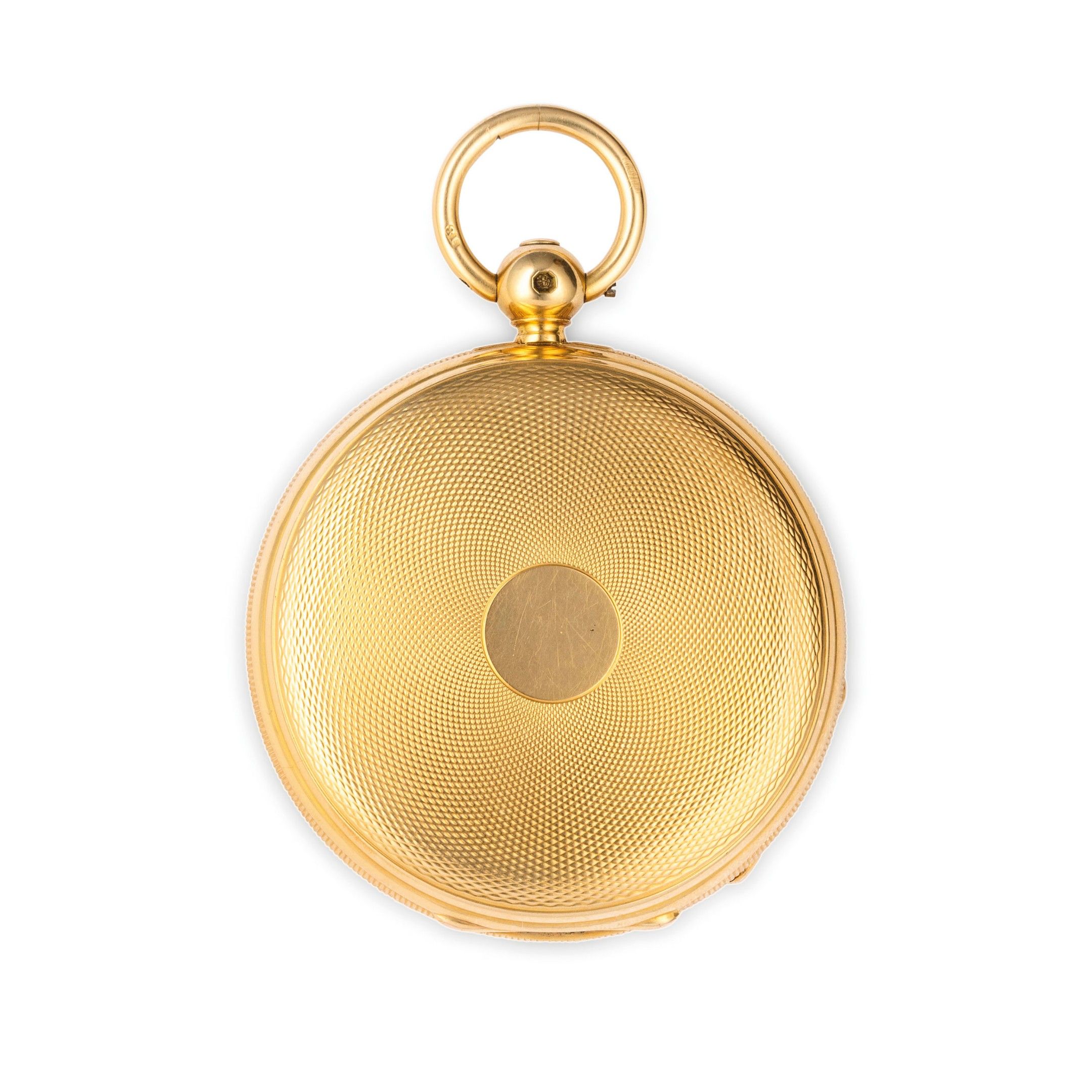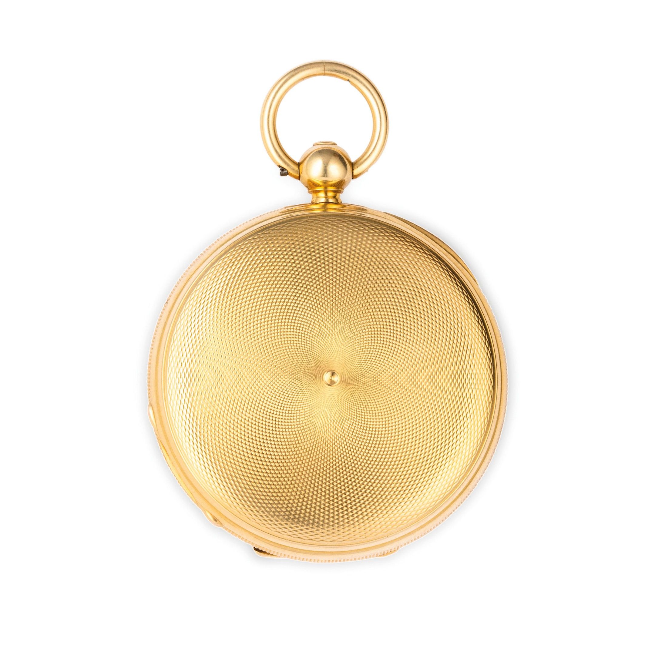 49 mm diameter yellow gold savonette case, decorated with guilloché motifs, gold dial, signed, partially silvered, Roman numerals, pear-shaped hands, movement with Detent escapement, cylindrical balance spring. Watch currently in working order, winding key absent. Weight 124.3 g