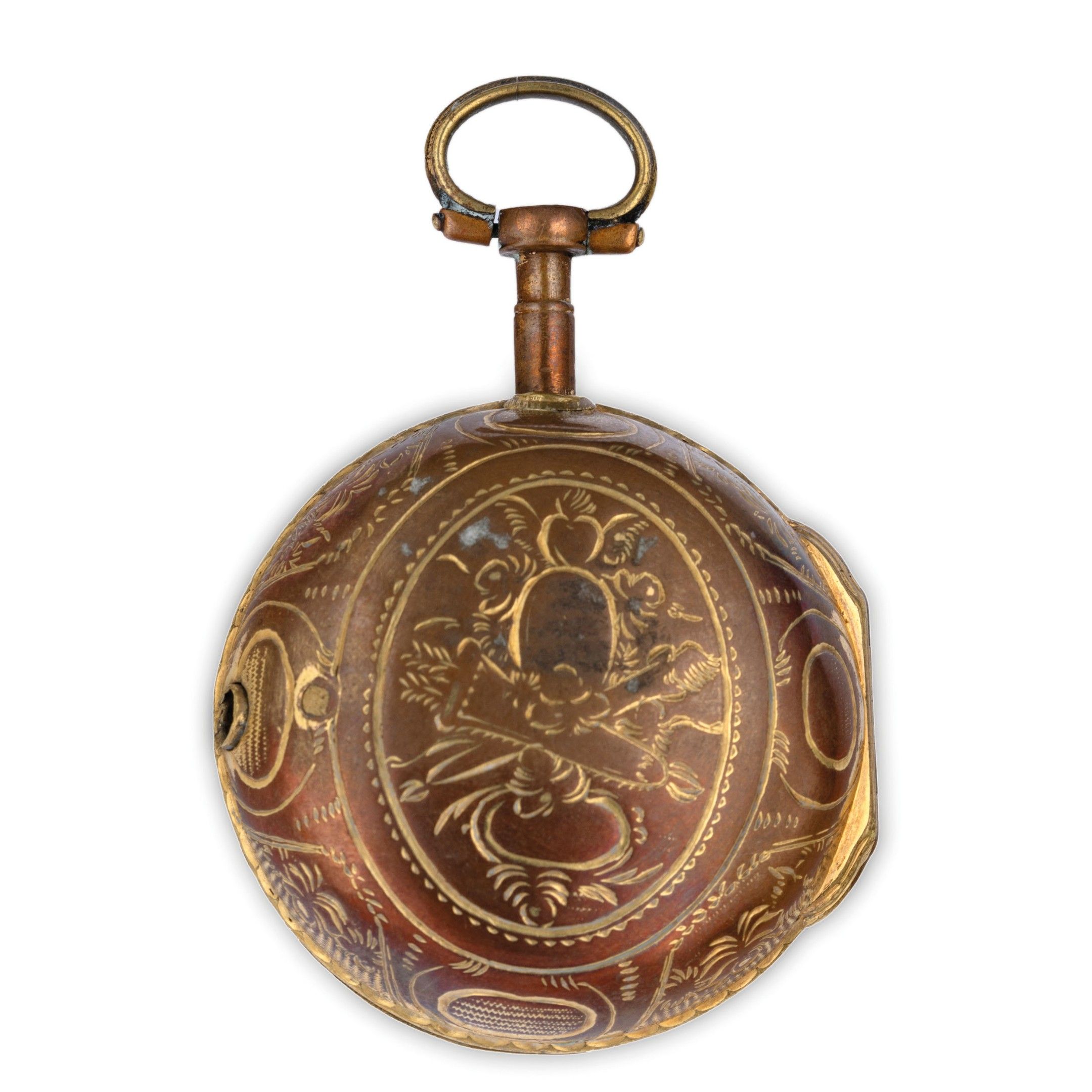 gilded metal back case diameter 44 mm, decorated on the reverse with hunting theme, gilded metal inner case diameter 37 mm, white enamel dial with Roman numerals for the hours, Arabic numerals in five for the minutes, gilded bronze hands, movement with verge escapement, signed. Watch currently in working order, winding key absent.