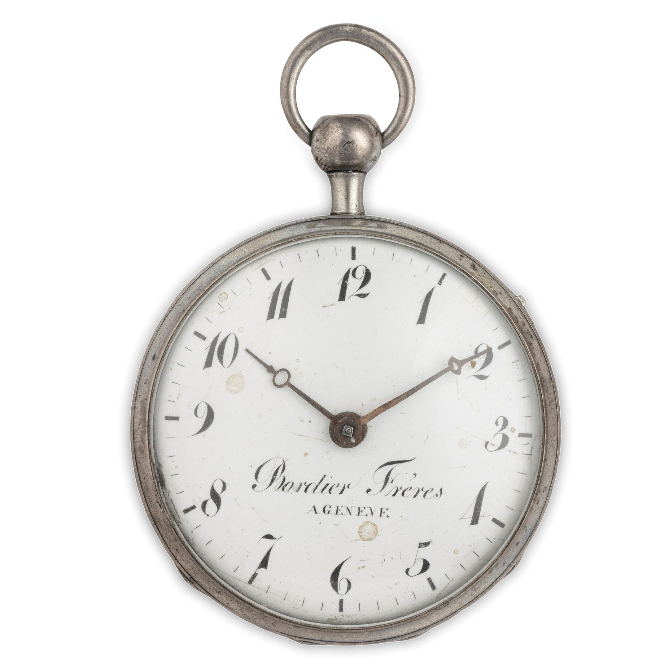 Silver case diameter 55 mm, white enamel dial with Arabic numerals, signed Bordier Freres in Geneve, brass hands, movement with verge escapement, poussor chime, hours and half-hours on gong. Watch to be serviced, non-functioning, rod good.