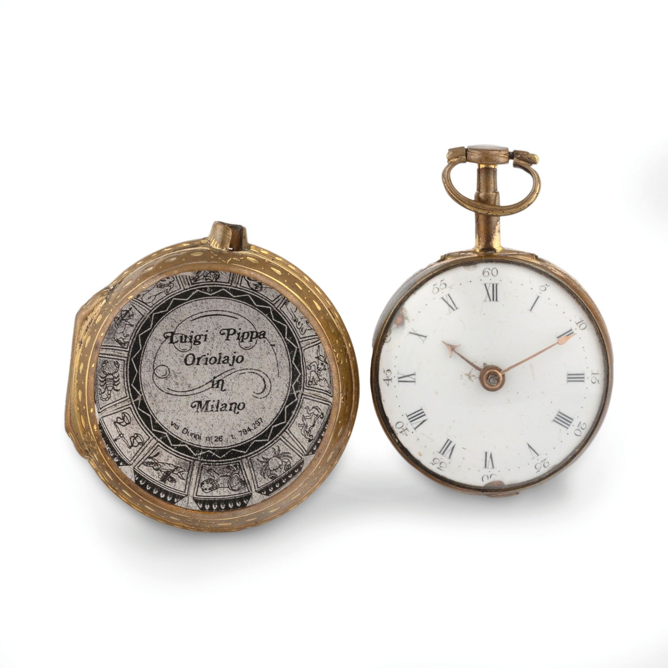 double case watch, gilt case diameter 46 mm, bassine case diameter 40 mm, white dial with Roman numerals for hours, Arabic numerals in 5 for minutes, gold arrow hands, signed movement, with verge escapement, large finely decorated coq and engraved and signed plate. Watch to be serviced, winding key missing. Interior cartouche Luigi Pippa Milan collection.