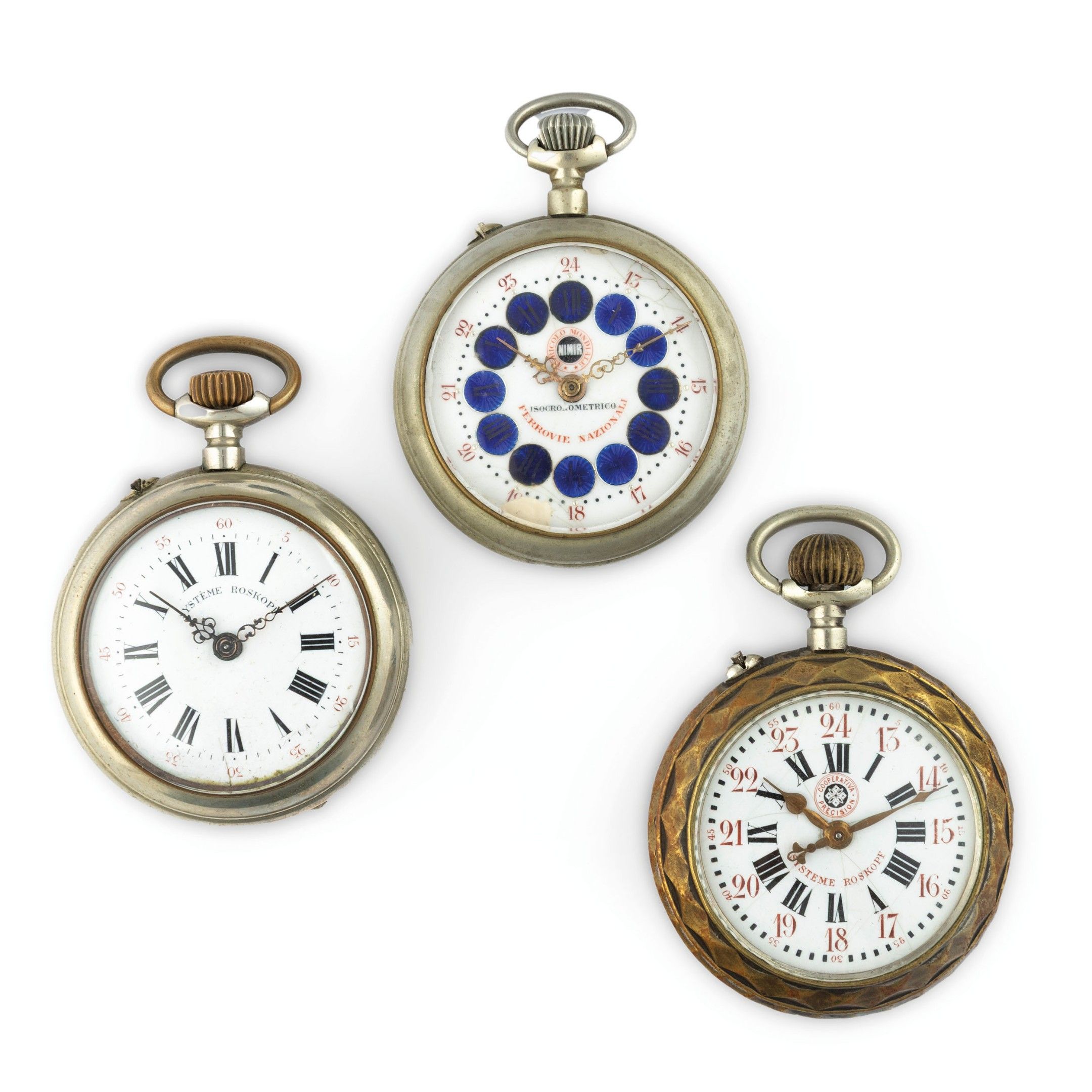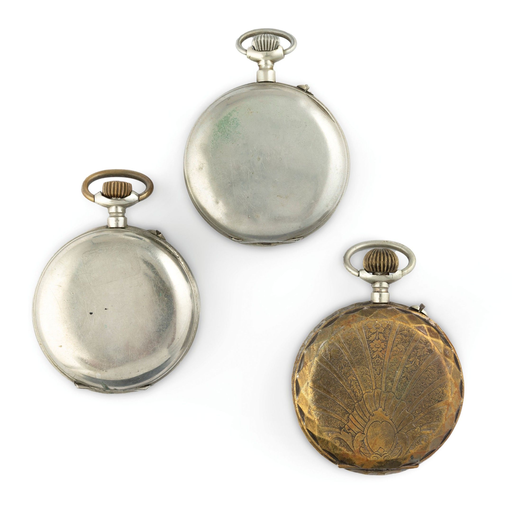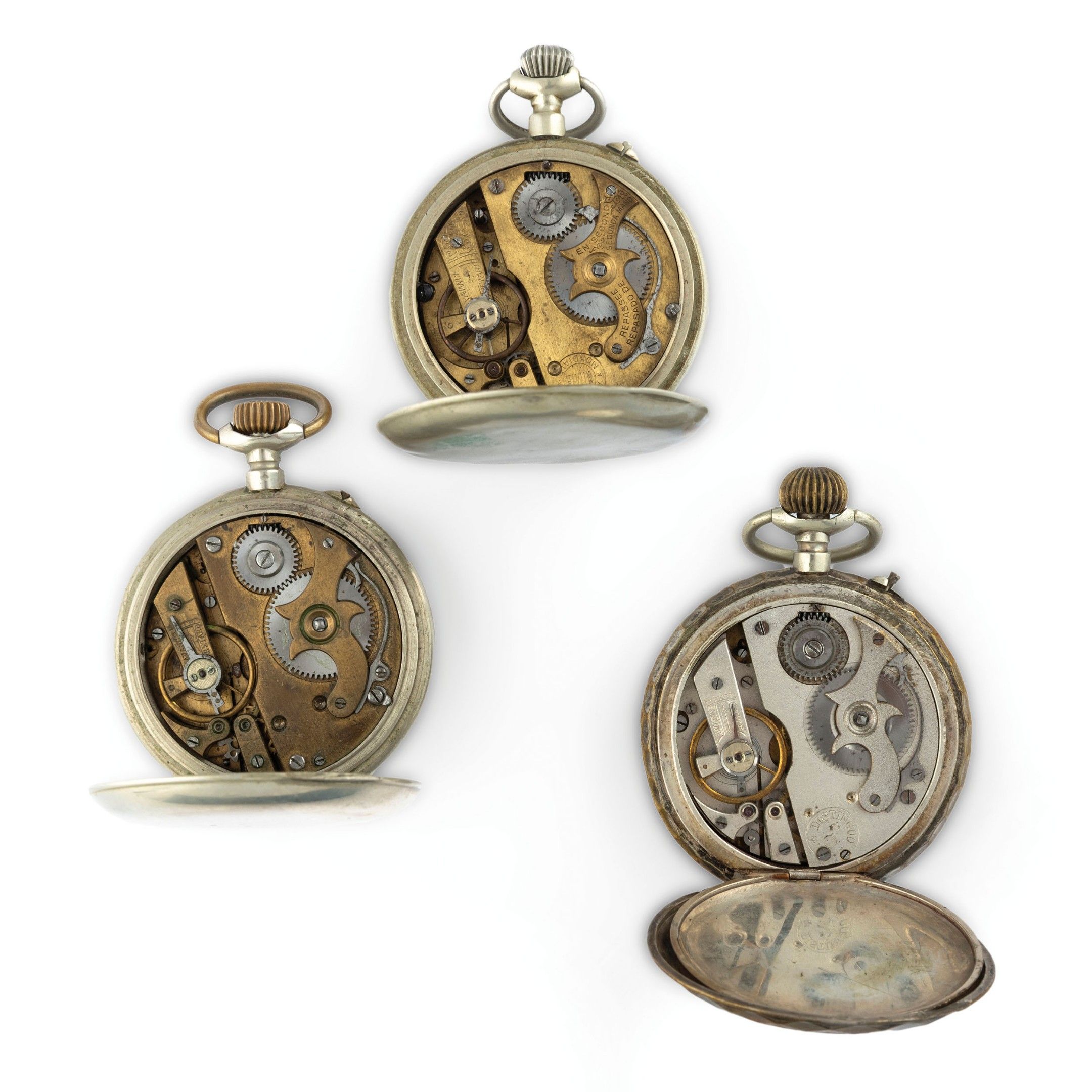 LOT OF THREE OPEN FACE METAL POCKET WATCHES WITH SYSTEME ROSKOPF, SWITZERLAND CIRCA 1880-1890
