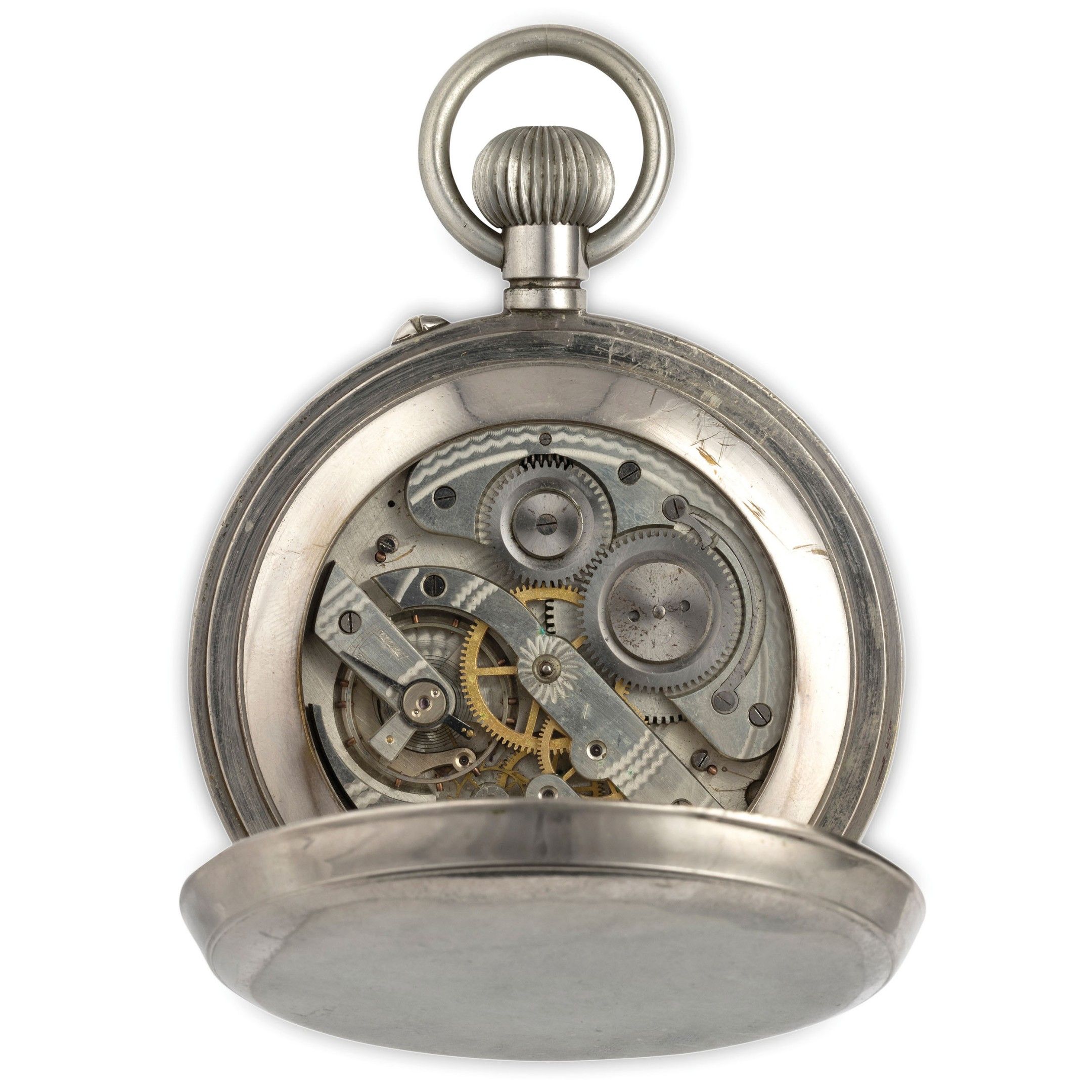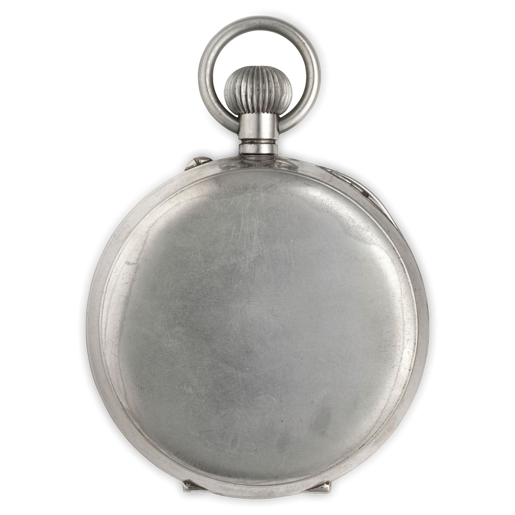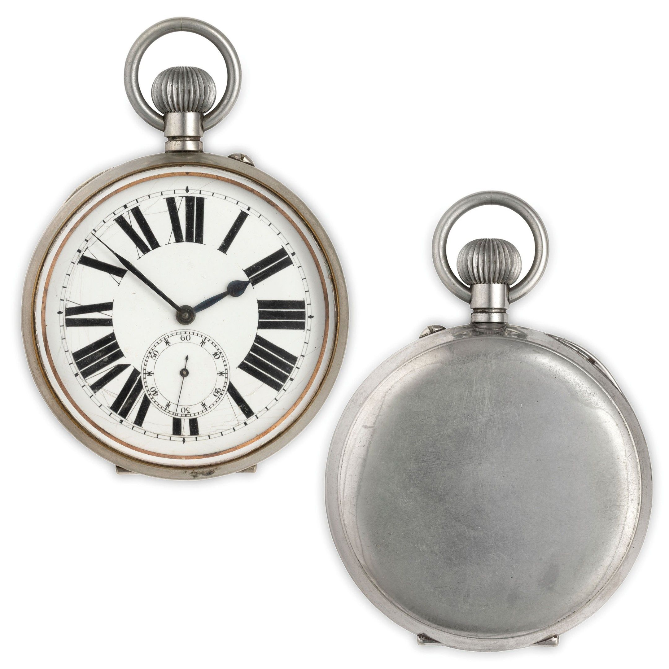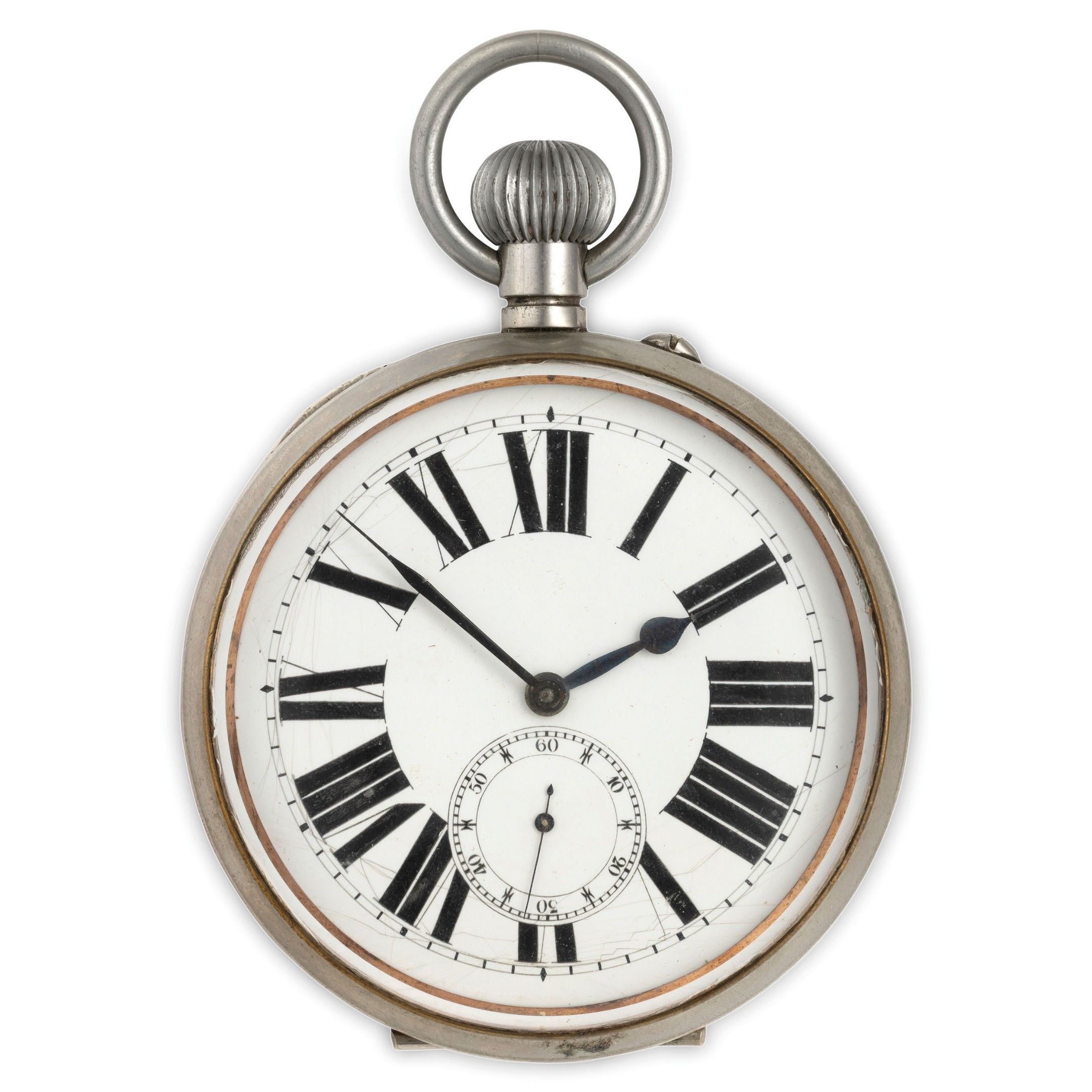 argentan case, smooth, diameter 92 mm, white enamel dial with Roman numerals, small seconds at six o'clock, bevelled crystal, smooth back, movement decorated with cote de geneve, with anchor escapement, mechanism to be overhauled (no damage to the mechanism, only dirt)