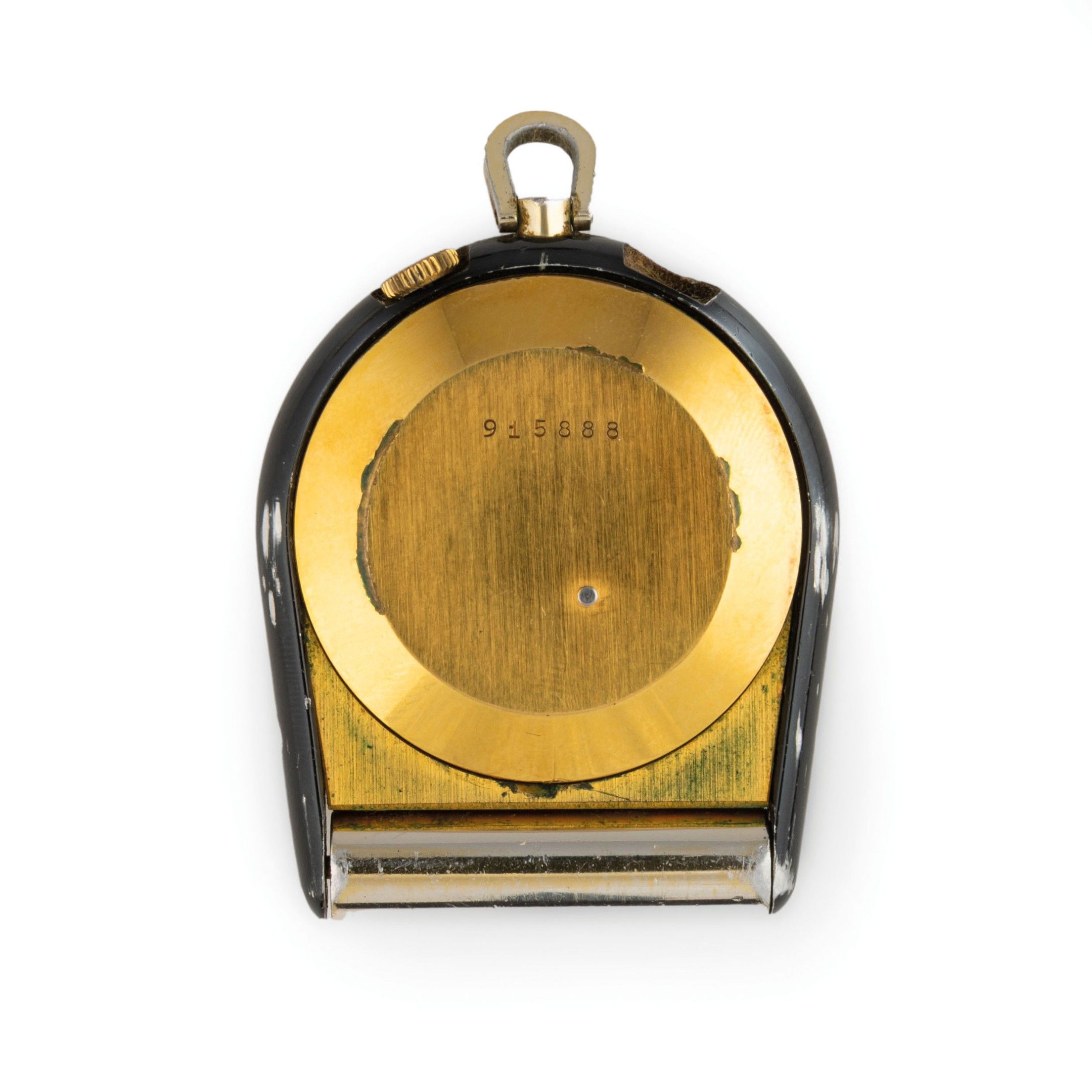 gilded and enamelled metal case measuring 45 x 37 mm, watch that can be made into a pocket watch or stand-up watch by turning the front door. Silvered metal dial, gilded hands with centre seconds, sector alarm hand, mechanical hand-wound movement. Non-functioning watch requiring servicing.