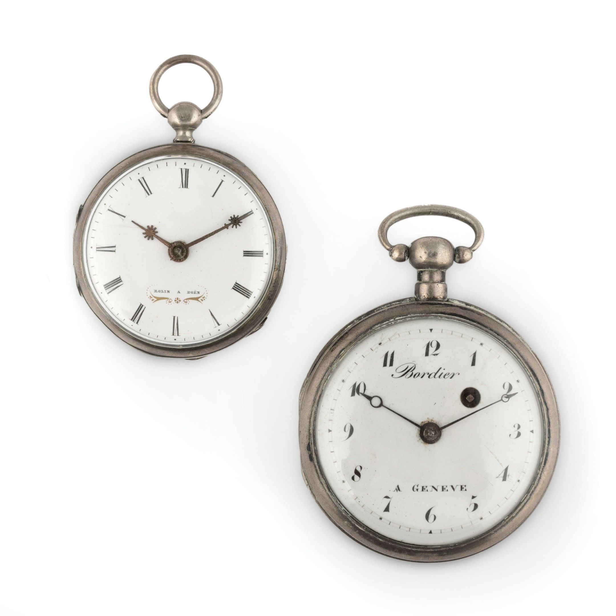 the second: silver case diameter 53 mm, white dial with Arabic numerals, signed Bordier a Geneve, Lepine hands, movement with verge escapement and protected by a snap-on dust cover. Watch currently in working order, without winding key.