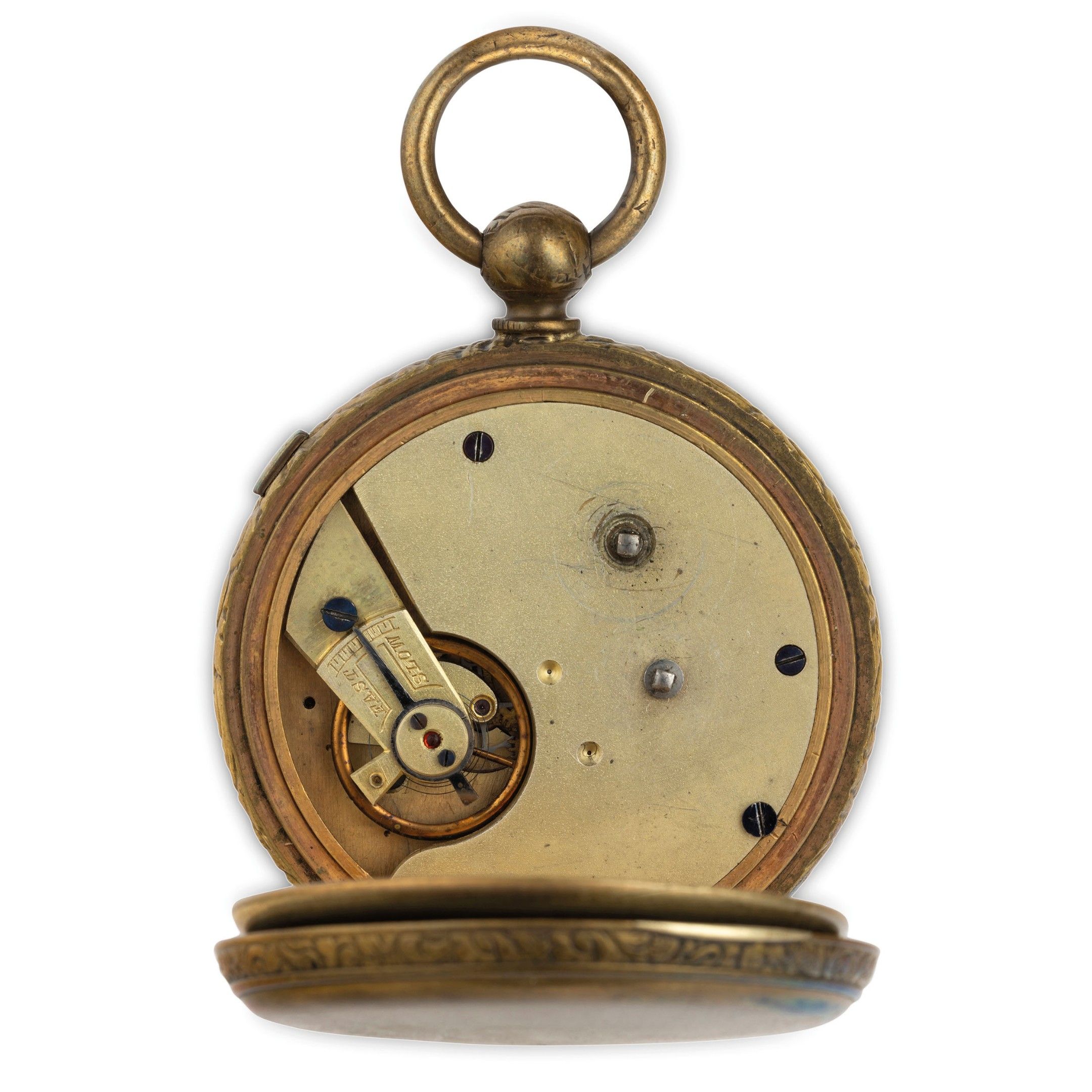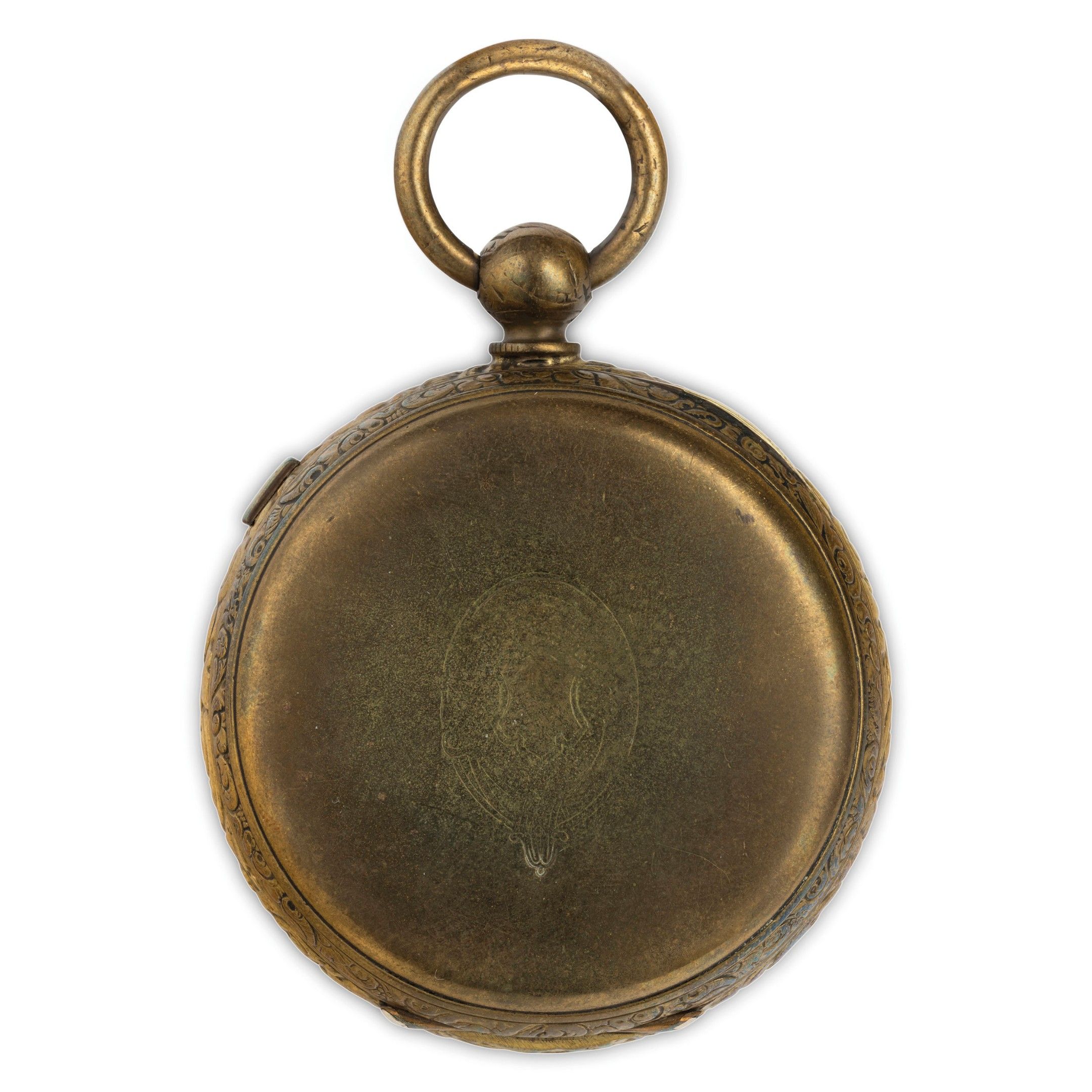 gilt metal case 56 mm diameter, carrure finely decorated, smooth case back with shield in centre, white enamel dial with Roman numerals, 300 scale for timekeeping, brass pear hands for hours, hand in centre, movement with cylinder escapement, key winding, watch to be overhauled (very dirty and dry) key absent