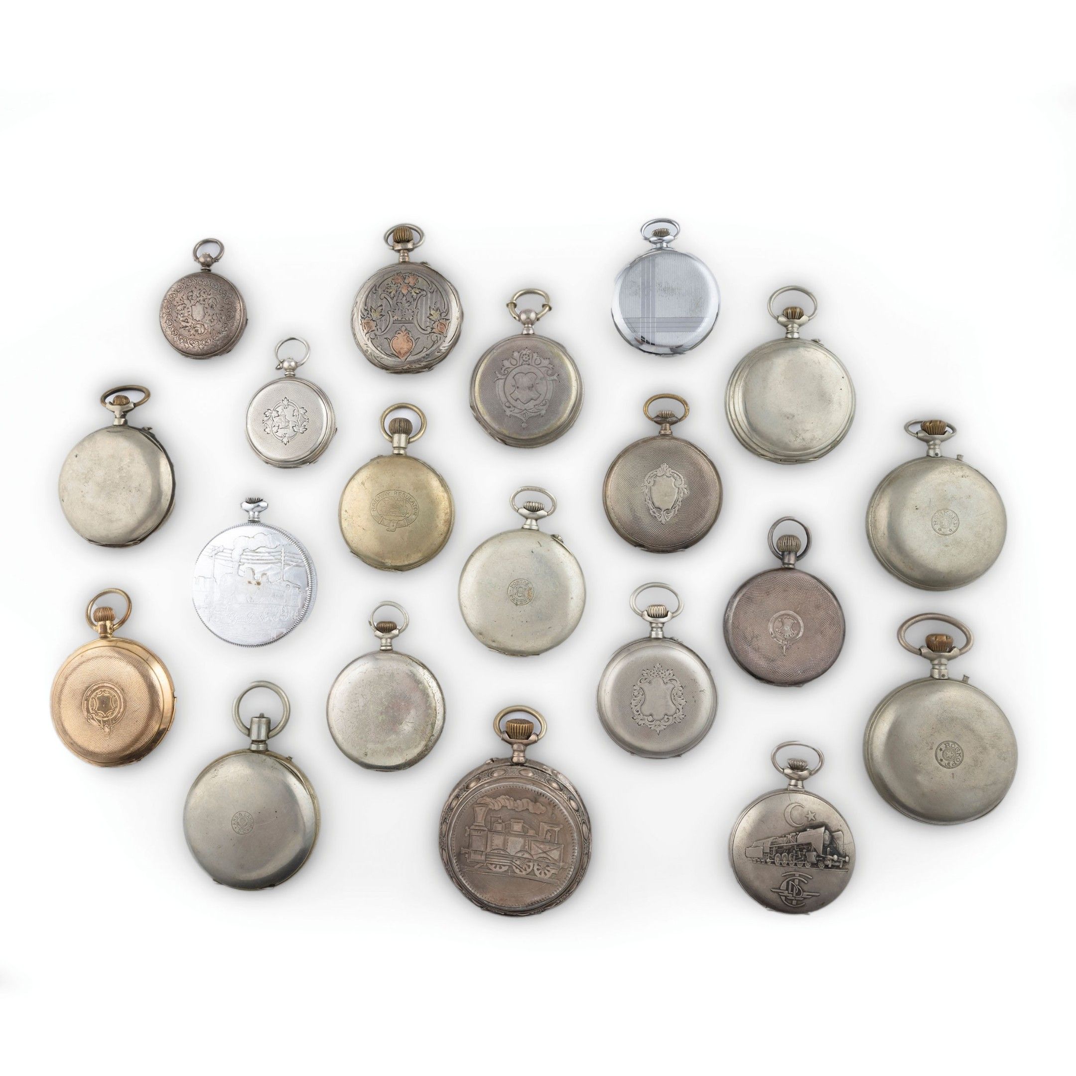 Large lot consisting of 20 pocket watches, different eras, styles and materials. Some are in working order, others in need of repair. Lot not subject to possible return.