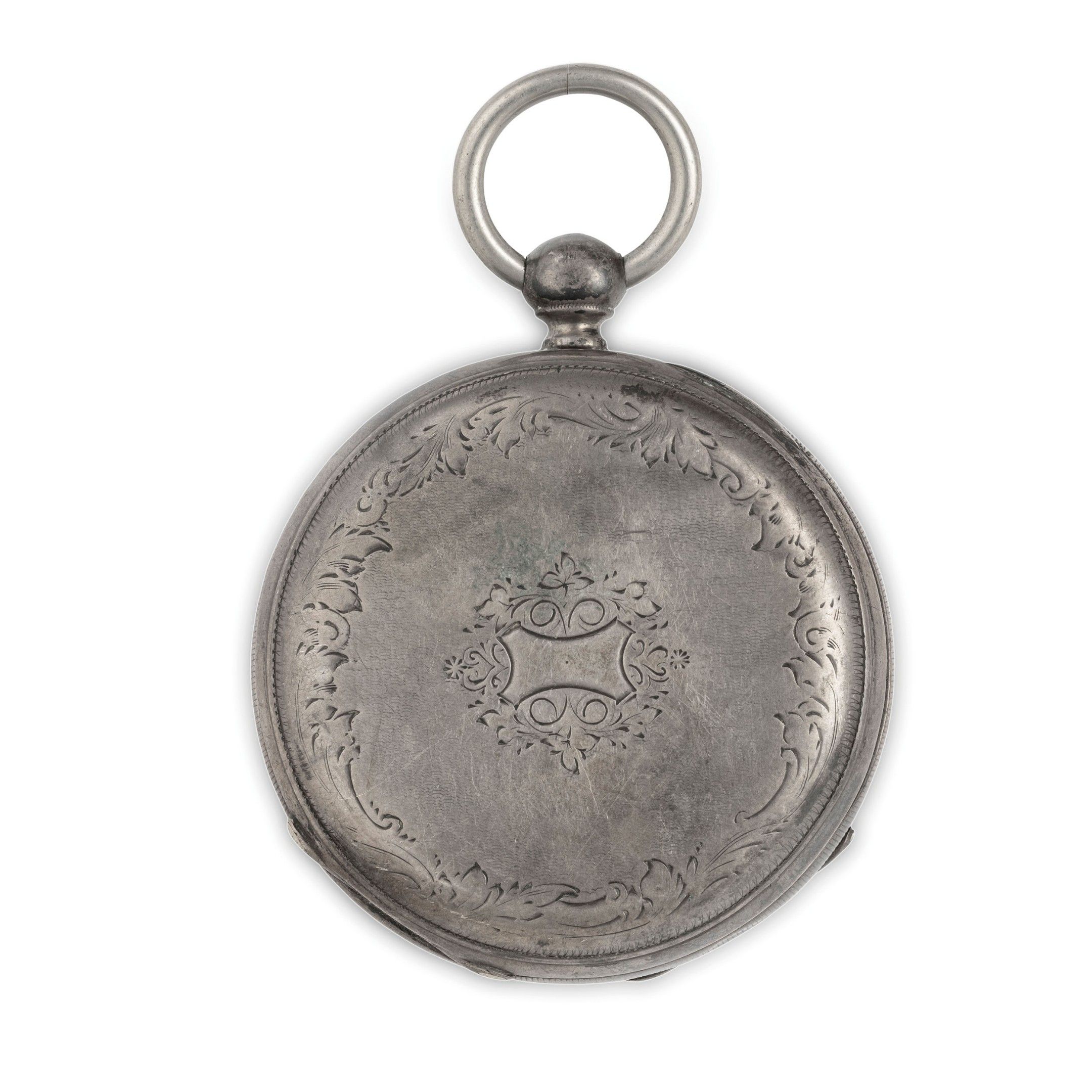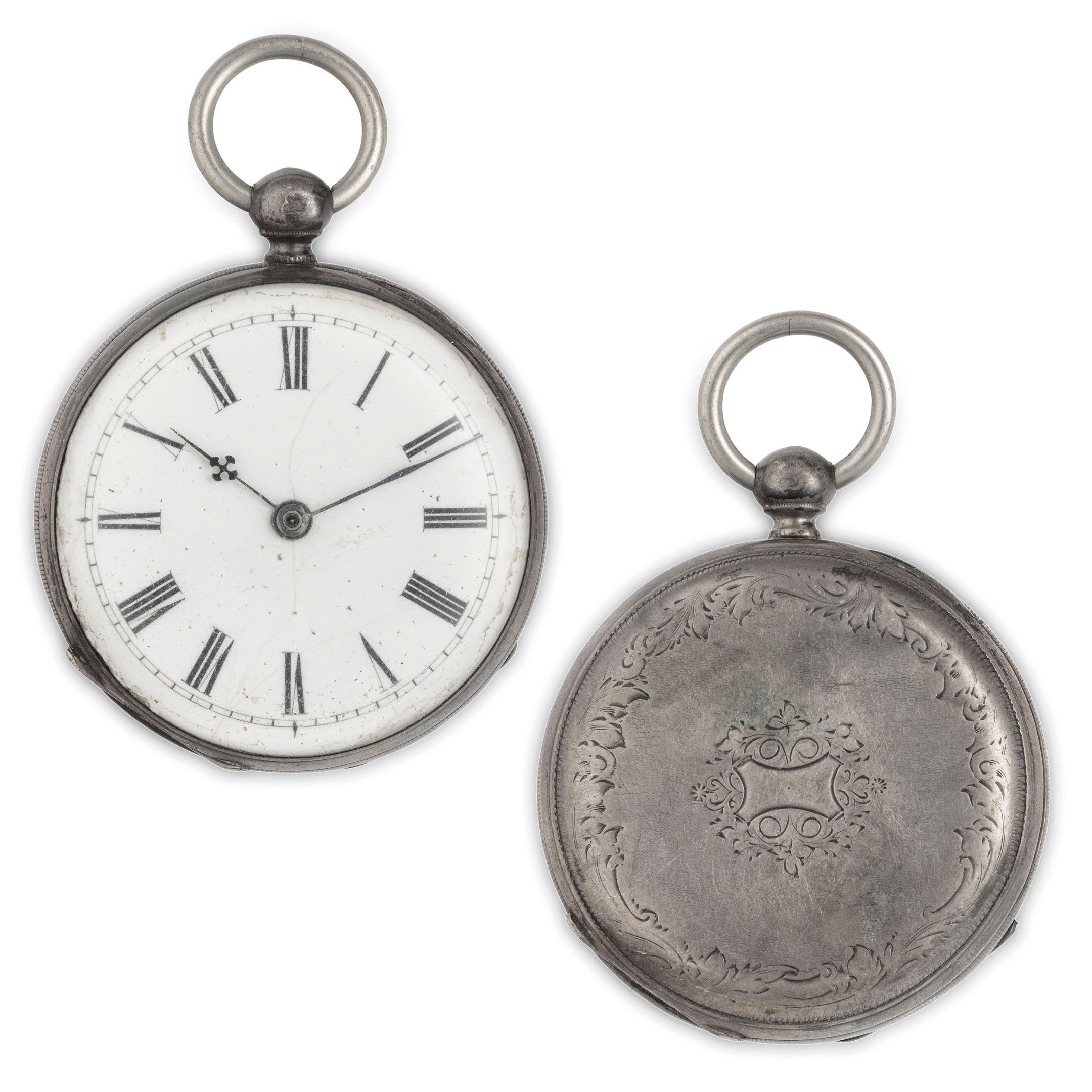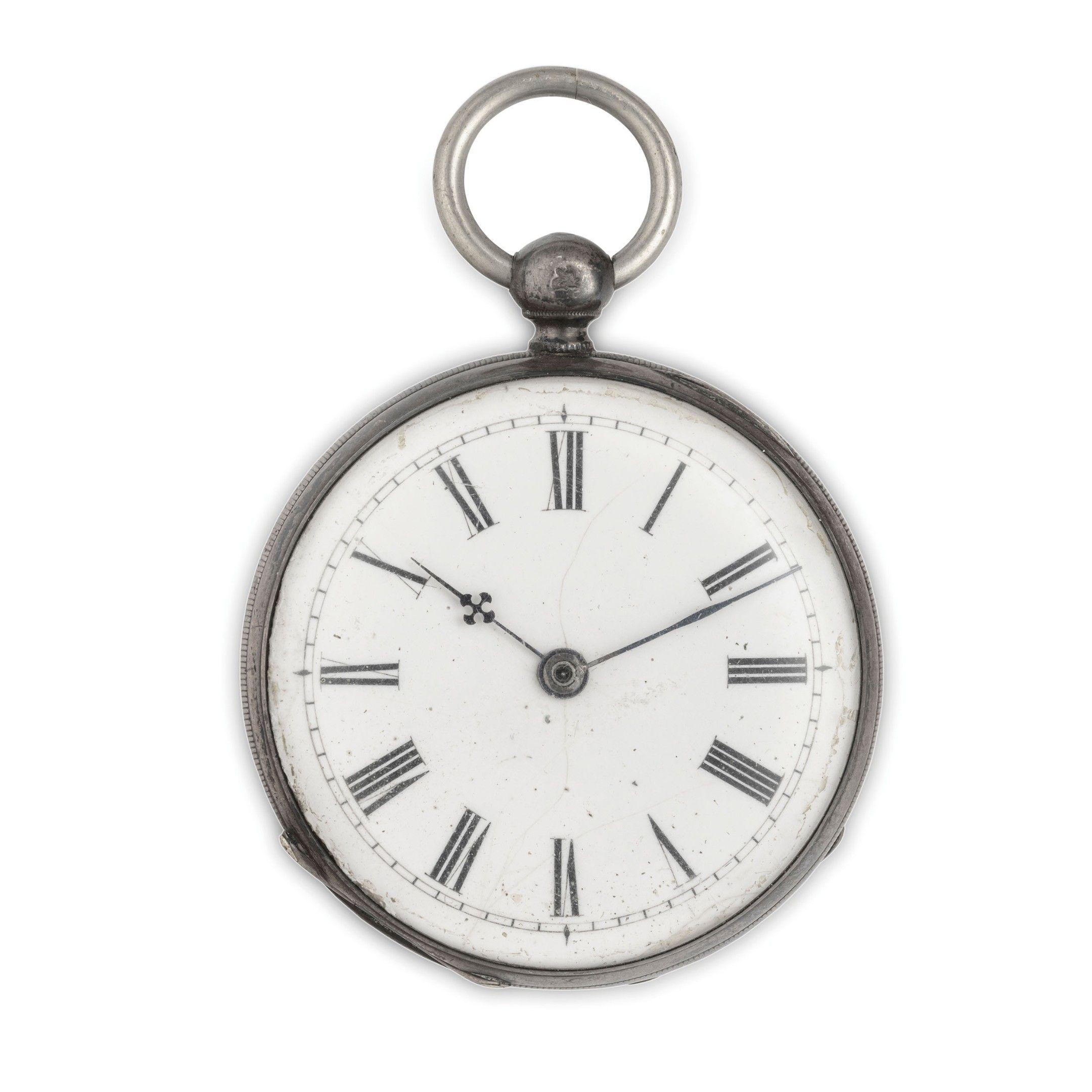 silver case diameter 48 mm, decorated on the back with floral folders, white enamel dial with Roman numerals, steel hands, seconds hand in the centre missing, movement with Duplex escapement, mechanism not functioning