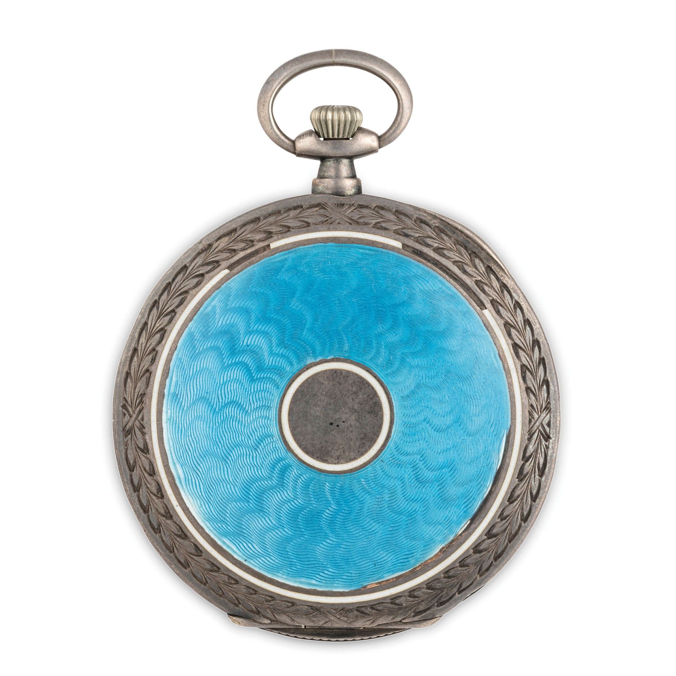 Silver case 47 mm in diameter, decorated on the front with double white enamel border and laurel leaves, on the back a large central medallion in translucent blue enamel on a guilloché background and white champlevé enamel border. Silvered band dial, on gilt base, with Arabic numerals, small seconds at six o'clock, pear-shaped hands, movement with Swiss anchor escapement. Watch currently in working order.