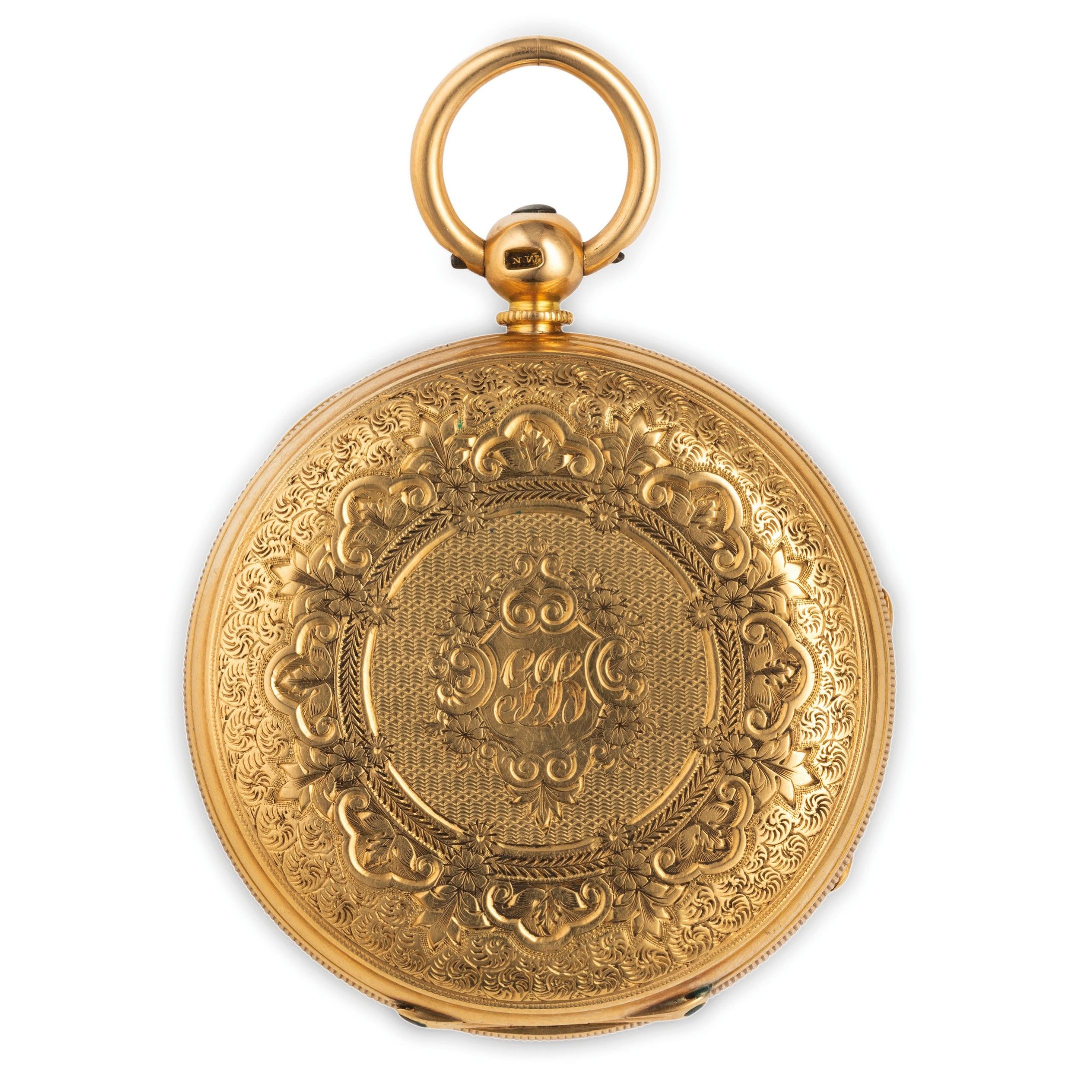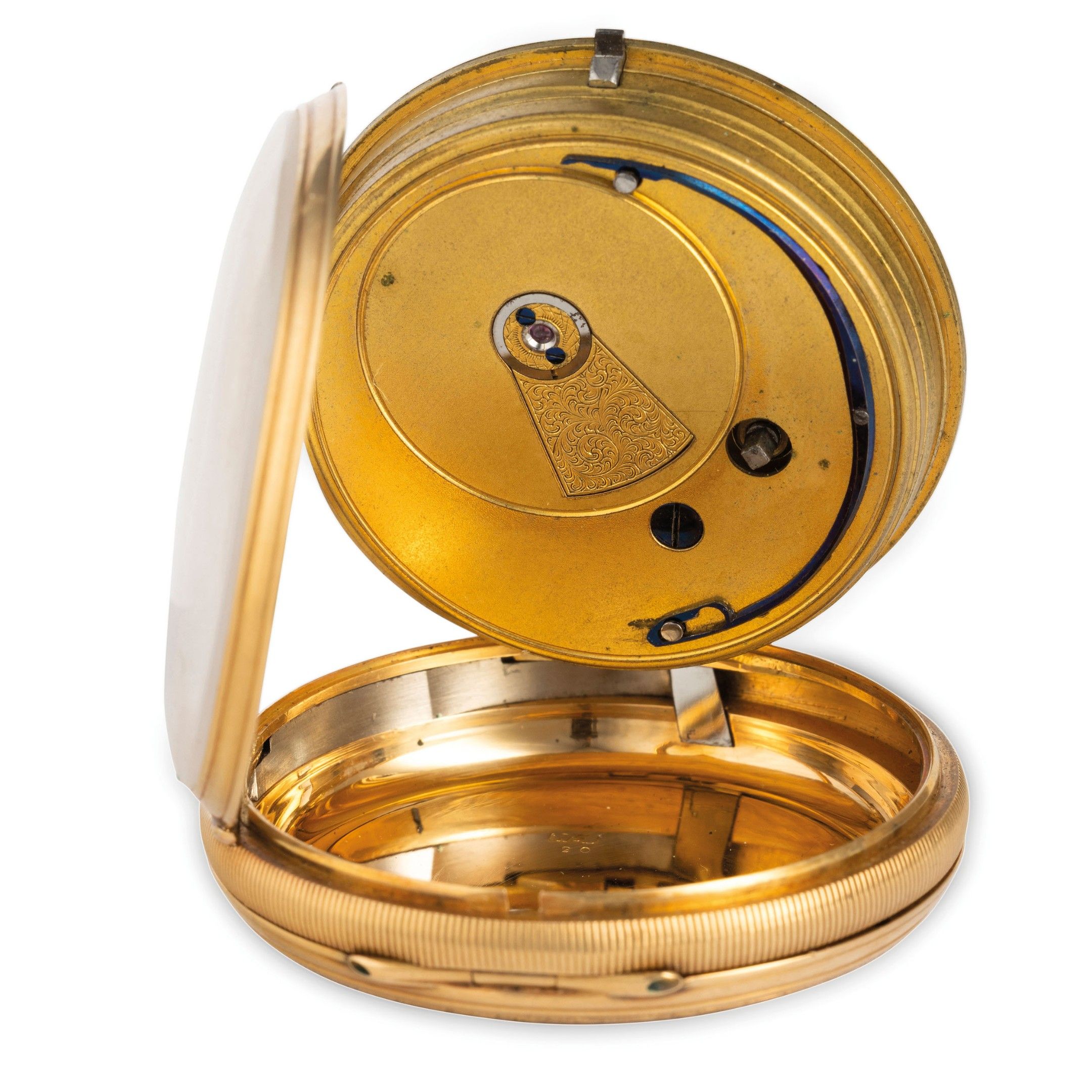 18K gold case, diameter 43 mm, gold dial, painted Roman numerals, large floral design in centre, pear-shaped steel hands, finely decorated case back, snap-in case back opening, spindle movement. Watch to be serviced, only dirty. Watch comes with pouch and winding key. Weight 74 g
