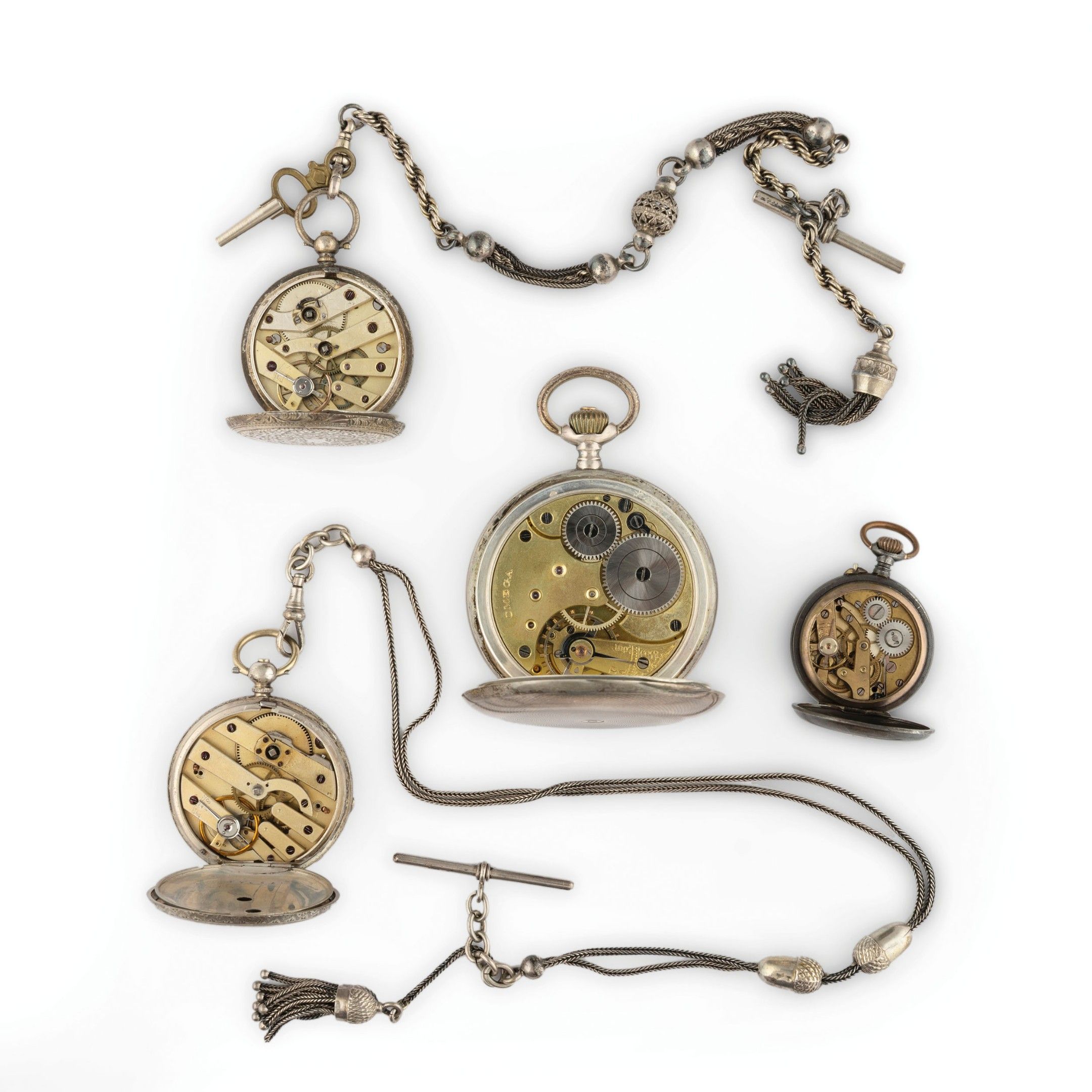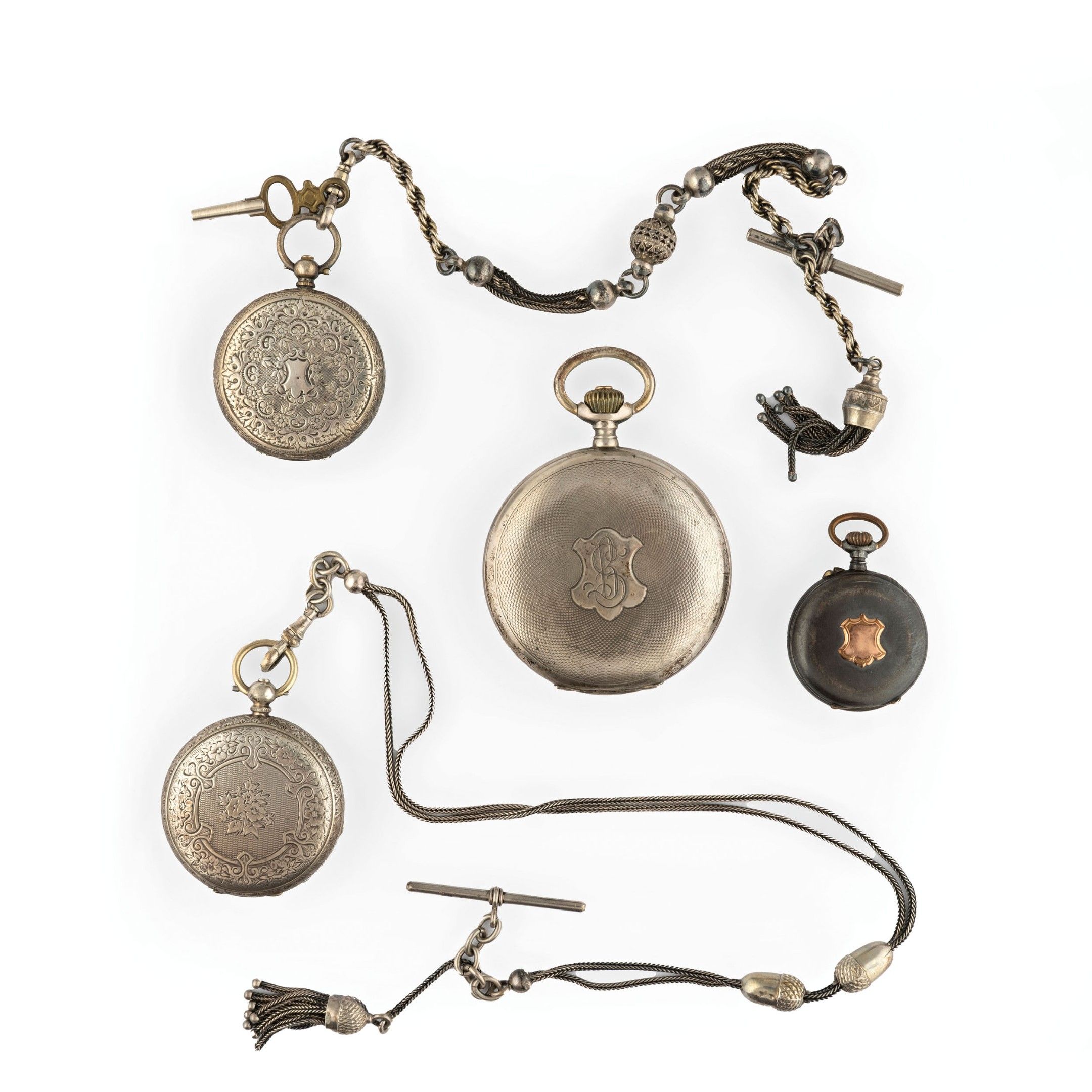 LOT OF FOUR POCKET WATCHES AND TWO SILVER CHAINS, SWITZERLAND CIRCA 1870-1920