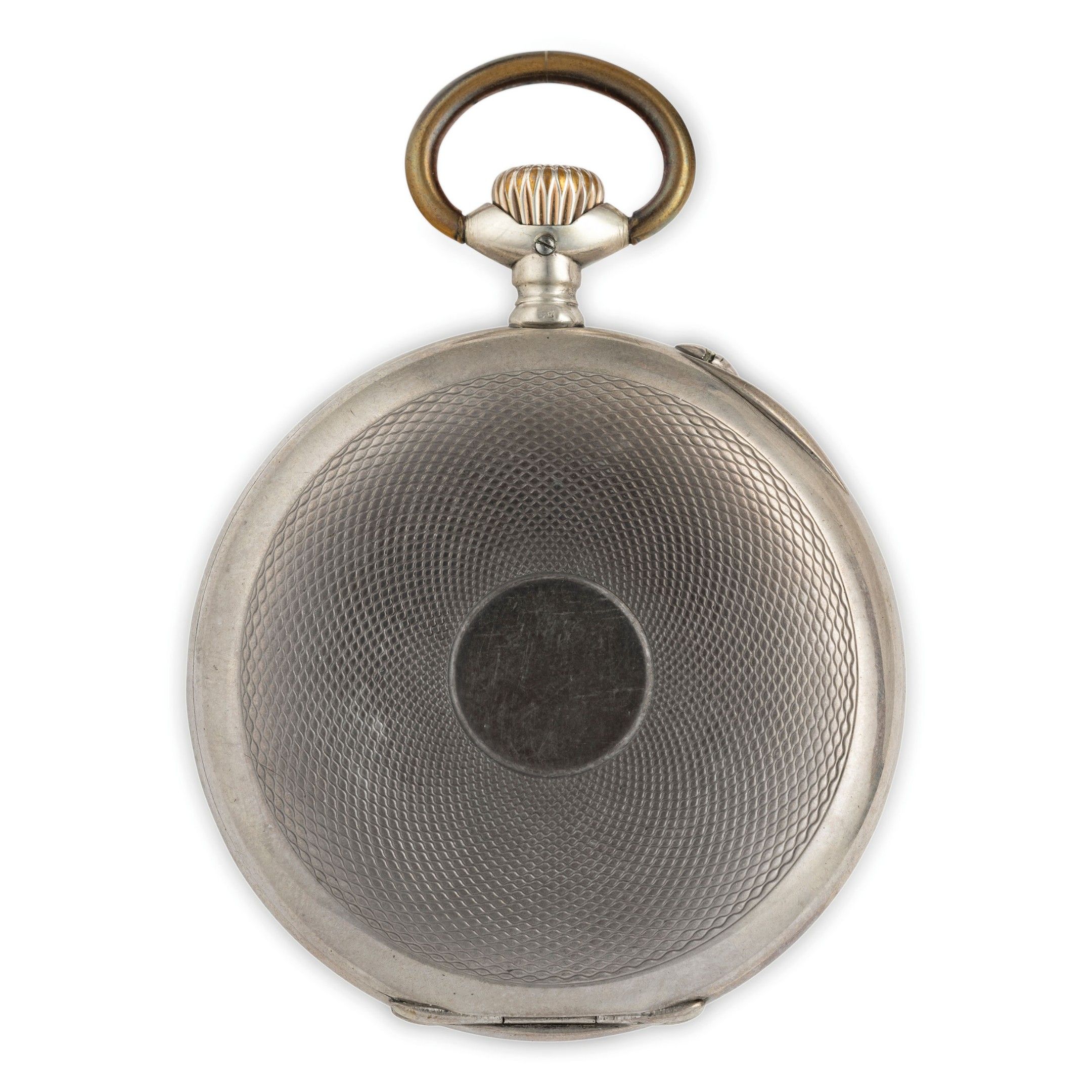 silver case diameter 51 mm, hallmark 800, guilloché case back, white enamel dial with Roman numerals, signed, gold hands, small seconds at six o'clock, signed dust cover, gilded movement serial number 585.xxx, gilded movement, rubies mounted on bezel, swan-neck micrometric adjustment. Watch to be serviced.