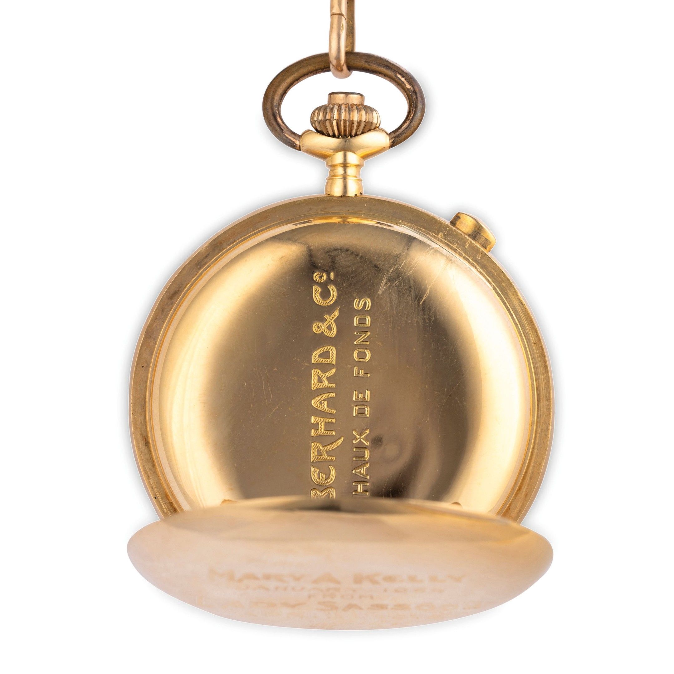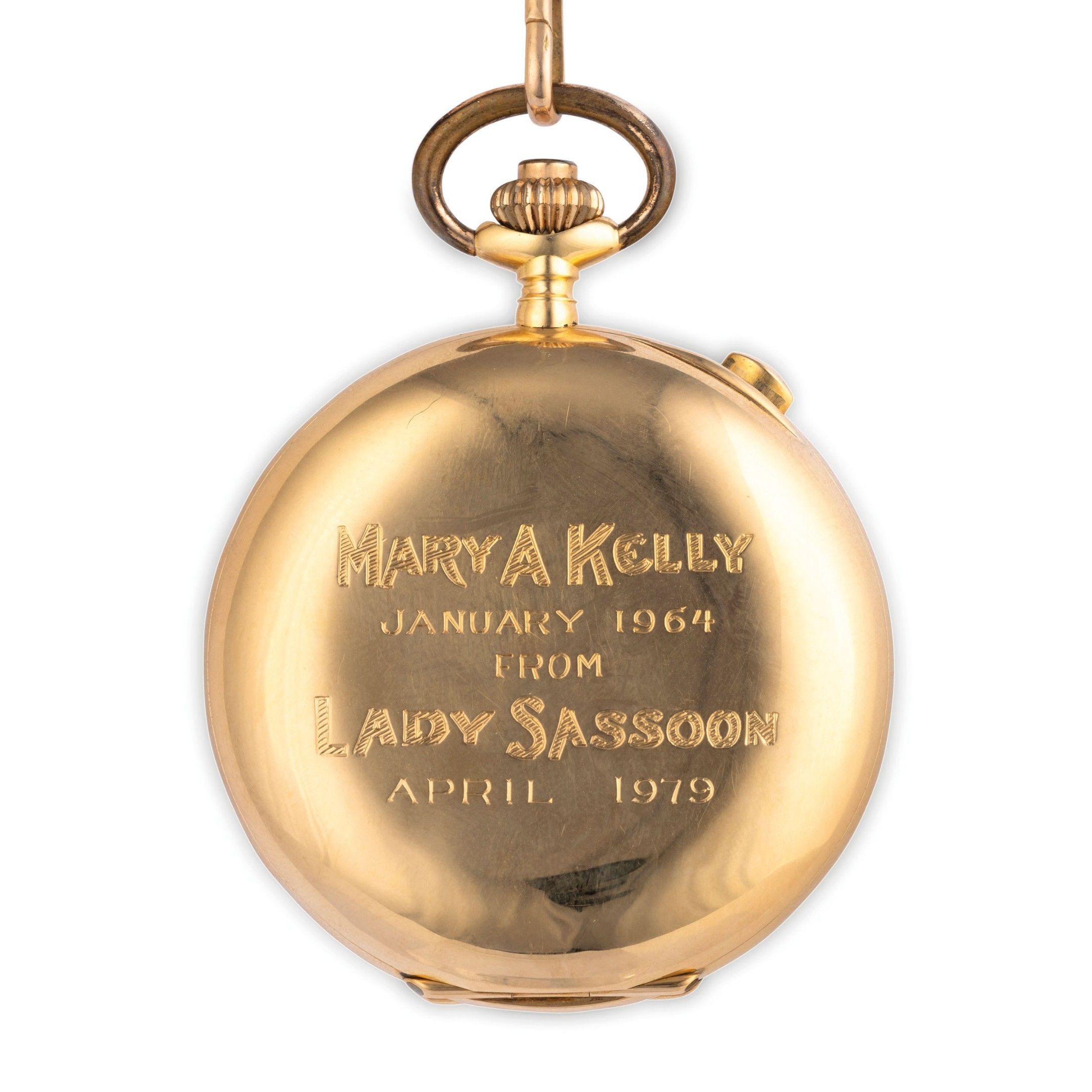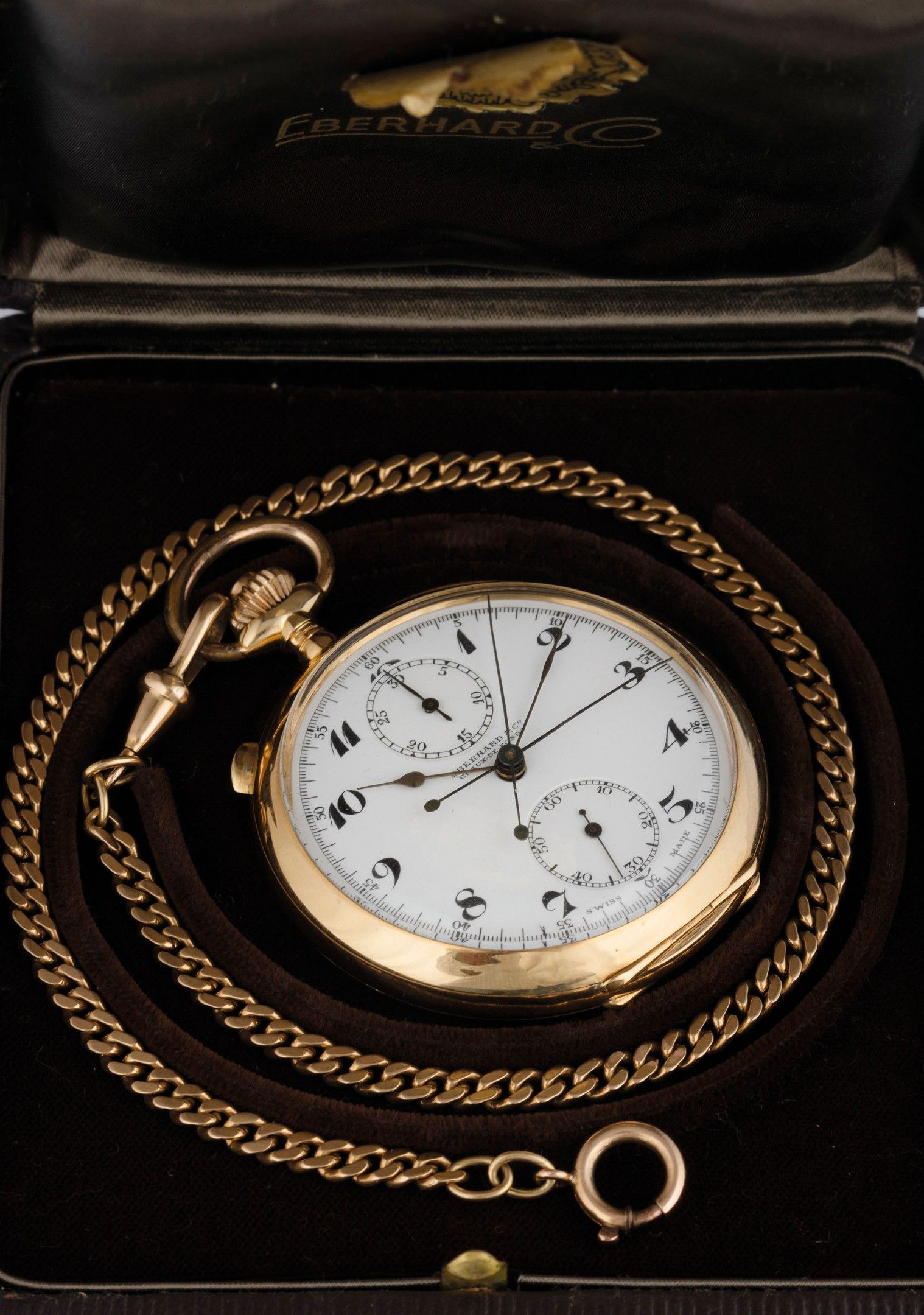 yellow gold case 51 mm in diameter, white enamel dial with Arabic numerals, gilded pear-shaped hands, ratrapping seconds hands in the centre, small seconds at six o'clock, minute counter at 12 o'clock, smooth case back with dedication 'Mary A Kelly January 1964 from Lady Sassoon apri 1979'. case back signed Eberhard, high manufacture rhodium-plated movement, with chronograph and split seconds functions. Watch currently in working order, accompanied by original Eberhard box and gold chain 36 cm long. Watch weight 88.79 g, chain weight 22 g.