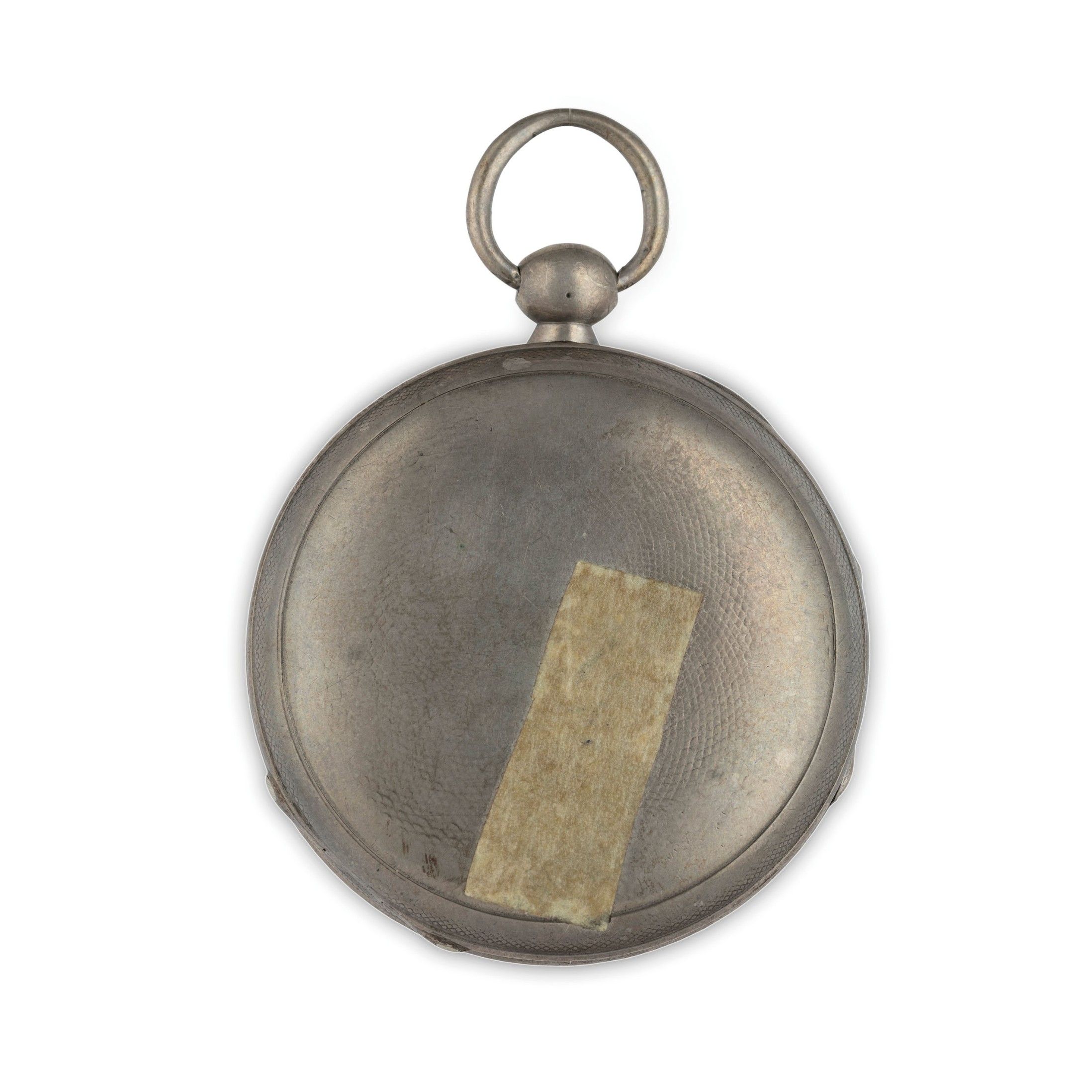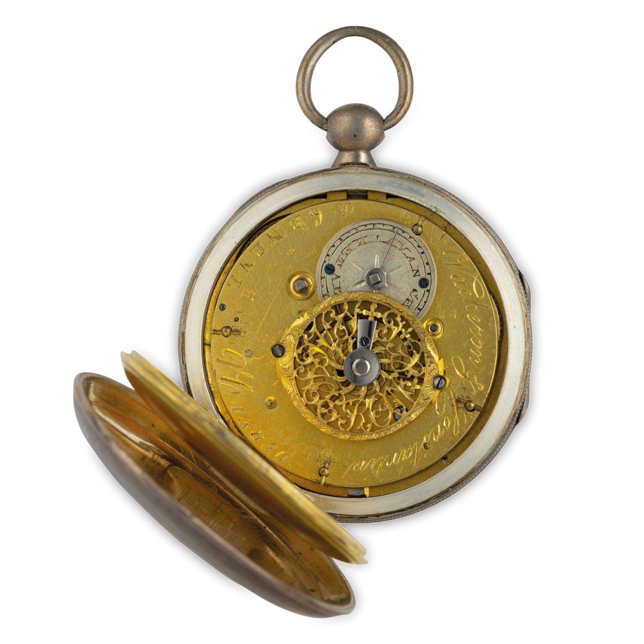 silver case diameter 43 mm, white enamel dial with Roman numerals, signed at 12 o'clock, gilded brass hand, smooth back, gilded back case, signed, bearing serial no. 45850, signed movement with verge escapement. Watch currently in working order, with modern winding key.