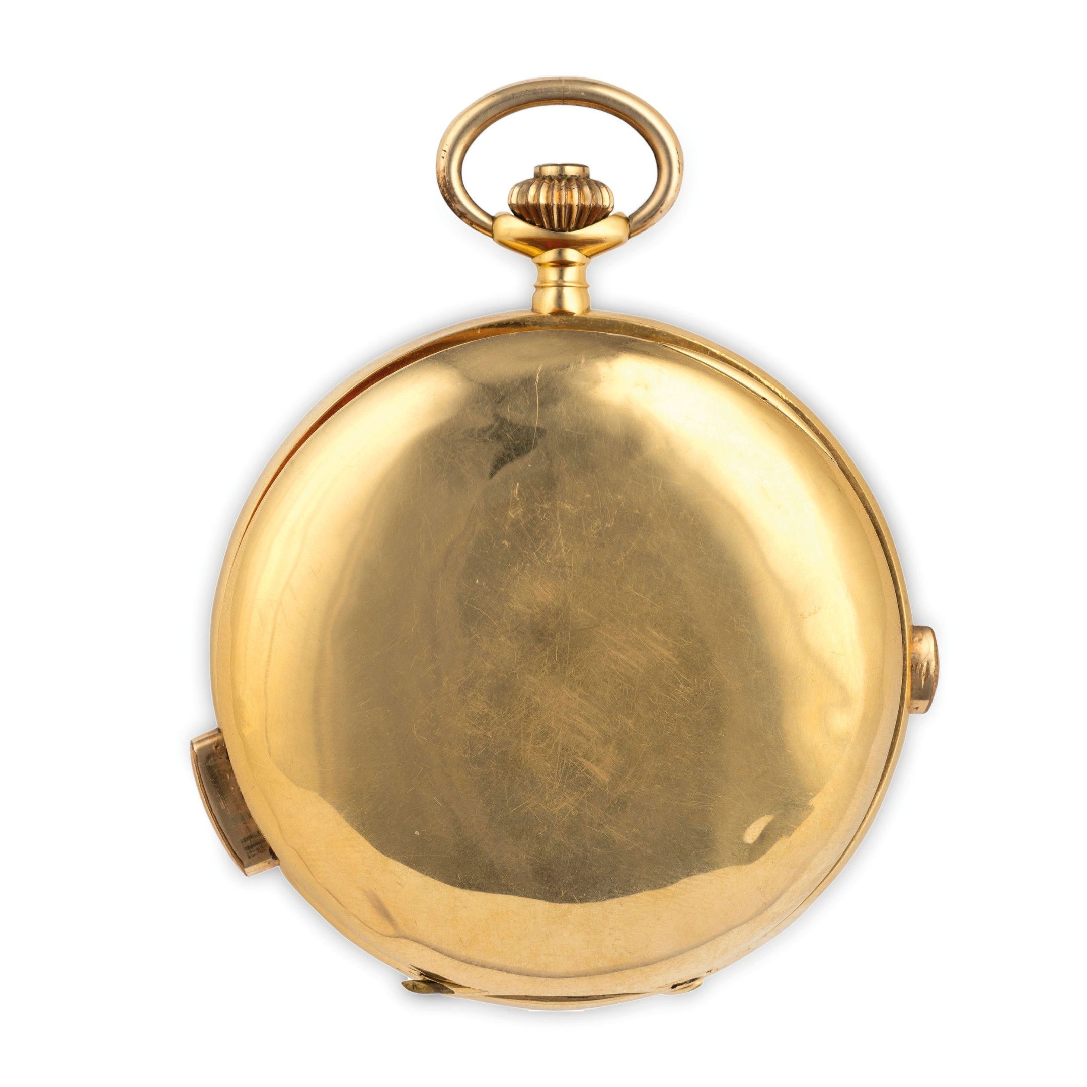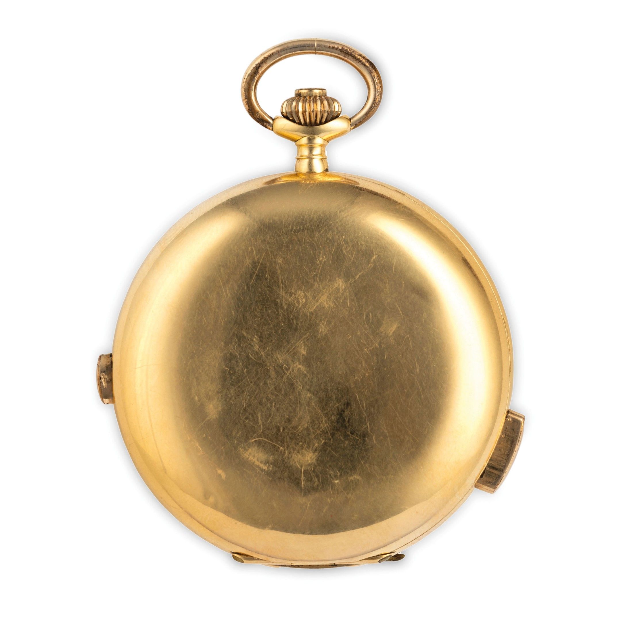gold savonette case, 55 mm diameter, 18K hallmark, plain cover and back, white enamel dial with Arabic numerals, chronometer scale at 300, burnished steel hands, chronometric seconds at centre, small seconds at six o'clock push-piece at 12 o'clock for timekeeping, push-piece at 7 o'clock for striking, claw at 4 o'clock for setting the time, smooth dust cover, nickel-plated movement, signed, decorated with cote de geneve, hour, quarter and minute repeater on gong, flywheel with red gold weights. Watch currently in working order. Weight 103.9 g