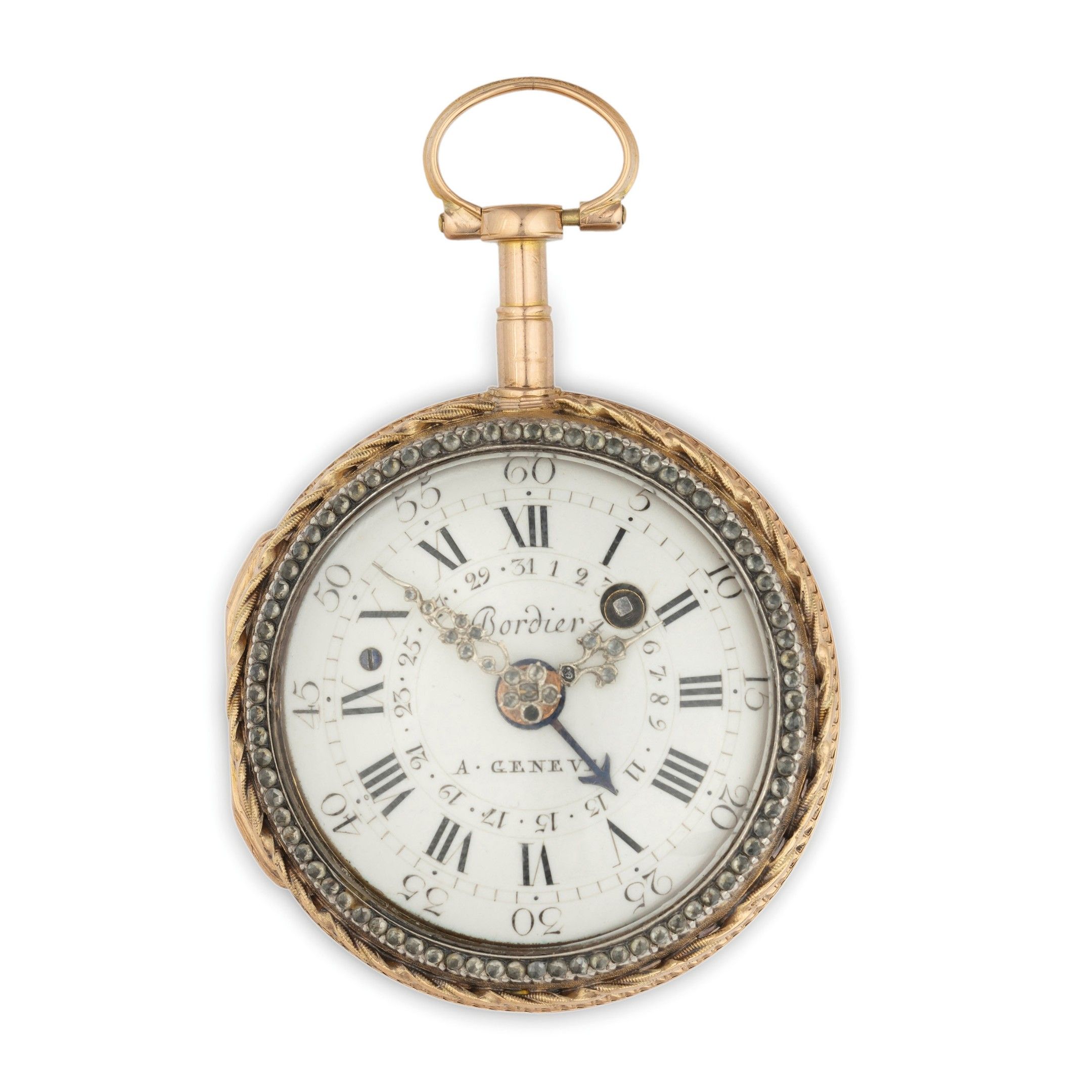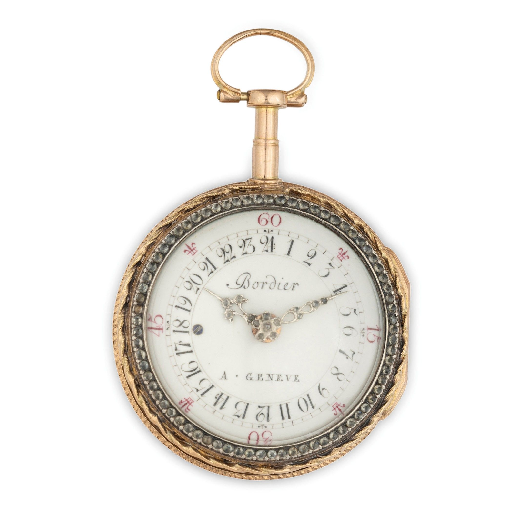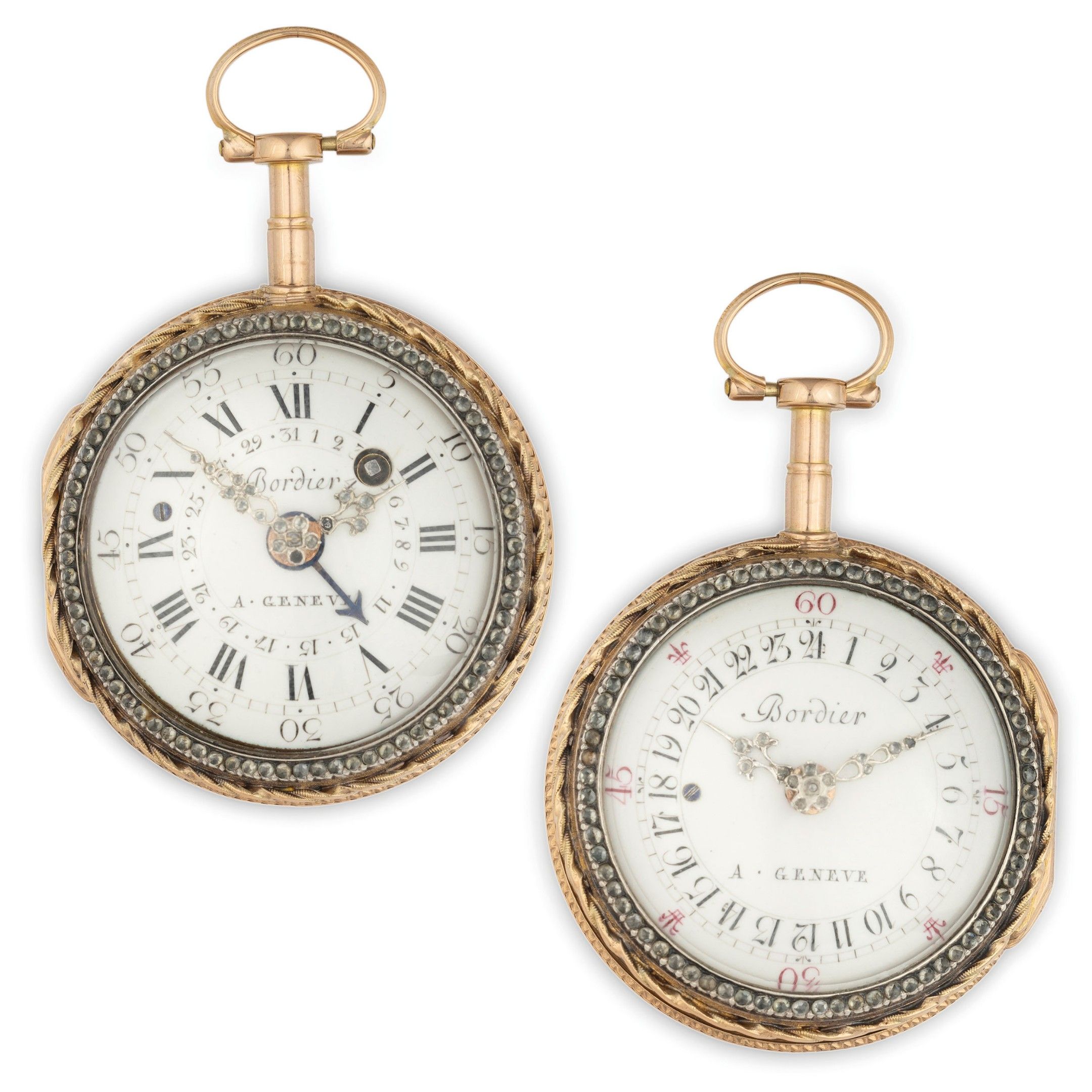 BORDIER A GENEVE, TWO-DIAL 12-24H POCKET WATCH, YELLOW AND WHITE GOLD AND DIAMOND CASE, SWITZERLAND CIRCA 1760